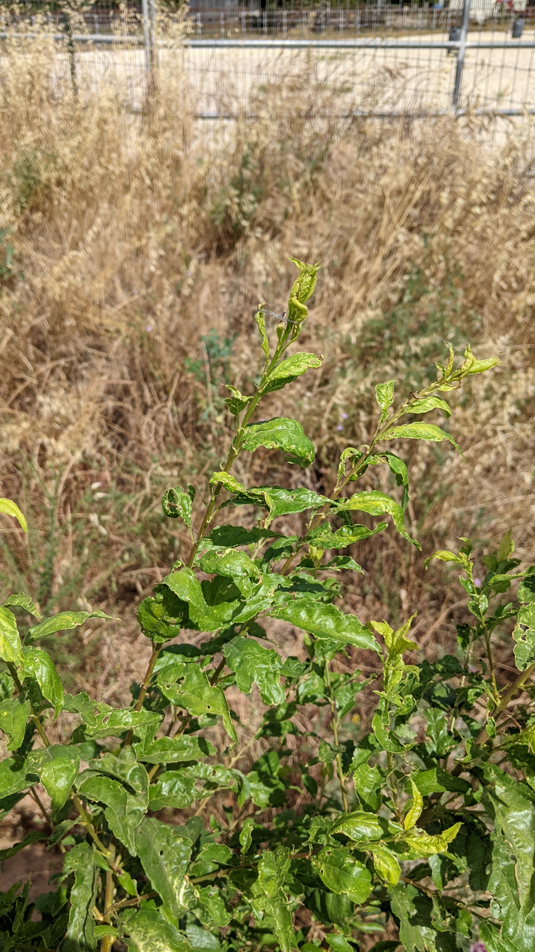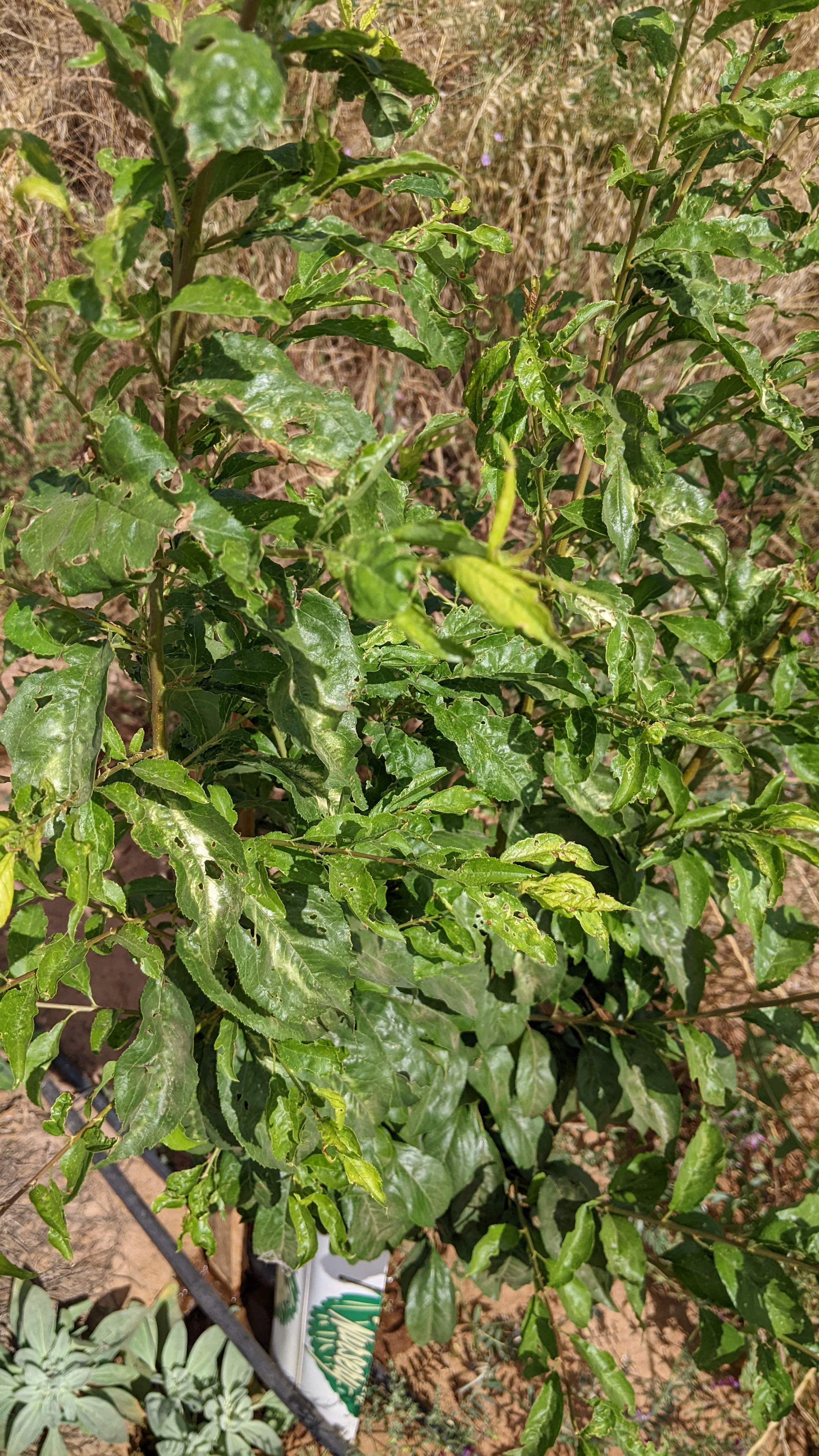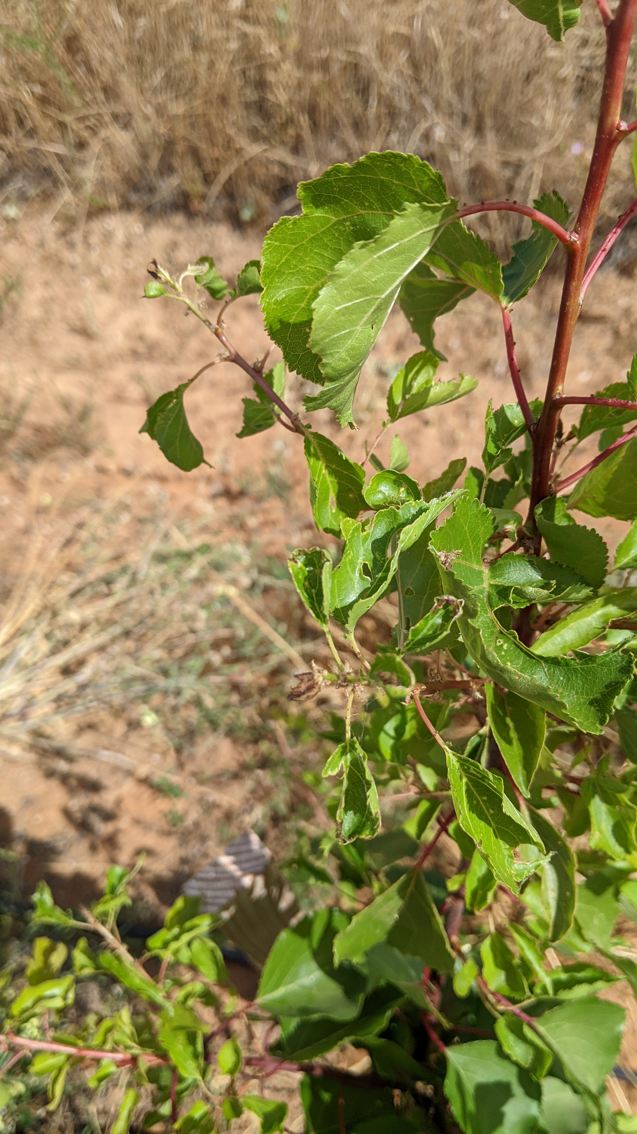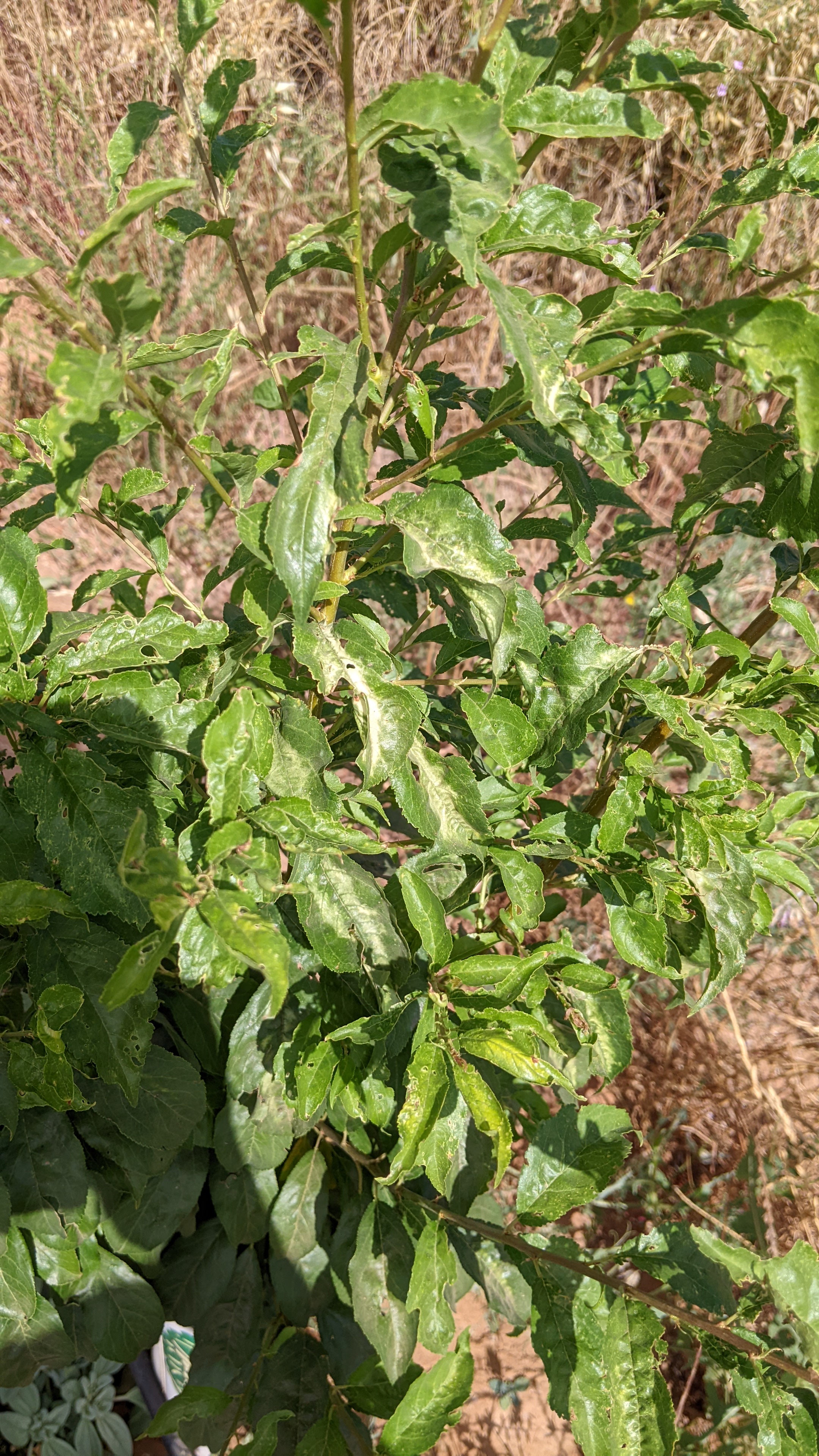 Some of my pluots and apricots are showing curled and deformed leaves. Some of the tips of the branches feel like burnt. Some leaves are also perforated. Is this some sort of disease or herbicide damage? These trees are near the border of our property, close to neighbors.