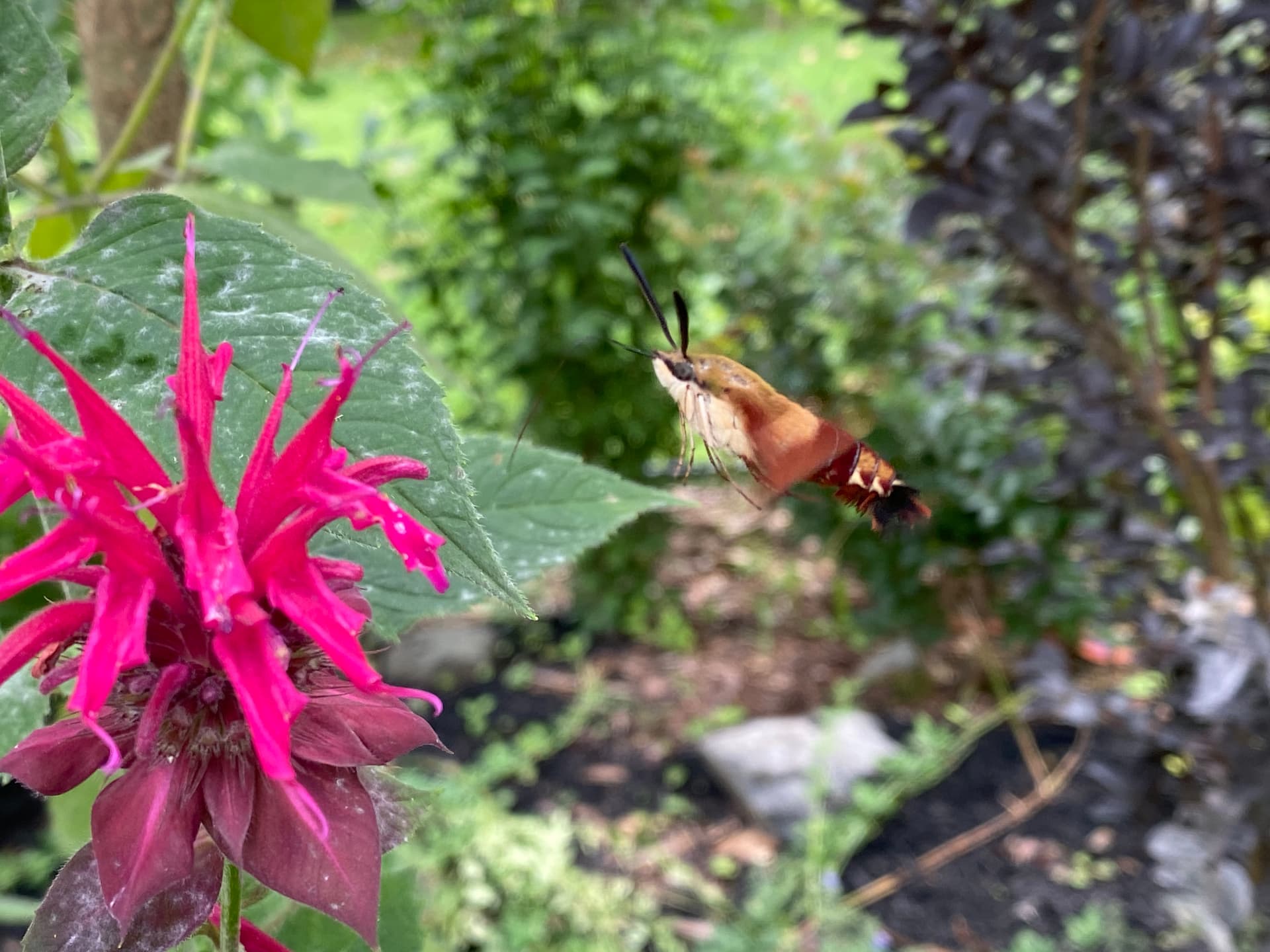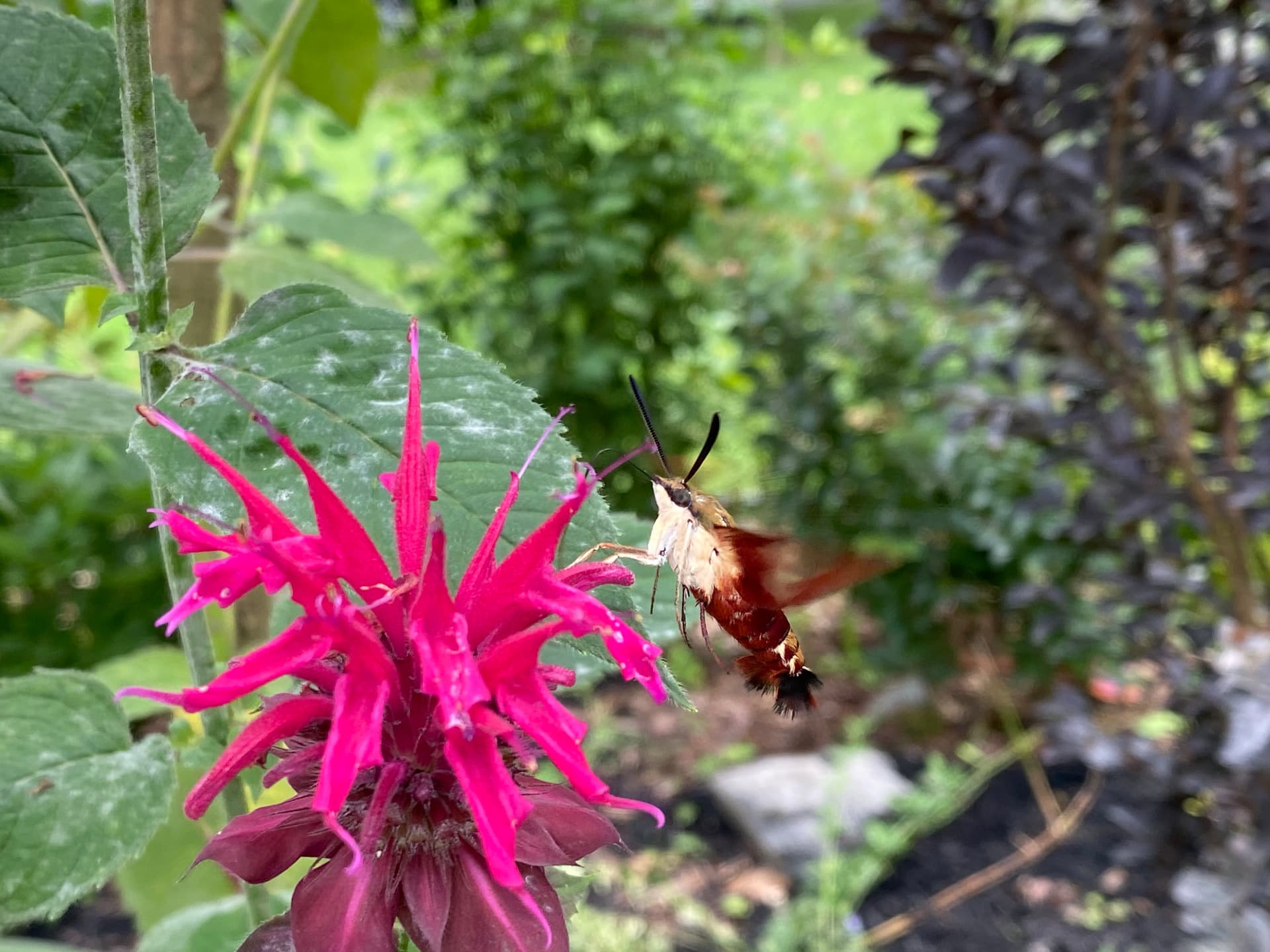I call these hummingbird moths. Very cool little guys, not sure on the larvae damage. We welcome them in our pollinator garden.