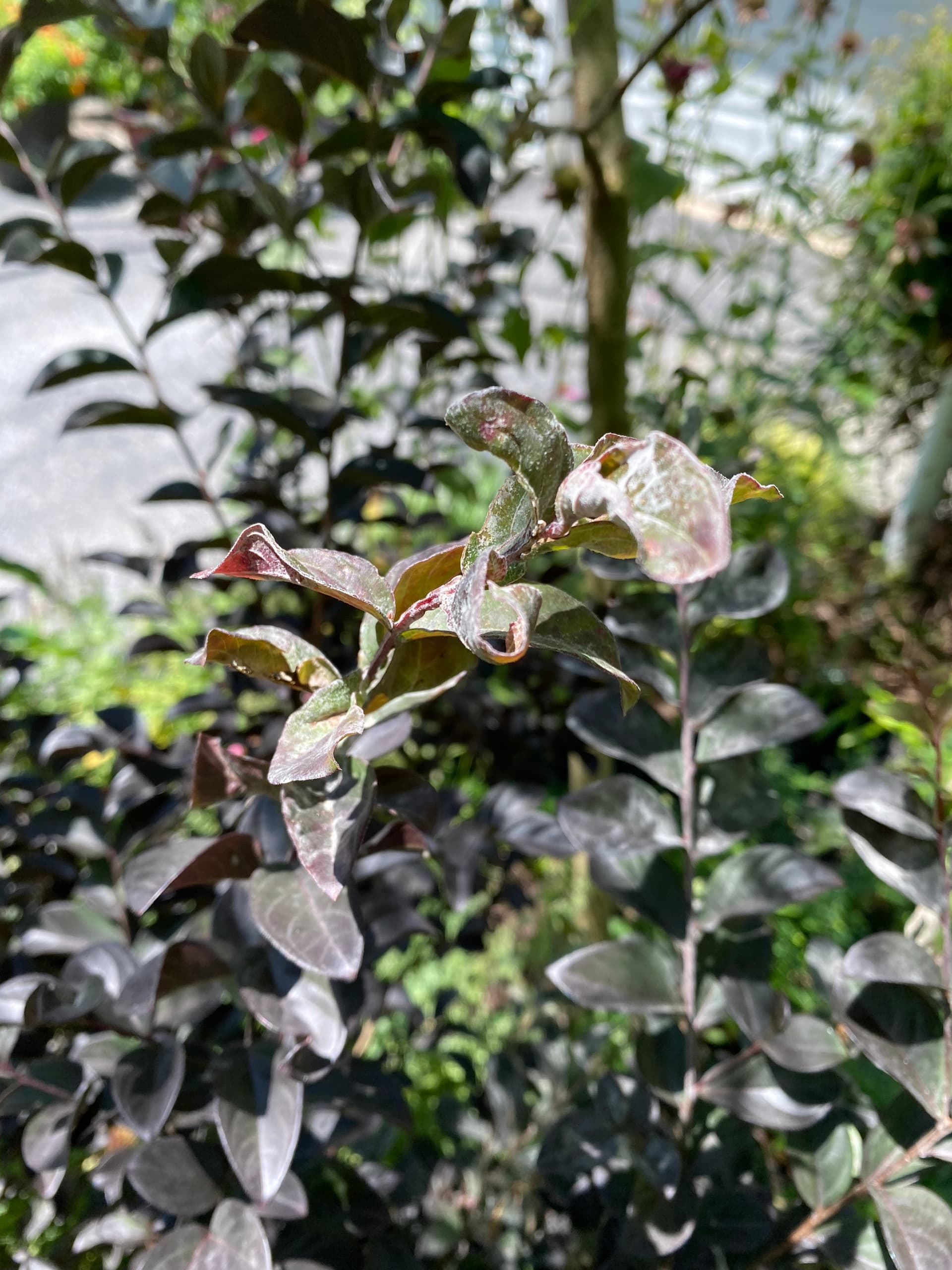 My small, purple leaf crêpe myrtle plant has become infected by something. It looks like a white, fine powder that affects the terminal branches and leaves, and the leaf seem small and a little warped. Is there some kind of fungus? How would one treat it?