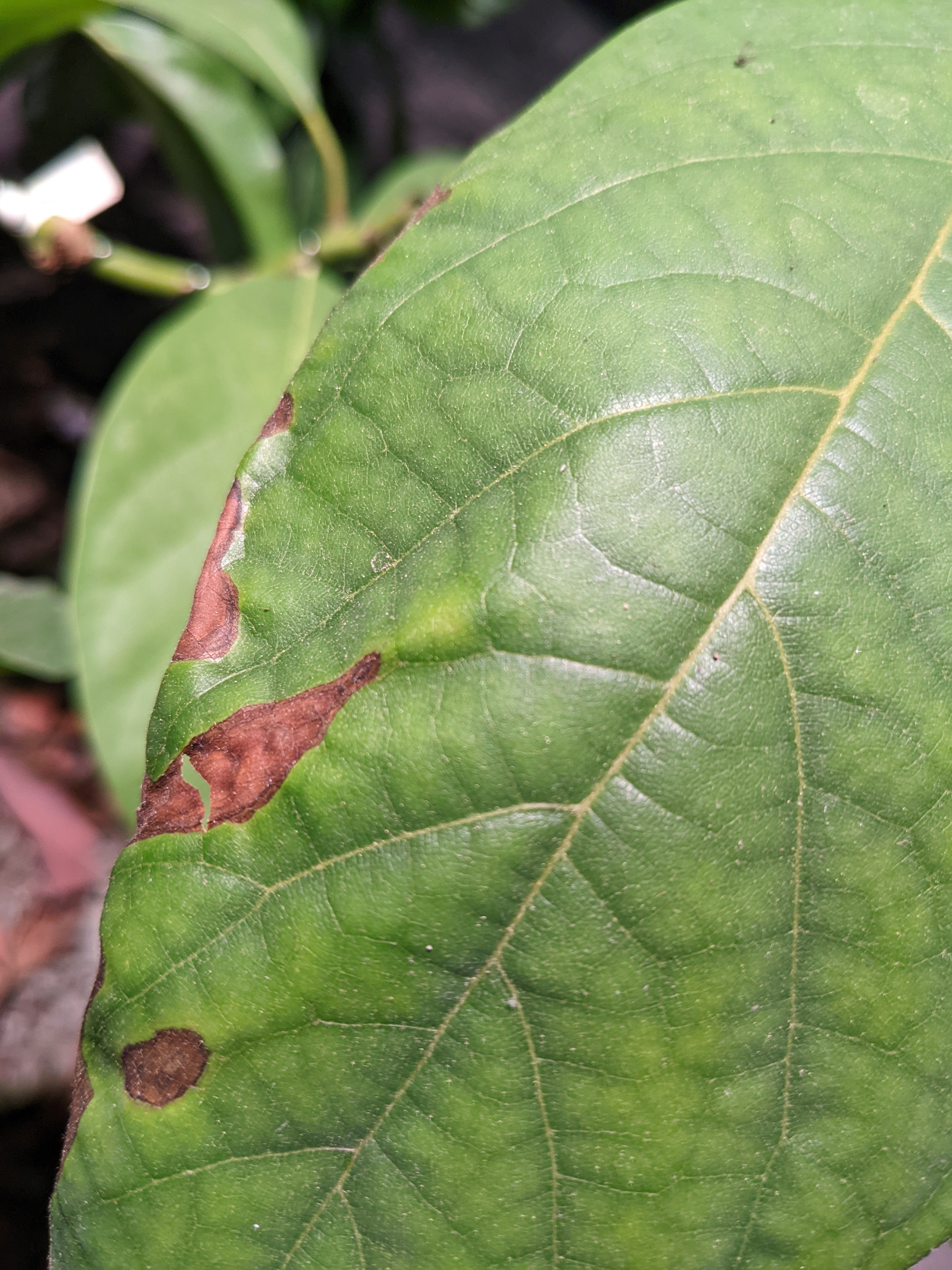 Adding to the leaf spot diagnosis list – does anyone recognize this issue on an avocado? It seems to be only affecting a single graft on a single tree, but about 2/3 of the leaves on that graft show these blobby necrotic patches: