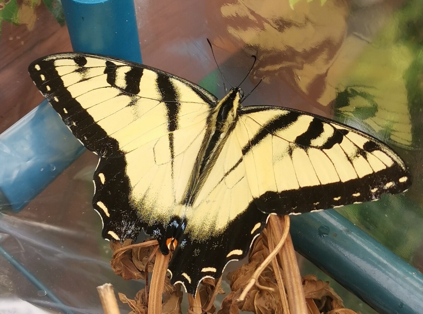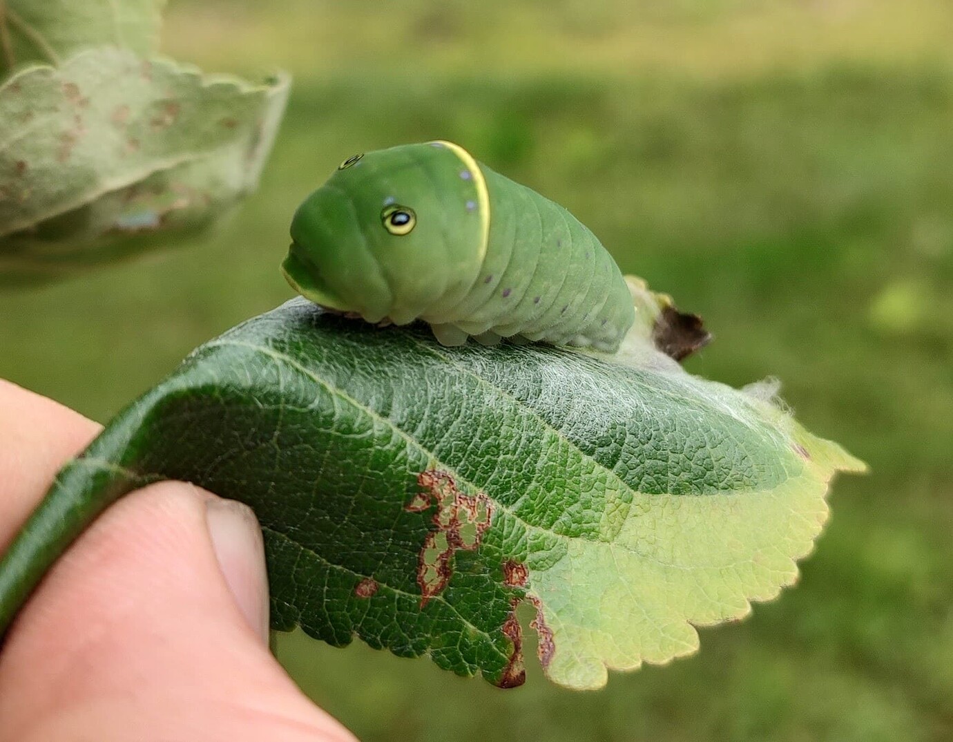Green phase later instar Eastern Tiger Swallowtail caterpillar. Eyespots are on the thorax, near the head.