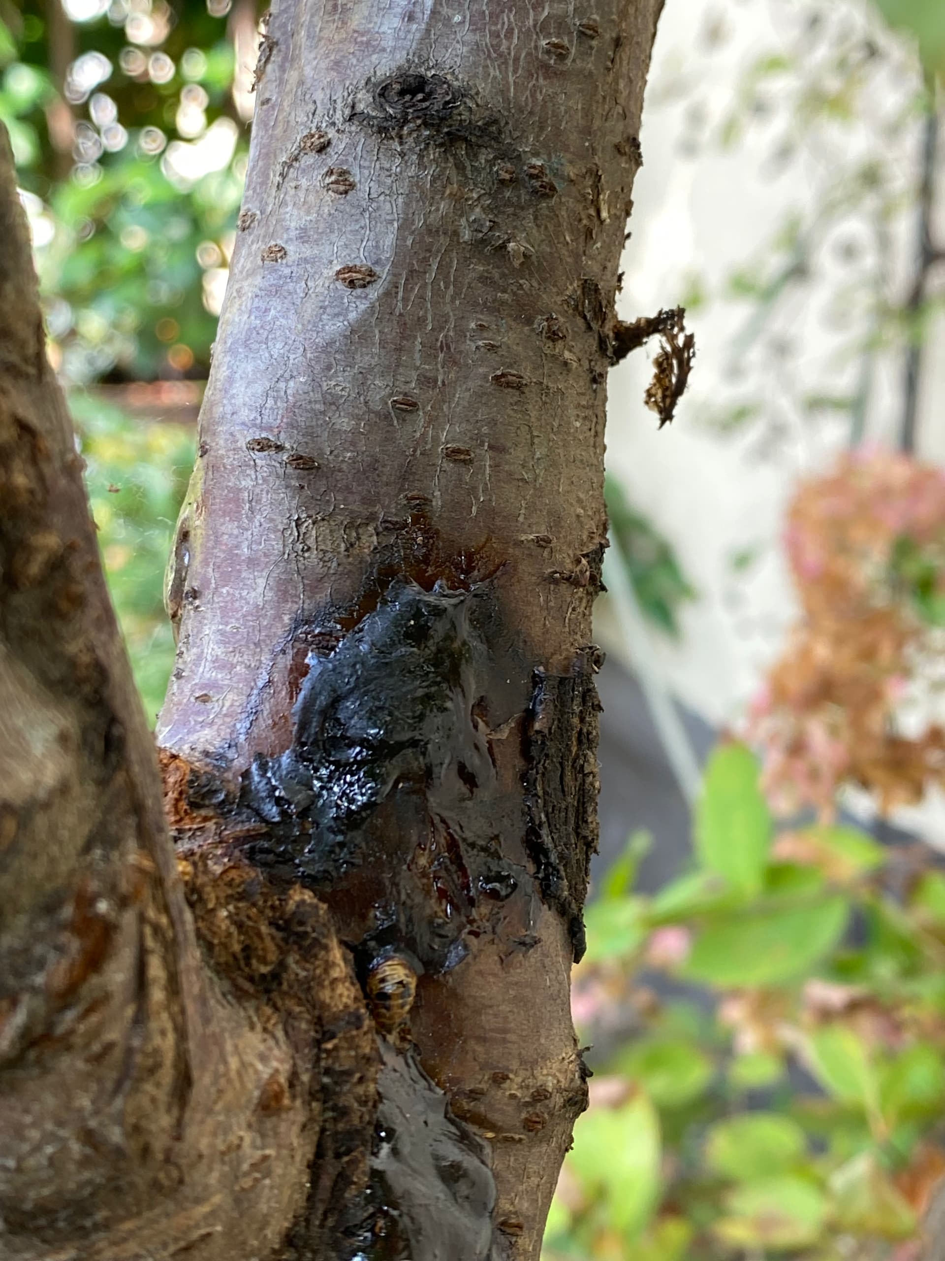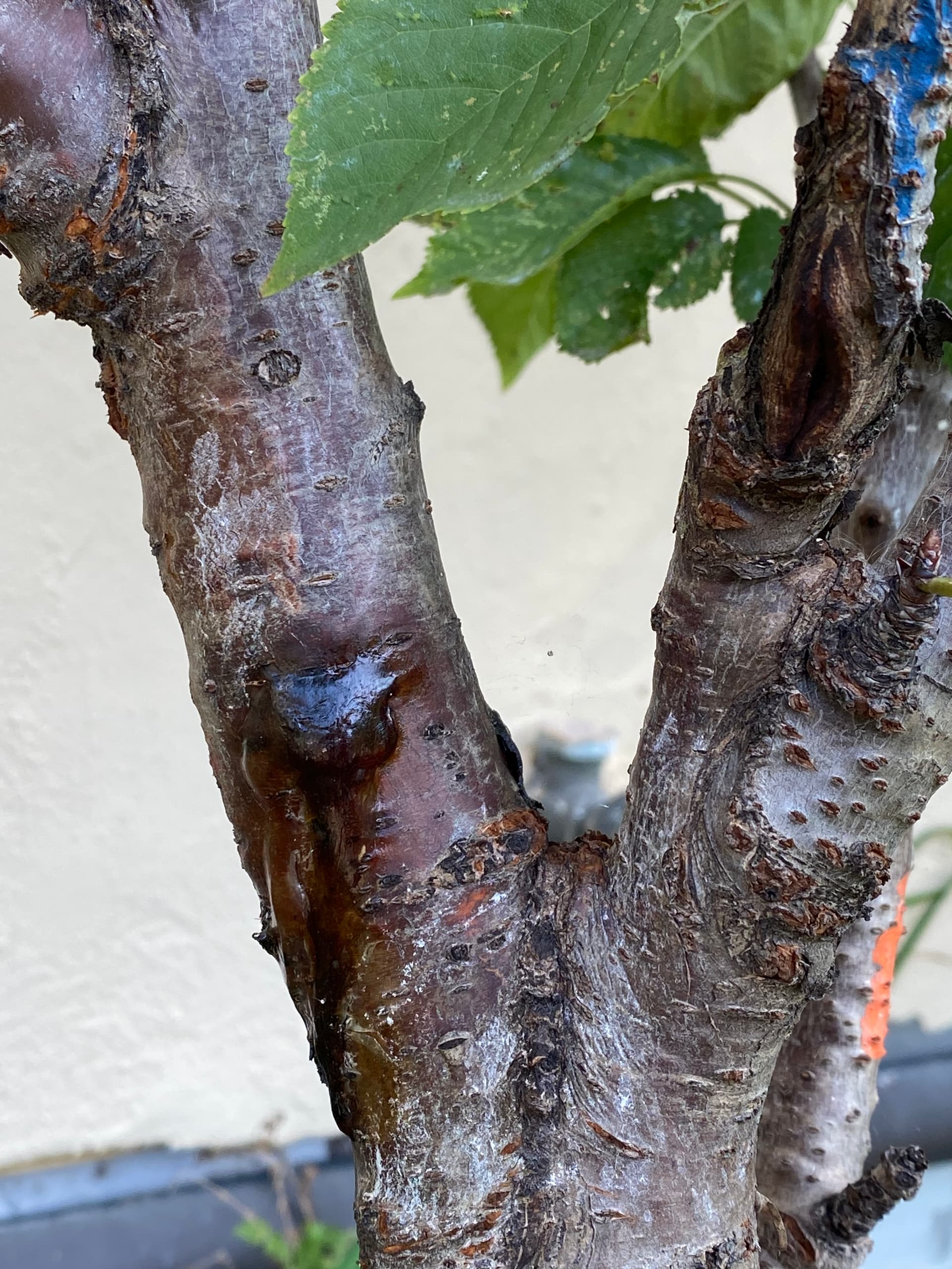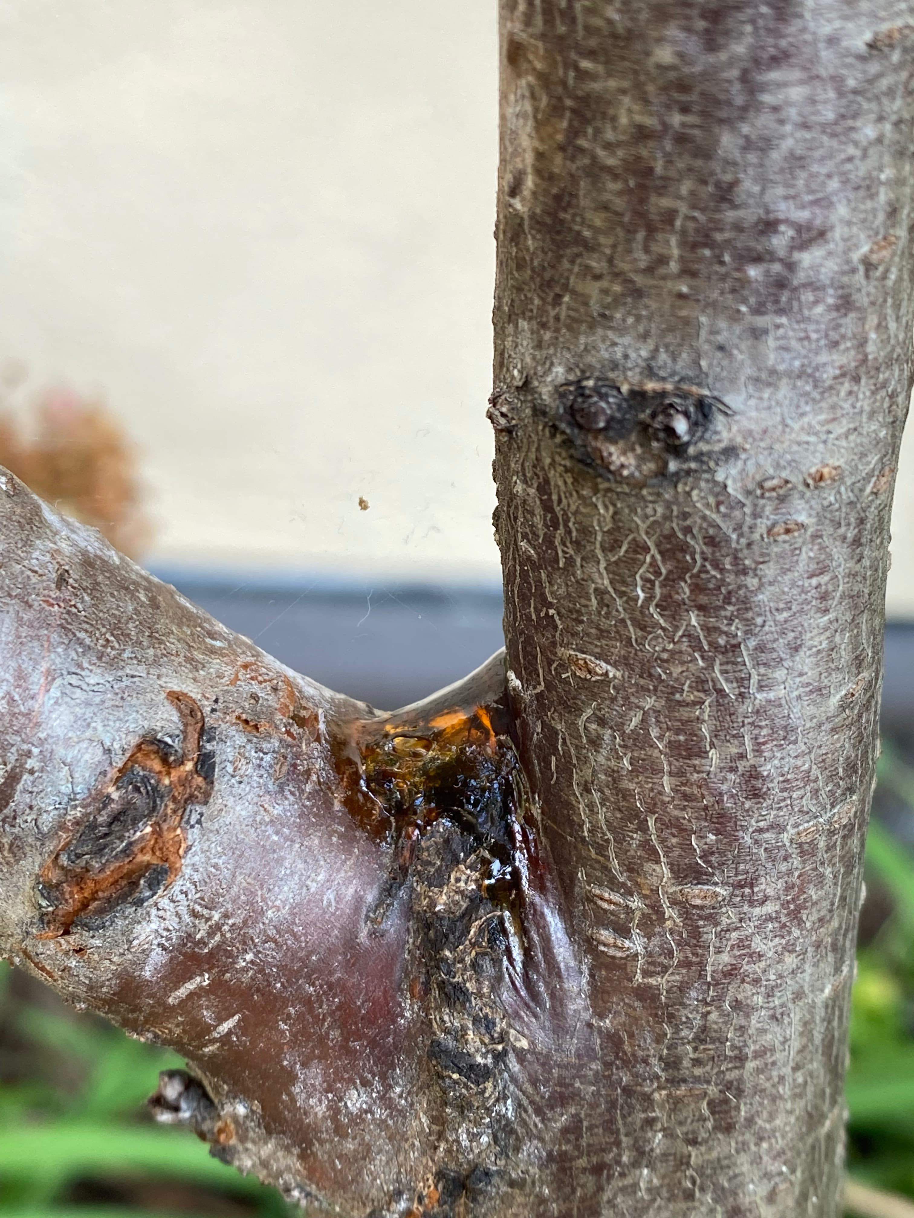 Second photo and video are from today. Large sections of some of the scaffolds have a dark, wet look. The string in the video is caked in from an earlier sap flow in the little crotch.