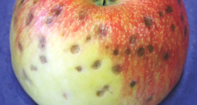 The second apple looks like bitter pit. Actually both apples appear to suffer bitter pit.