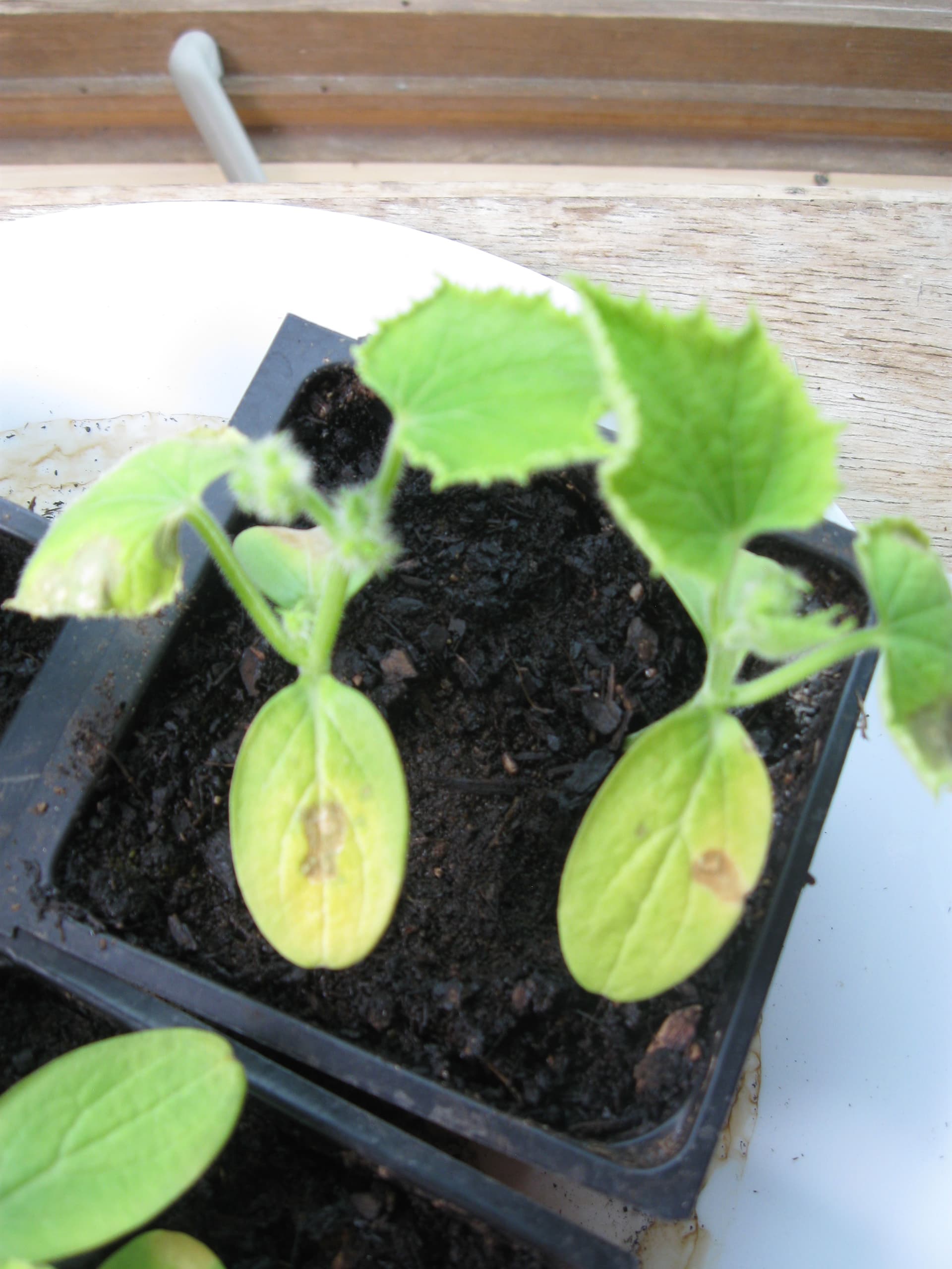 Symptoms are plants initially are doing well, then they start to loose vigor, leaves turn a bit yellow, then brown spots on the leaves which grow taking over most or all of the infected leaves. Not all leaves get it. I have tried copper (Kocide 3000) spray with little success. Here is a pic of the cukes I was starting inside which seem to be contracting this. Anyone have any ideas what it could be, and how to cure it?