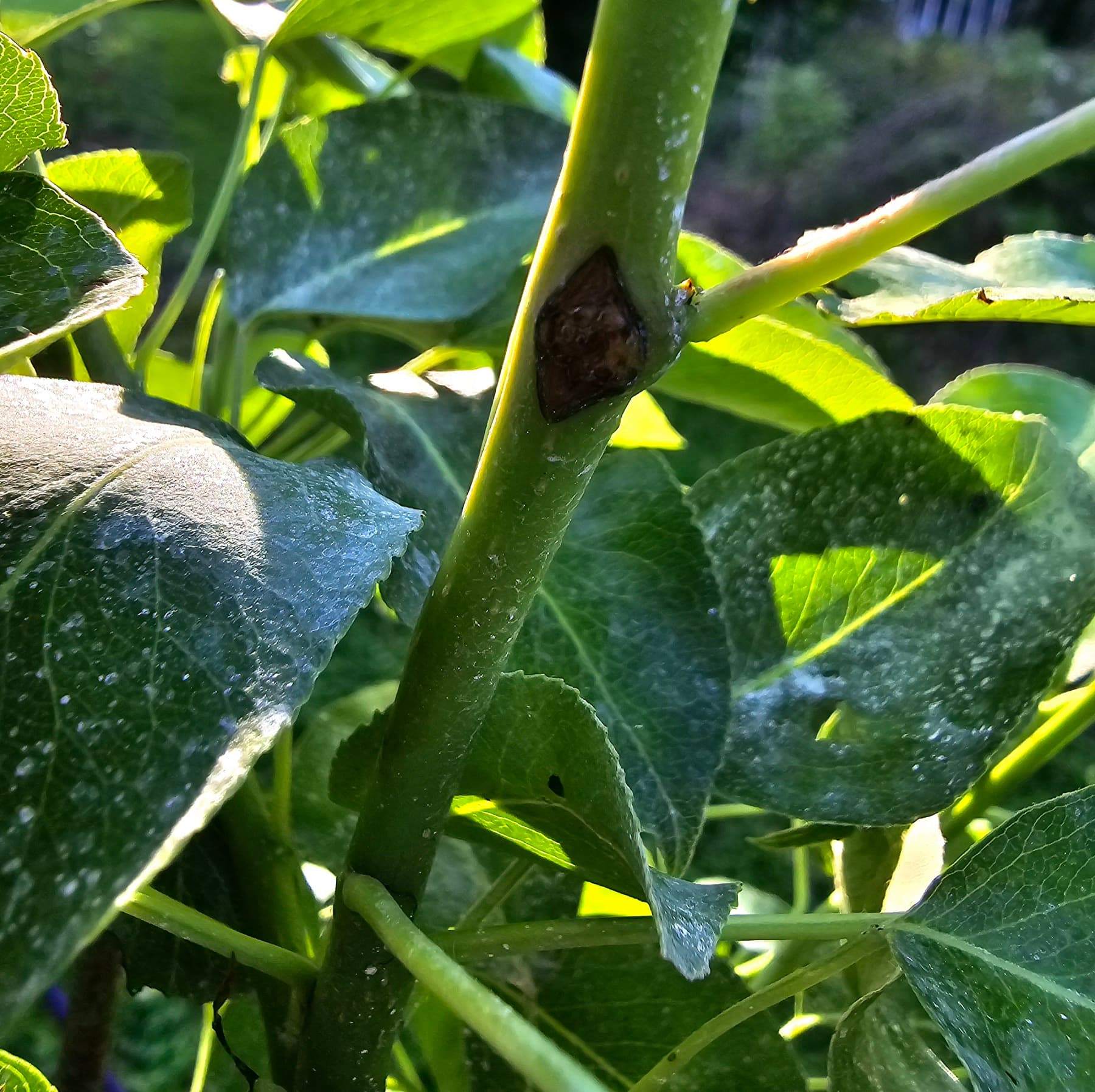 I had to Google this. Brown rot? The protrusion may have been a bud, although it would have been dormant. This started a couple weeks ago, and the tree had already finished blossoming by the time I bought it in March. It’s hard to see in the pic because I think my camera tried adjusting the colors, but there is a discolored area under the protrusion that looks much darker in person.