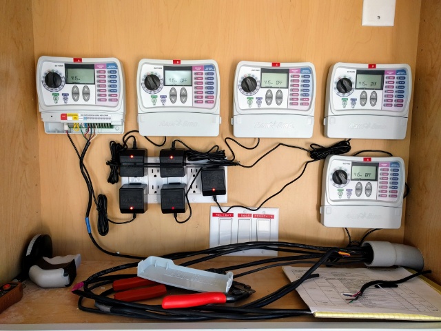 Instead, I have a water supply that comes into a fertigation shed where three different “flavors” of irrigation waters are disbursed to planters throughout the yard by about 25 valves scattered around the property, plus another set of 3 valves that refresh water in my bird fountains.