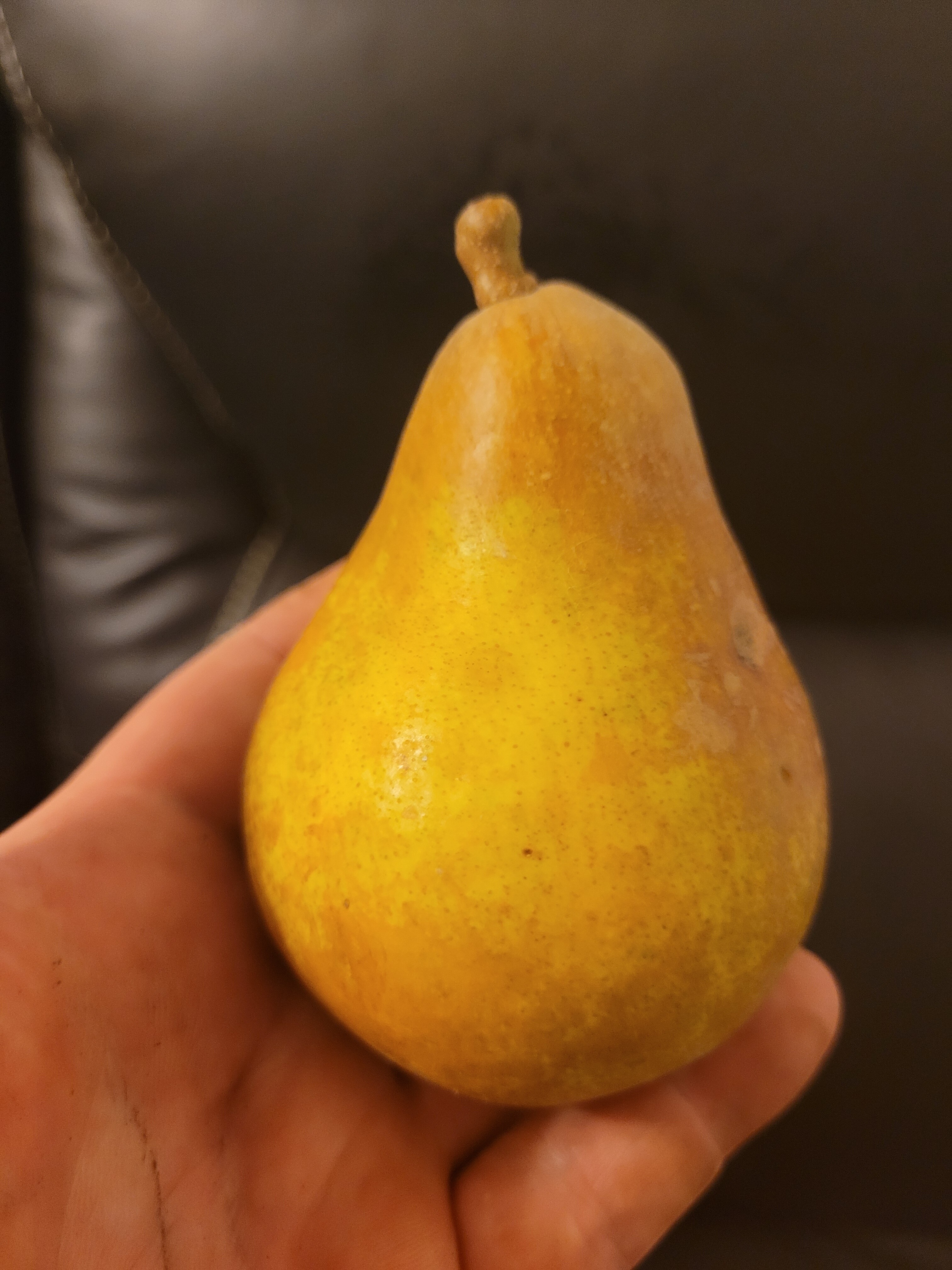 Someone is bound to ask what a ripe Warren pear should look like. Here is one with some character to use as an example. They have an unusual red blush. They are a greenish gold when ripe. It’s not unusual to have a mark or two on them as they are very high in sugar content. These were harvested recently and ripened inside to perfection. I’m guessing that Mark was a PC strike from when the pear was very small or a bird might have pecked it due to that red color but it’s highly unlikely. So how do they stack up against other high quality pears you might ask? My personal rating would be an 8 or 9 this year out of 10. It’s very hard to beat any of these exceptional type pears for quality. Should mention all very high quality pears are different in flavor as well. What about the question is it worth it to grow Warren? My advice would be only if you have the room! Warren is not a heavy producer but Harrow sweet is and ripens at almost the same time. So why do I grow Warren you might ask and it’s because i do have the room and as good as Harrow sweet is its not Warren. Warren and Harrow sweet are completely different flavors in their own way. Potomac rivals both for flavor and also ripens at around the same time with again a completely different flavor from either one. Drippin honey is also ripe with a very different flavor also. They all rate in the 7-10 range depending on the year on a 10 scale.