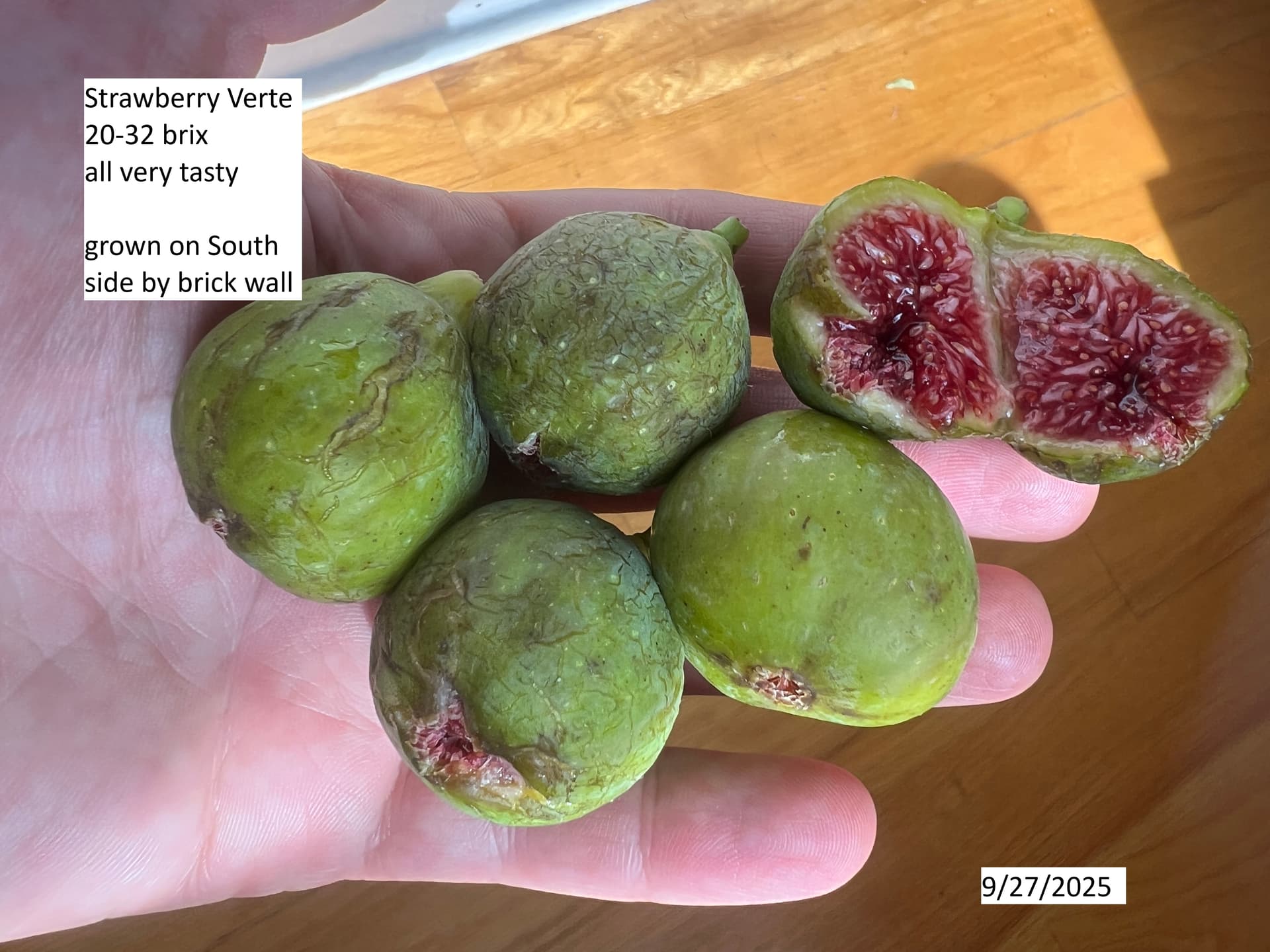 At another property I’ve been harvesting Strawberry Verte. It’s a bit younger (planted May 2022), but has finally started to pump out figs. I think the south facing brick wall (with a window for winter warmth) that it is planted against is making it ripen faster. The only other Adriatic that I’ve grown is Adriatic JH, and the last time it produced figs was in 2020, ripening in November. Maybe AJH is a much later variety than SV, but from what I’ve seen online they aren’t that far apart, so maybe the spring/summer heat from the brick wall is speeding things along.