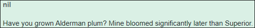 I would like to ask jaypeedee and nil… (or anyone else that knows)… if you know which of your other J-plum varieties or A/J hybrids, bloom at the same time as your Alderman plum trees ?