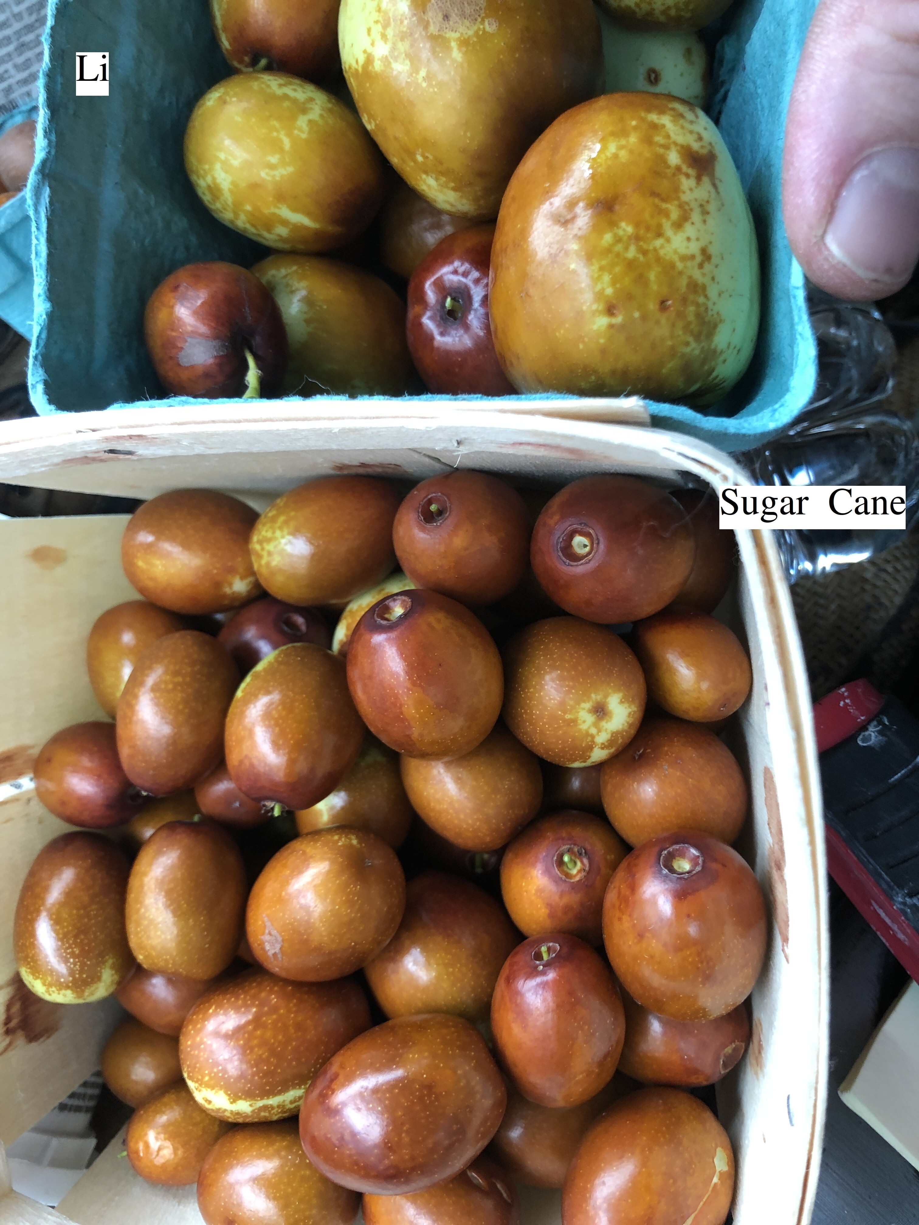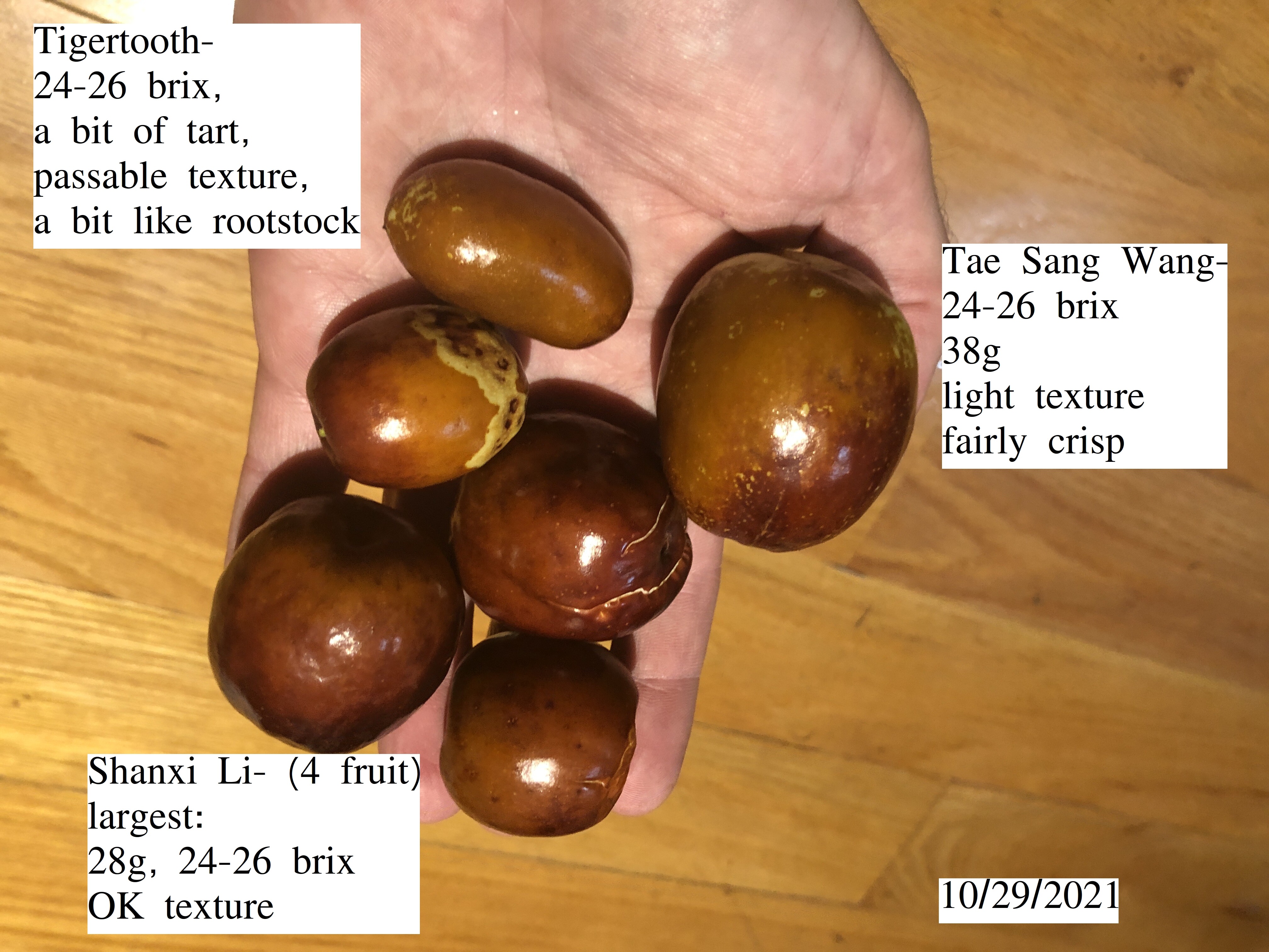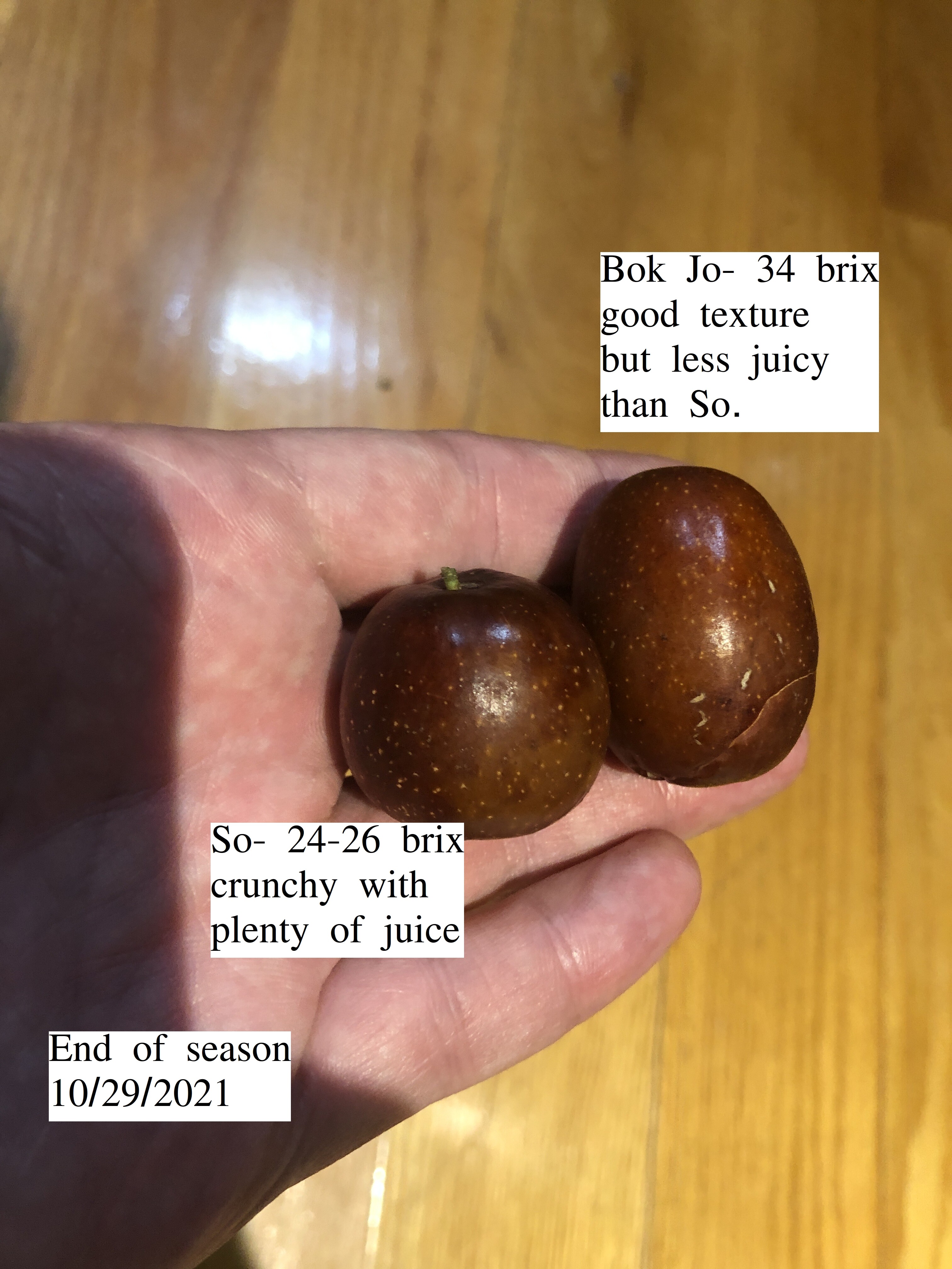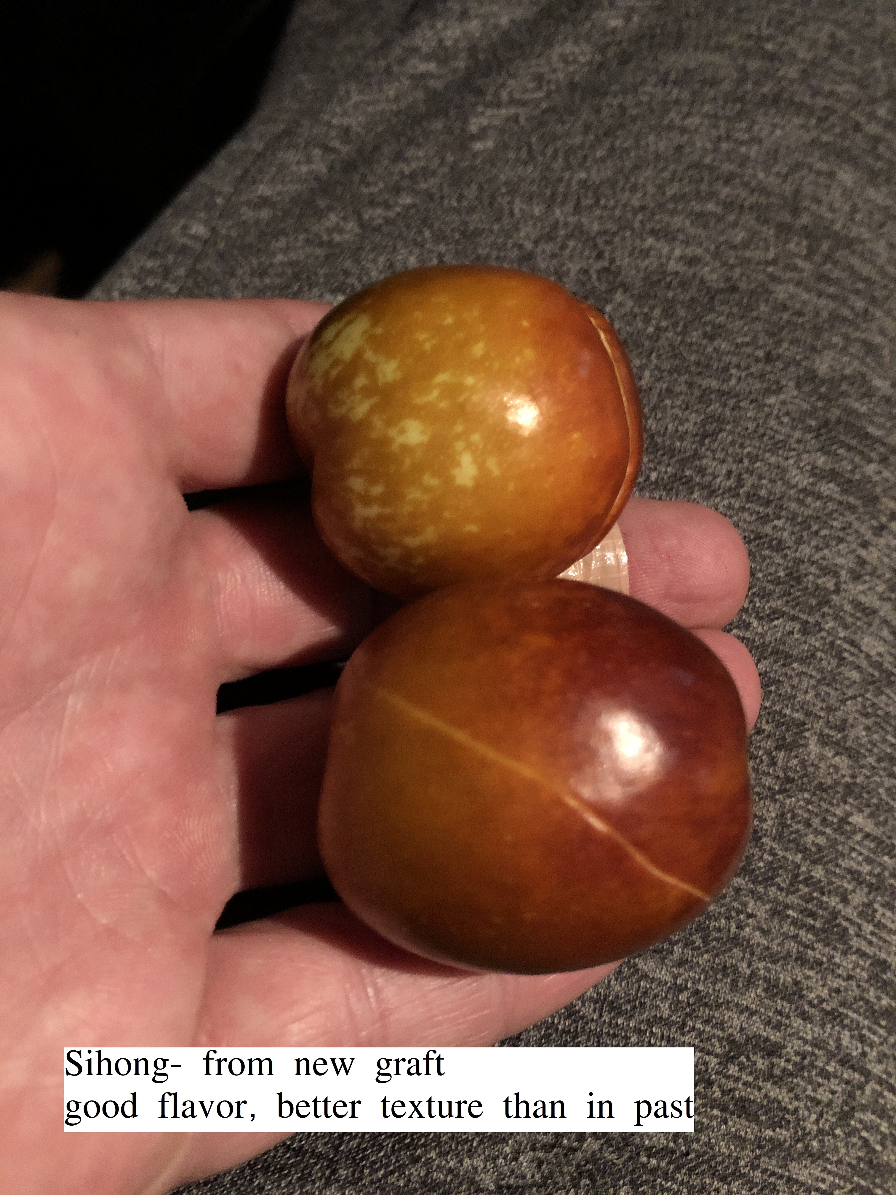 An example of something which wasn’t good initially, but has finally showed signs of hope is Sihong. I’ve had 2 Sihong trees for 4 years now and have only had a couple fruit from one tree last year. It wasn’t very good (texture or brix), but I still put a Sihong graft on a tree at the rental where everything (even the lawn) has fast growth. That graft produced in the same year and the fruit has finally started to ripen (a bit late, given that our normal first frost date is a few days from now). Here’s the first few fruit from that graft. Much better texture- a lighter crispy texture, similar to Sugar Cane, though not quite as good. But larger and with good flavor.