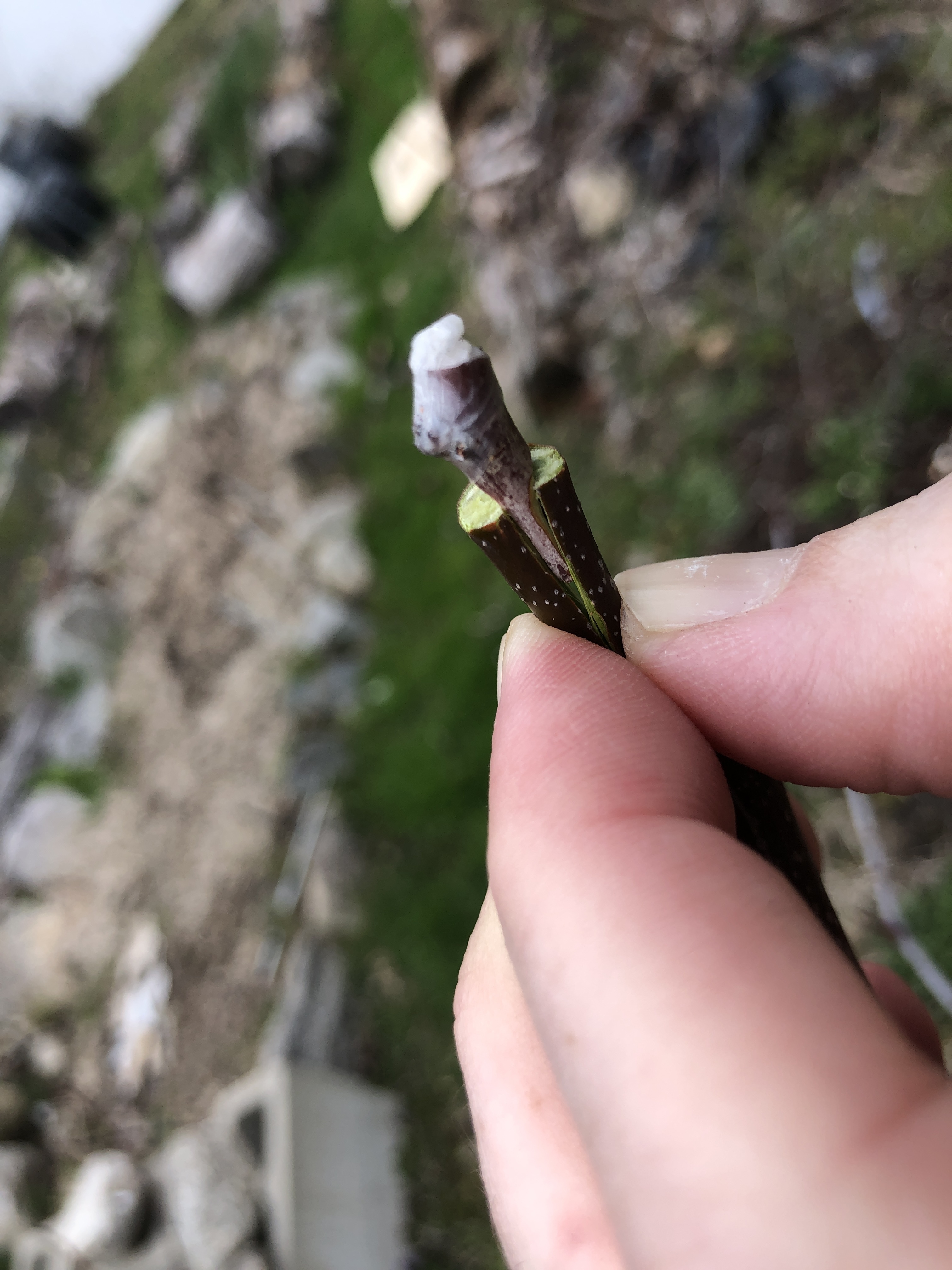One thing to consider. If I had a stick with 10 buds, even if the space between the buds wasn’t all that much (like the below pics), I think I would do OK, as long as I made each wedge before separating the bud from the rest of the stick. That would leave only the last bud with nowhere to hold, giving you 9 decent grafts (in a situation where you don’t have much wood and want a lot of copies).