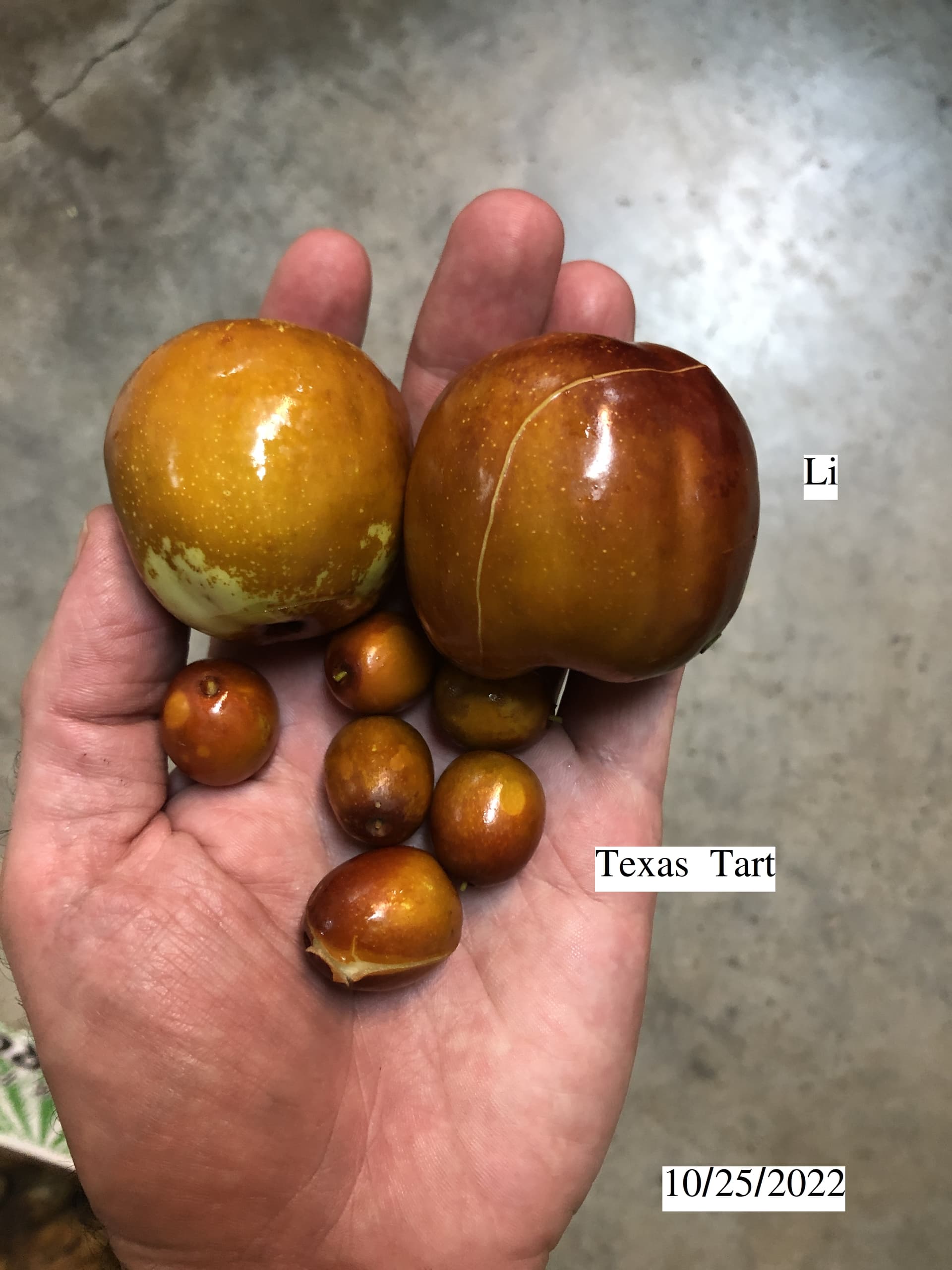 Here’s a size comparison between the biggest and the smallest, Li and Texas Tart. Though the TT are from the 2nd crop (on a new graft no less), so they are at a bit of a size disadvantage.