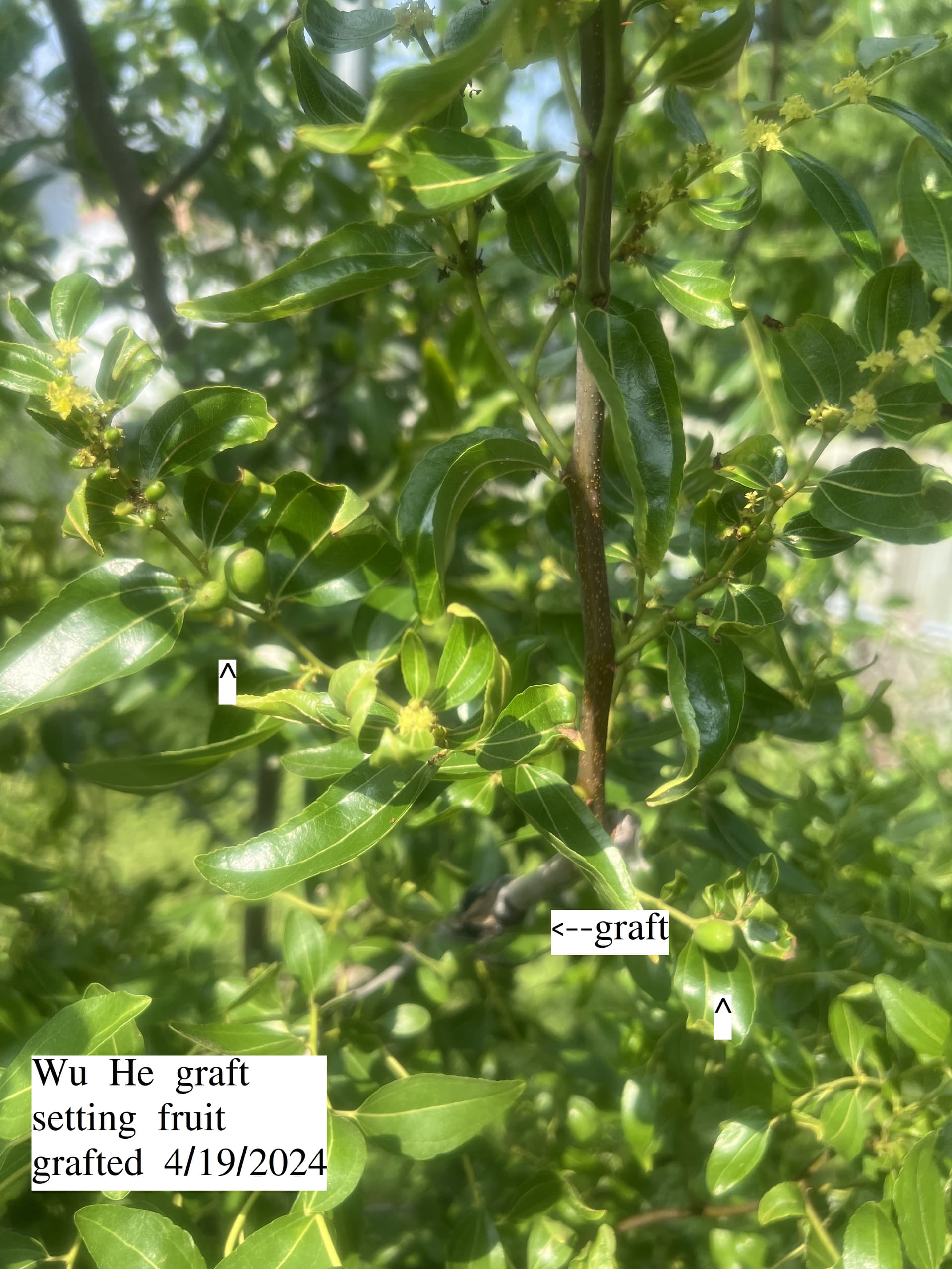 I also noticed one of my grafts from this spring has fruit, which was exciting. I was a bit disappointed to realize that it is Wu He, which is the same variety that is setting fruit on a graft at my house. So, disappointing that it is only one variety, but it does make a better case for Wu He being a very precocious/productive cultivar.