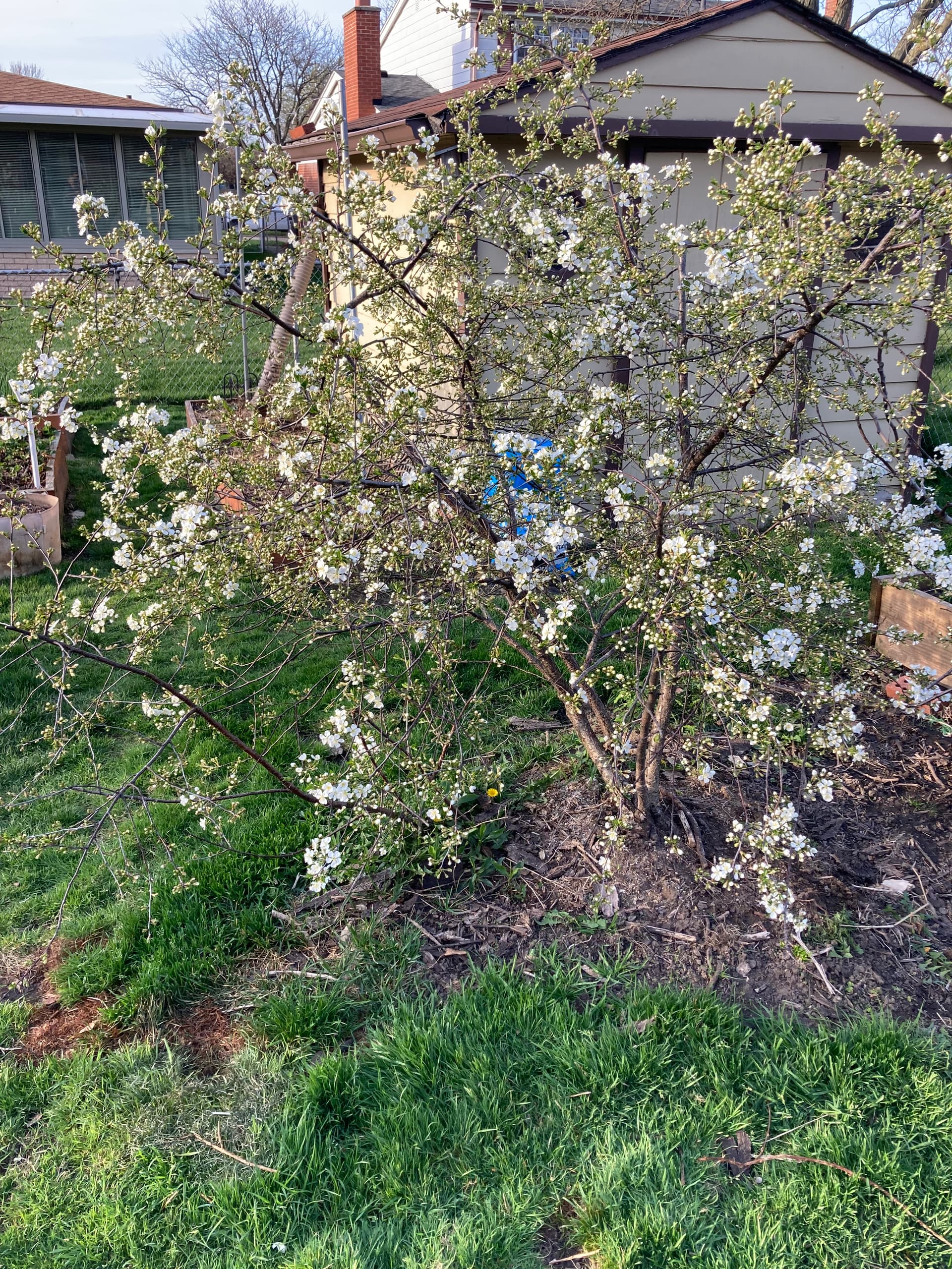 i lost half my carmine last year because the snow melting split it in half. it once looked just like yours but bigger. its since threw up 3 suckers on the side that the other half tree once was so should fill back in. now i have a unbalanced tree. my Romeo did the same. damn snow! still got a great crop off them.