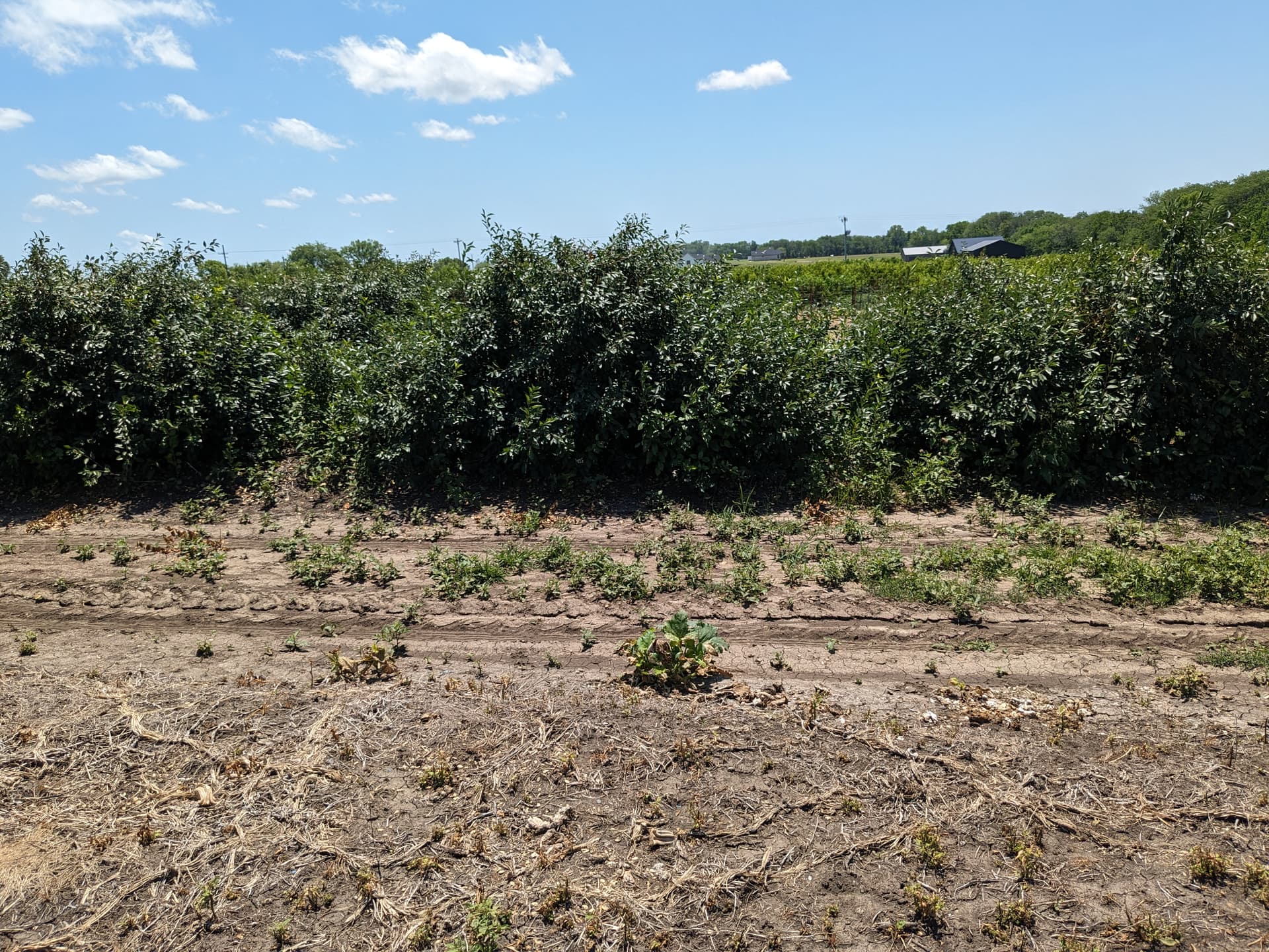 For the first few years, I didn’t think it would be possible to grow them as a solid hedge (without something like plastic mulch, or a weed barrier cloth) because we don’t have the time to hand weed them, and the suckers prevent applying herbicide under the bushes. So I was just about resigned to grow them as short trees.
