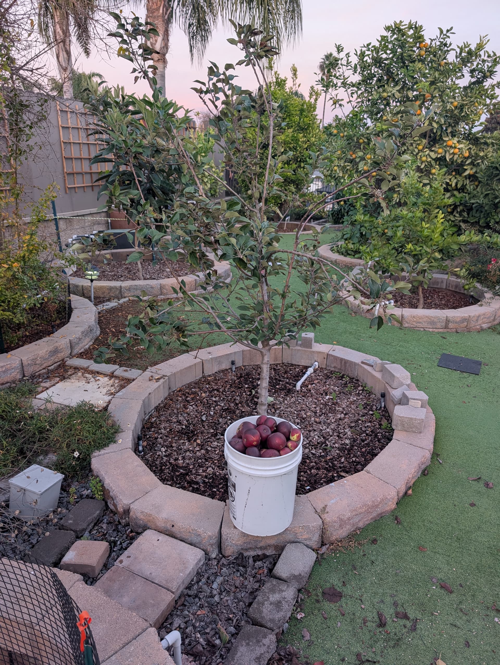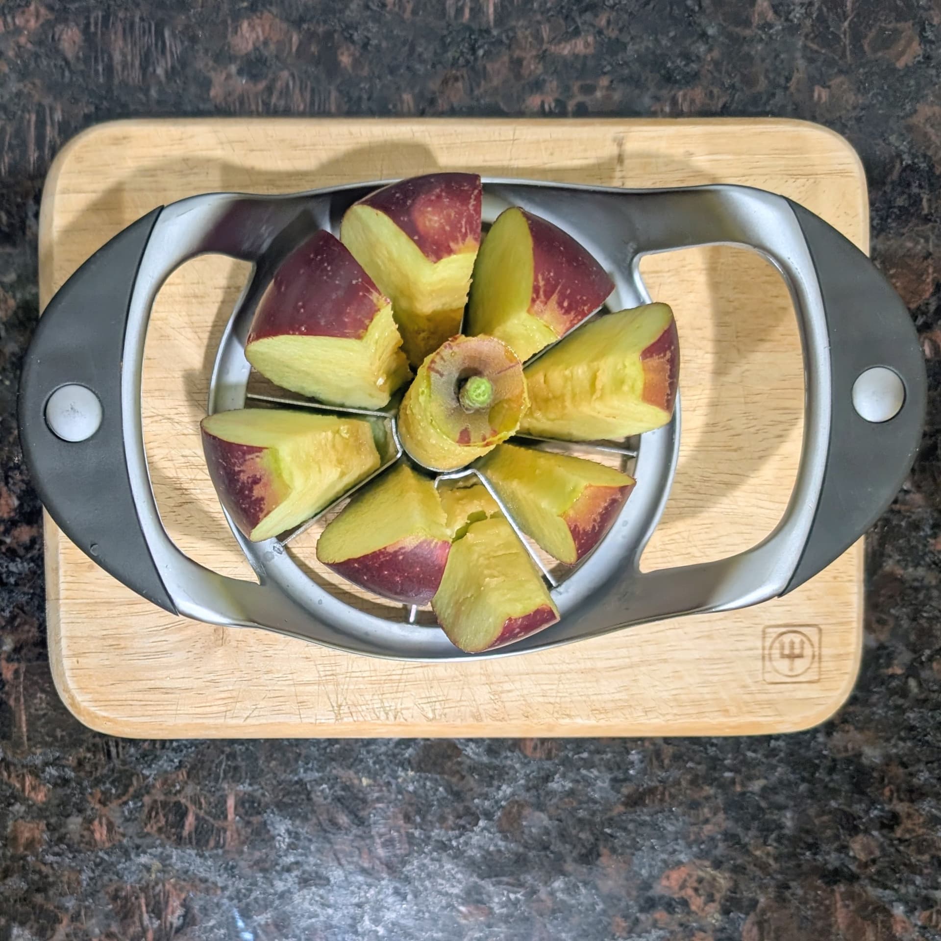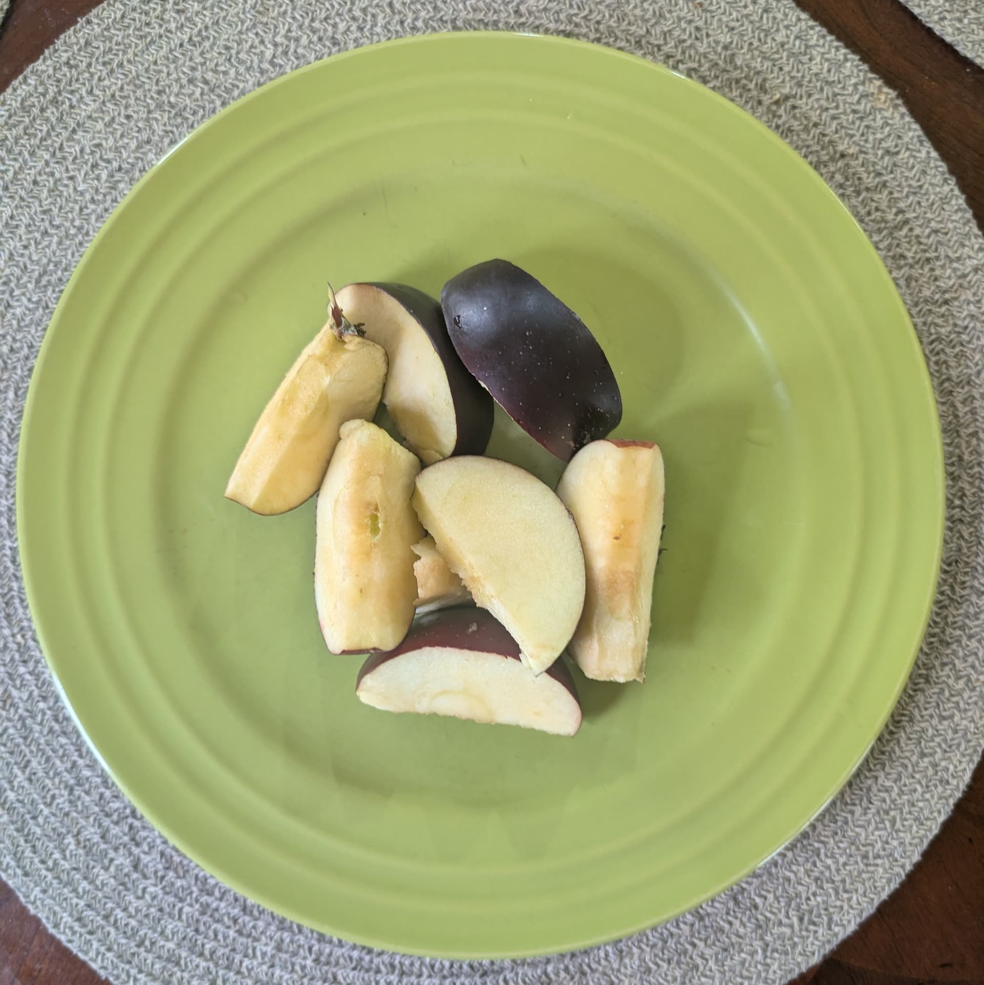 I’m still learning about harvesting apples at this location. Yesterday I went out to check on the dozen or so apples on our King David. A 2 incher had fallen off. The outer 1/4" was a bit over-ripe but the interior was great.