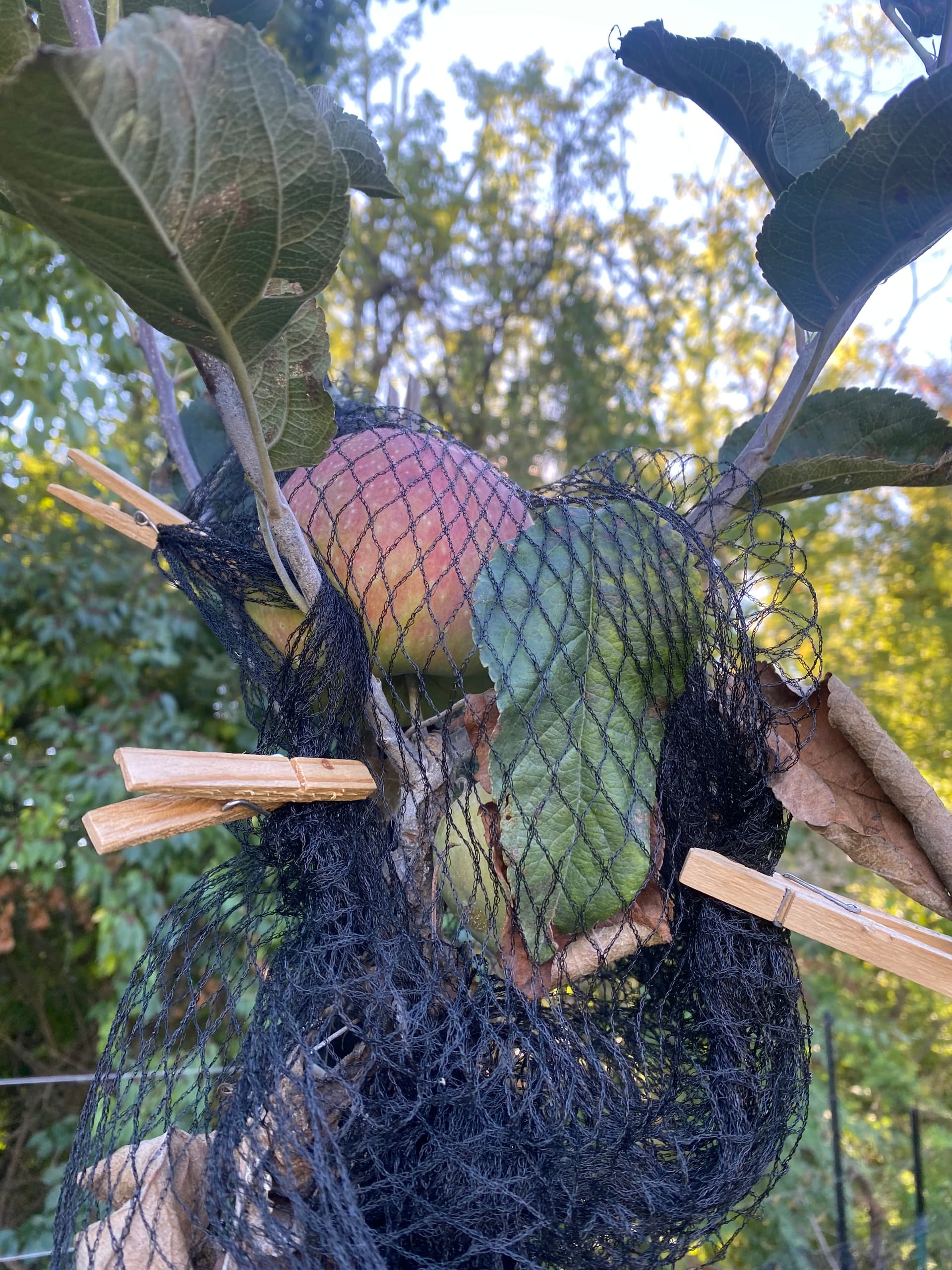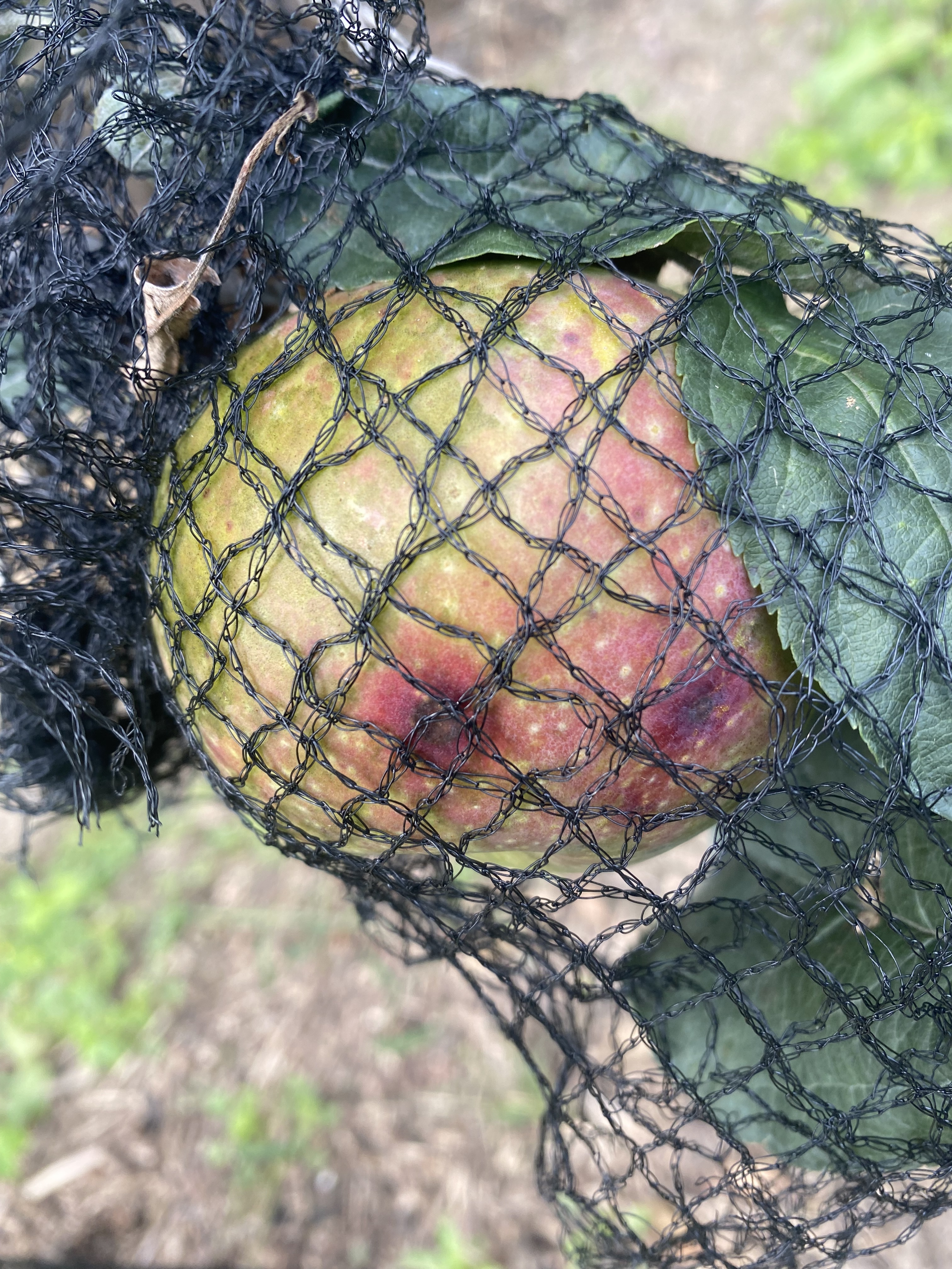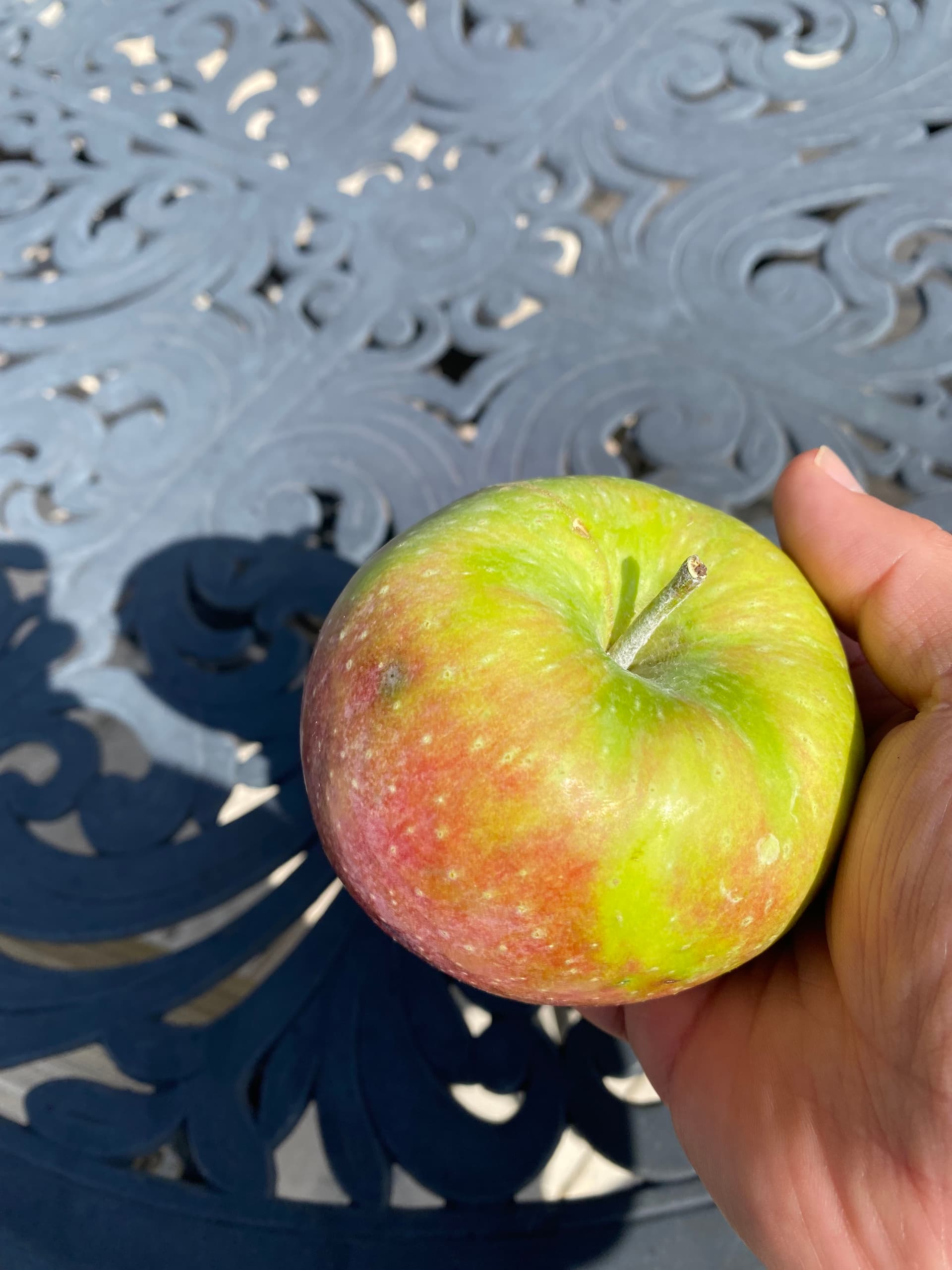 I tasted that damaged apple - too soon, it was not ripe yet. Other two apples are still hanging, they just started coloring this week.