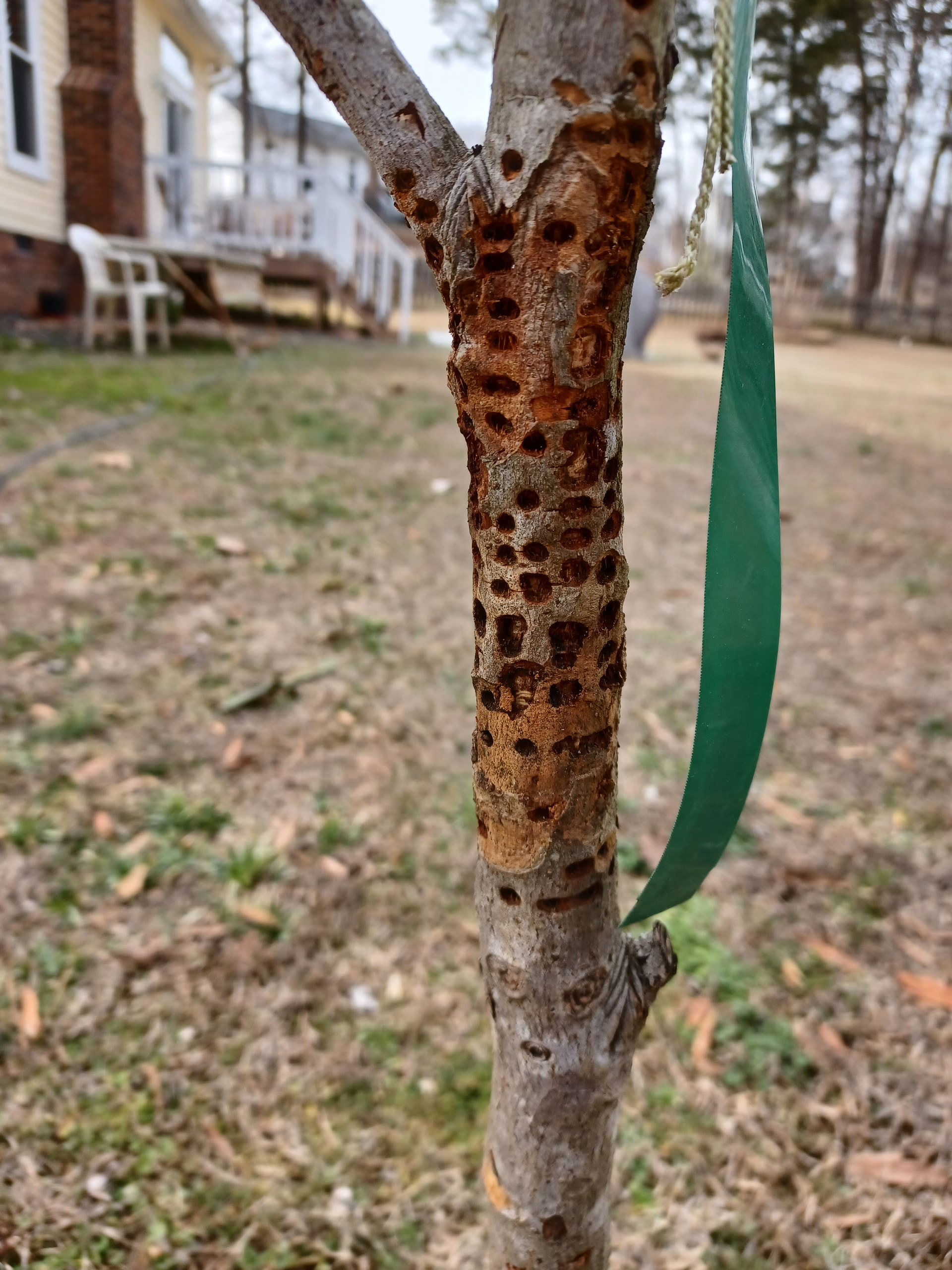 Woodpeacker damage of a loquat Signs of an industrious woodpecker