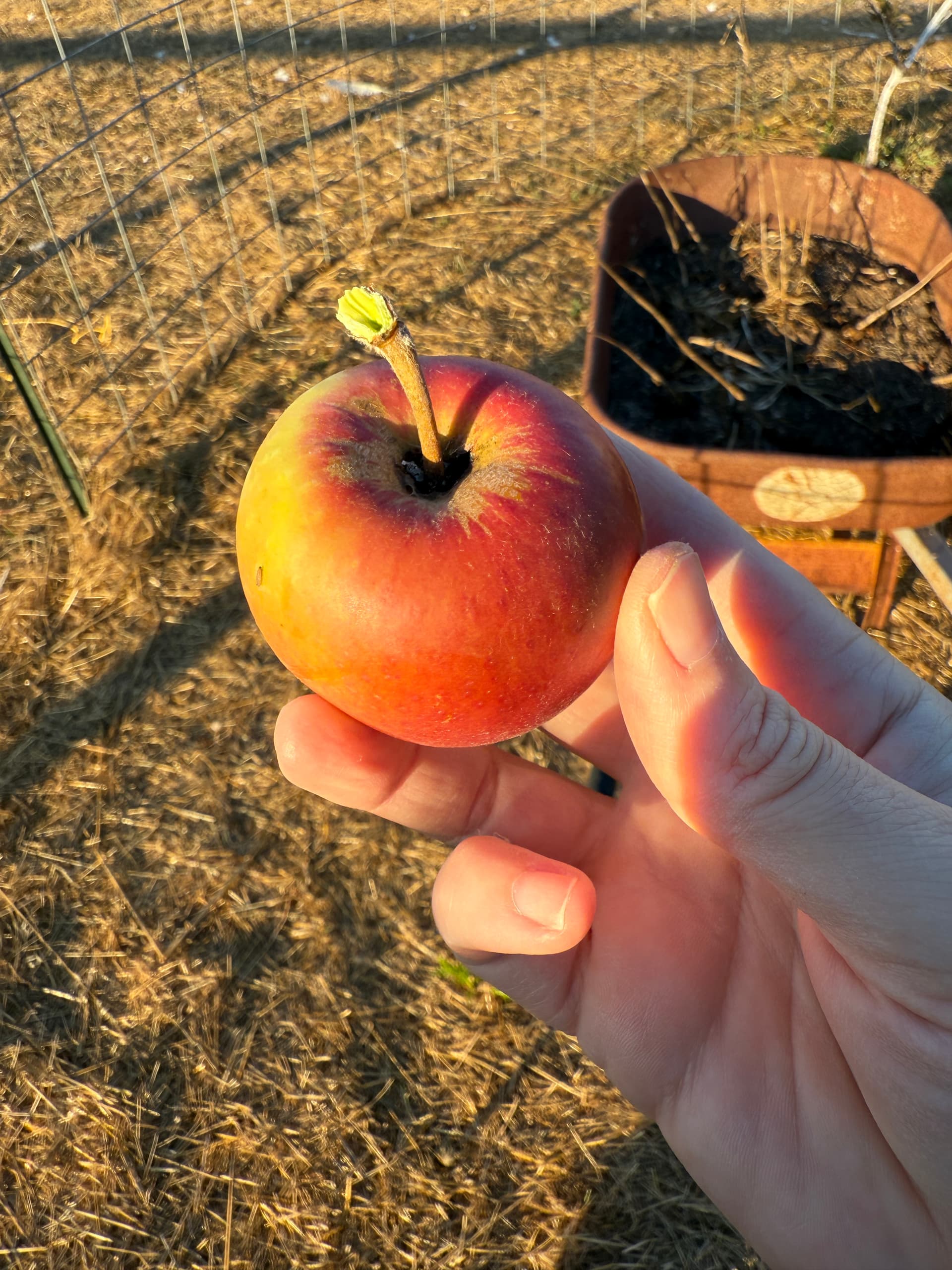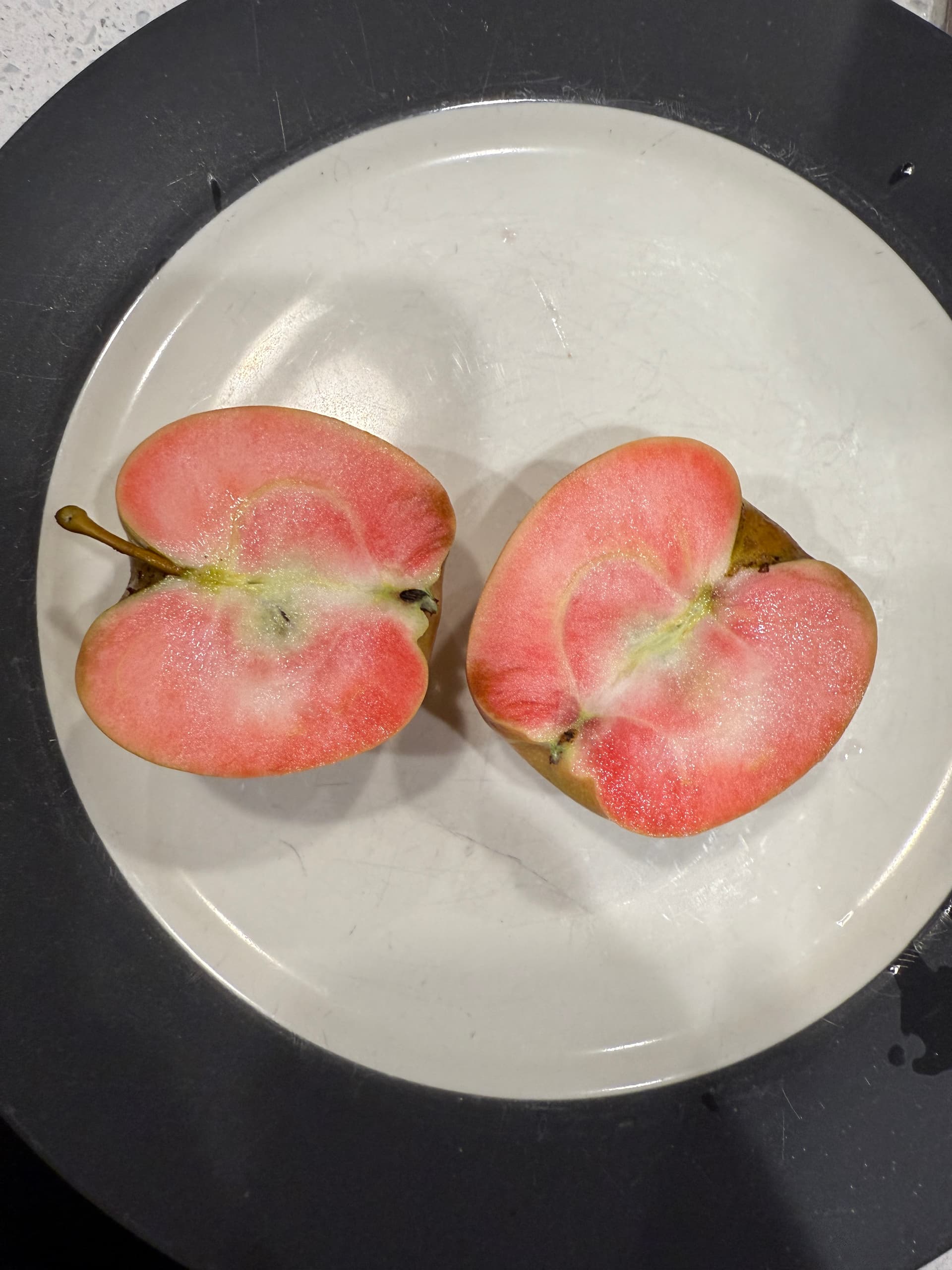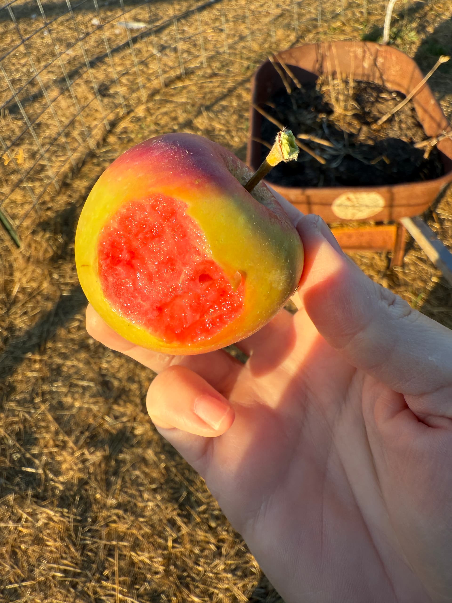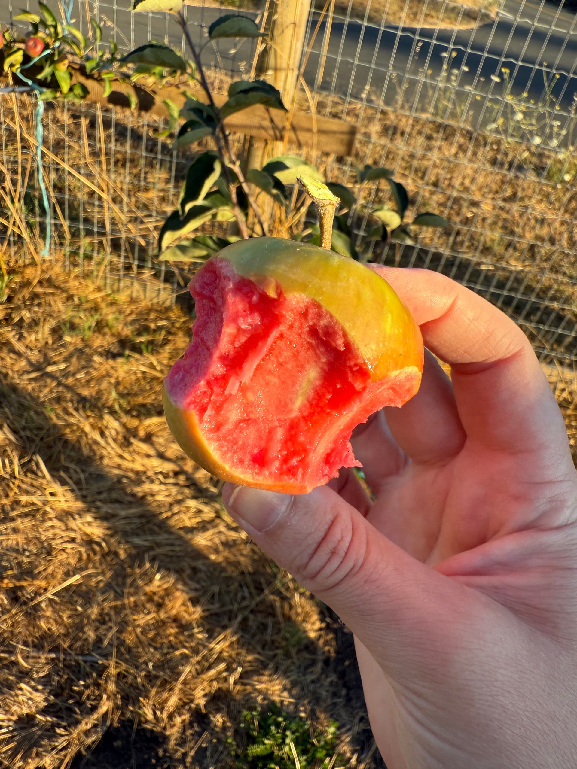 First Lucy Glo from my own trees! I picked this one because it had some damage near the stem -maybe that hastened it’s ripening? Considering they hit the shops in October I wouldn’t expect them to develop so early here in Northern California but no clue. Not ripe but still absolutely delicious, and not far away. Color is stunning, has that strong raspberry lemonade note that a lot of red-fleshed apples do. I’d rather eat these unripe than anything in the store currently. I have 3 more apples on this little tree (dwarf, planted 2024) that hopefully will hang a bit longer. The dwarf tree I have in a pot is growing several apples too but they’re quite stunted in comparison - not sure I’ll get to taste any of them this year. I love this apple so it and Gem are the only thing I grafted this year - I have a field graft on MM111 and a lot more in my nursery bed. Glad I got to taste this one because it indicates that LG is going to be fantastic in my climate.