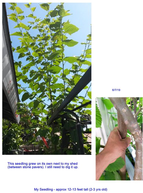 Drew, very interesting article and it sure is huge tree. It looks like your seedling tree is still not that old so you probably did not get any fruits yet. I have a Persian mulberry that I grafted and it grew about 10ft in one year, I hope to get some fruits this year so I can taste it. If you want to trade for a few cuttings of your special mulberry let me know. I have many varieties, some that is not available yet in USA. My wild seedling tree that grew in my backyard is over 20ft tall and it always has flowers (male) but I use the rooted cuttings for my rootstock to graft my many varieties.