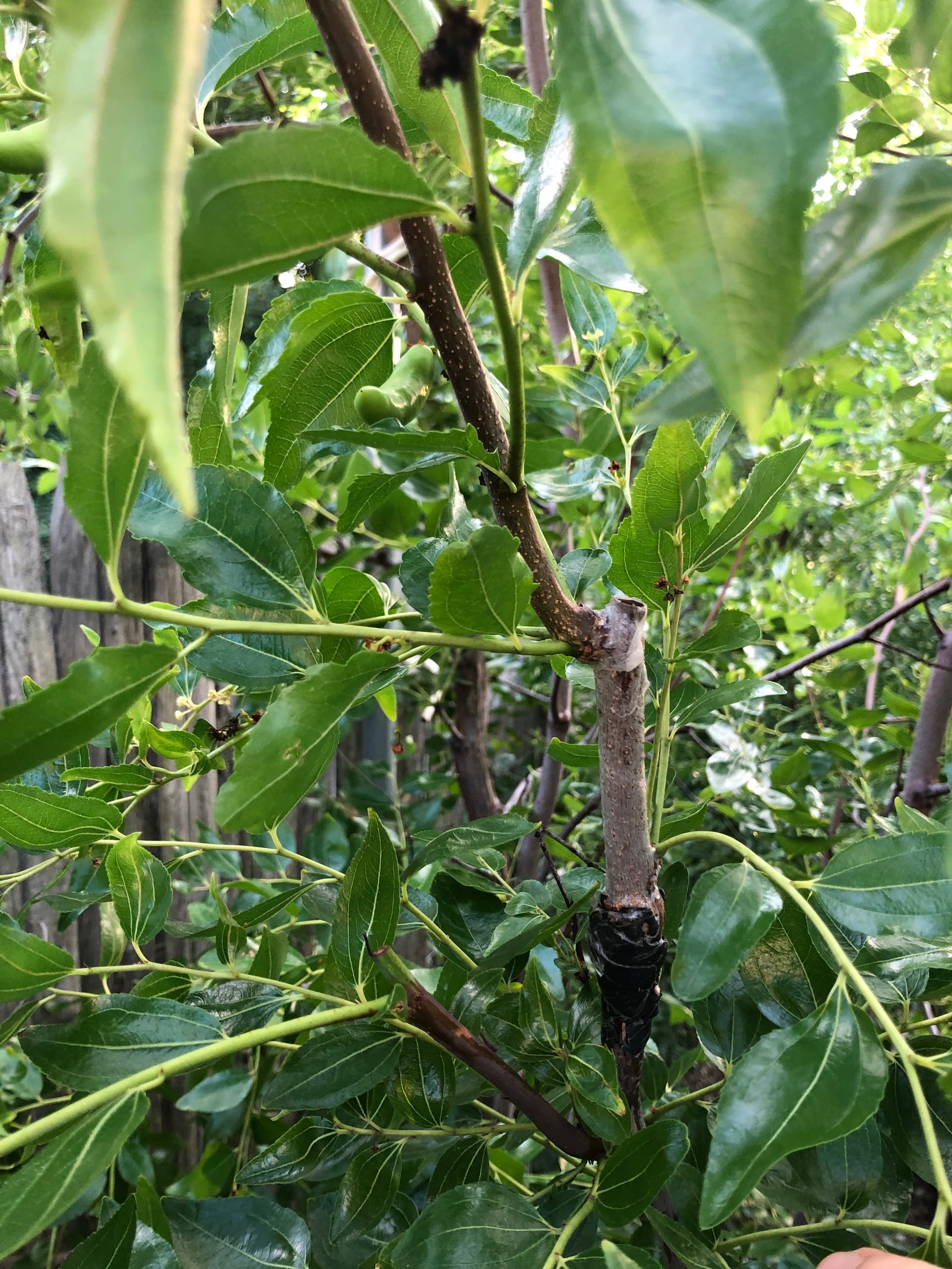 The fruit on my Porterville graft may not be sizing up, but it looks like the Texas Tart graft at a different rental is. This graft has only put on 1.5-2’ of growth (vs Porterville’s 3’+), but it’s not a bad tradeoff for 8-10 fruit.