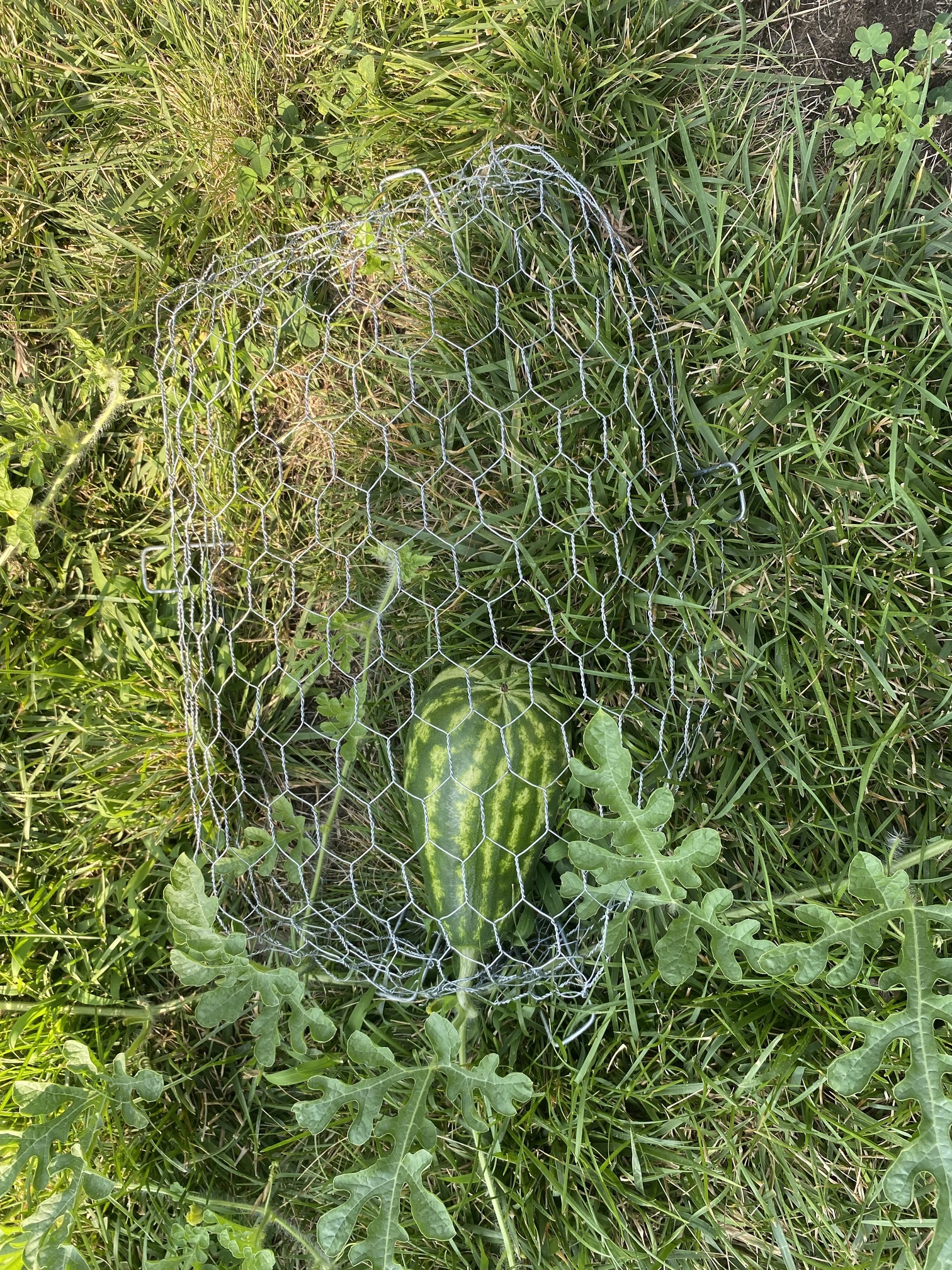 Cages. I have to make the watermelons (like this) bigger this weekend. This is an Orange tendersweet. First year growing them and I’m impressed as it’s the most productive vine of the varieties I have going. The others are far behind just starting to flower.