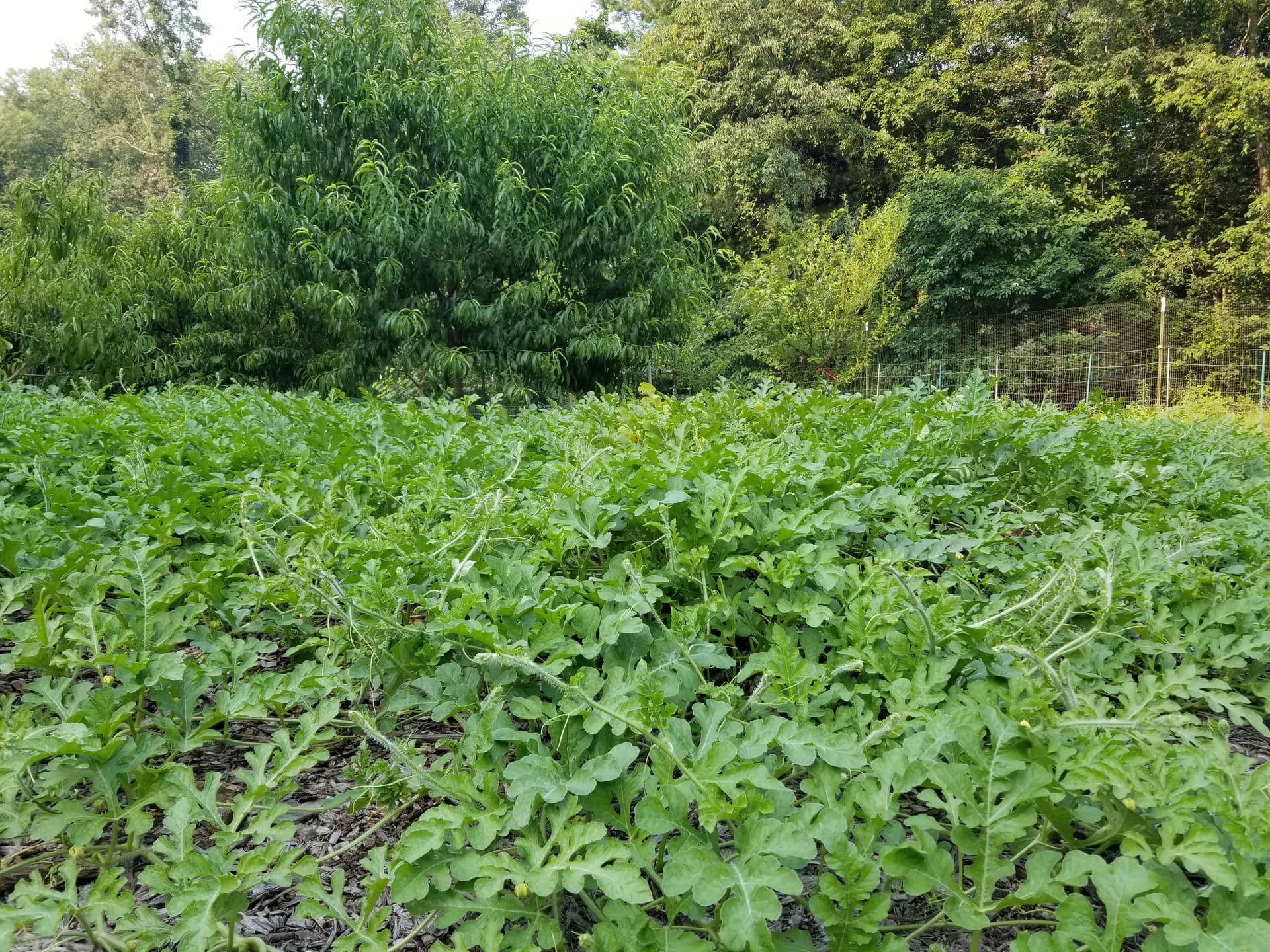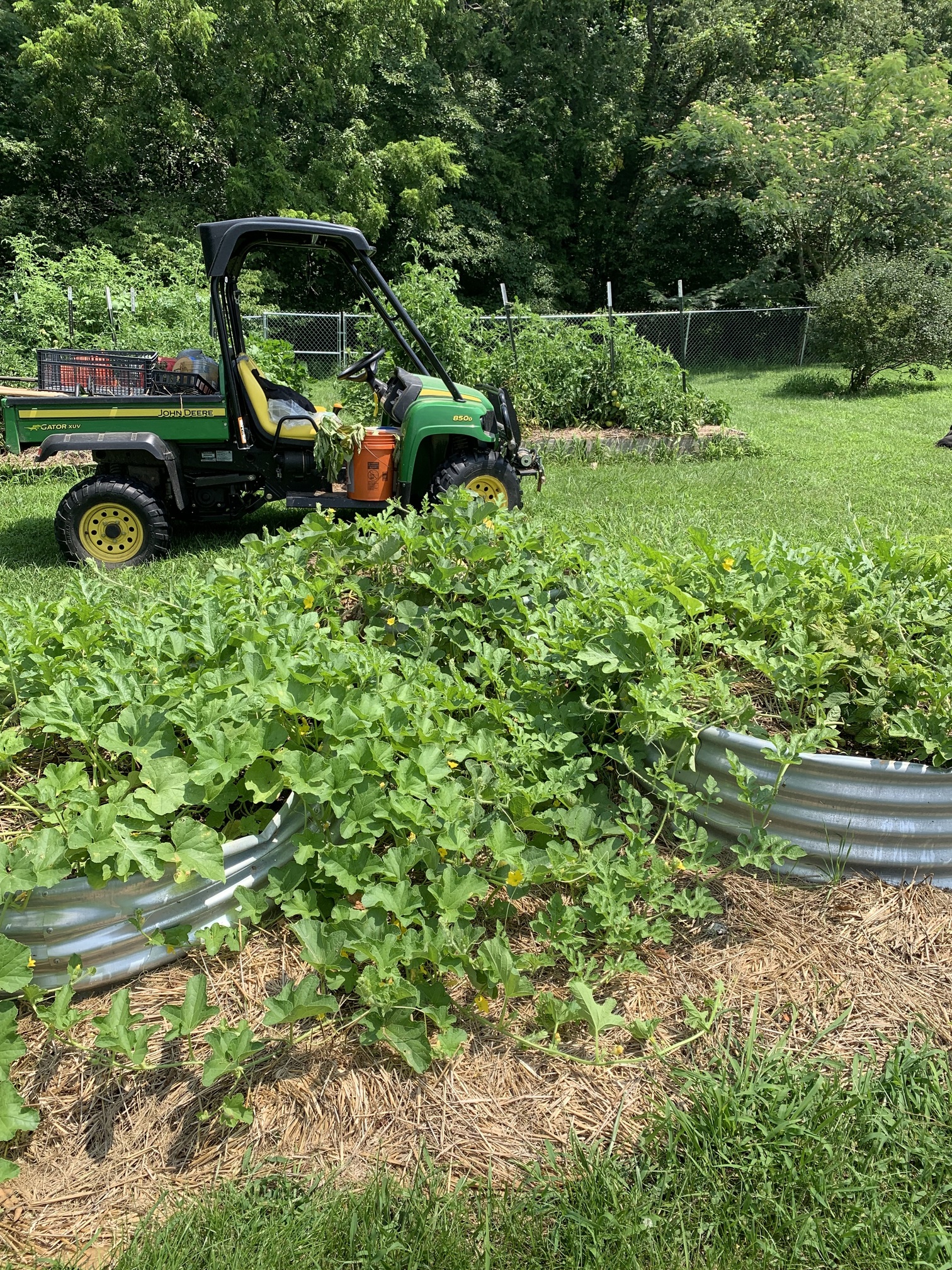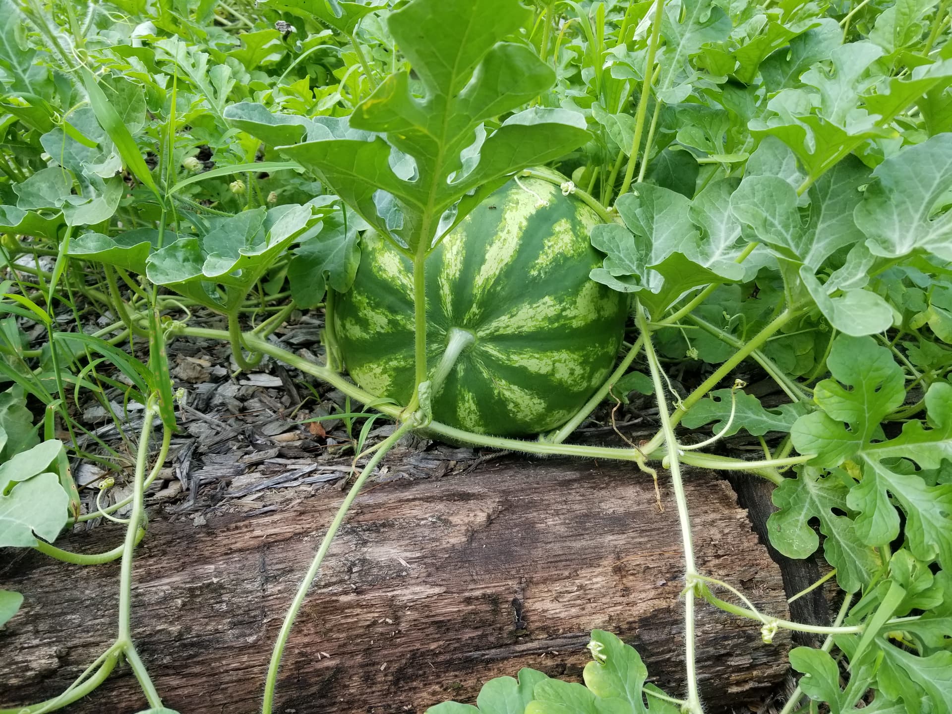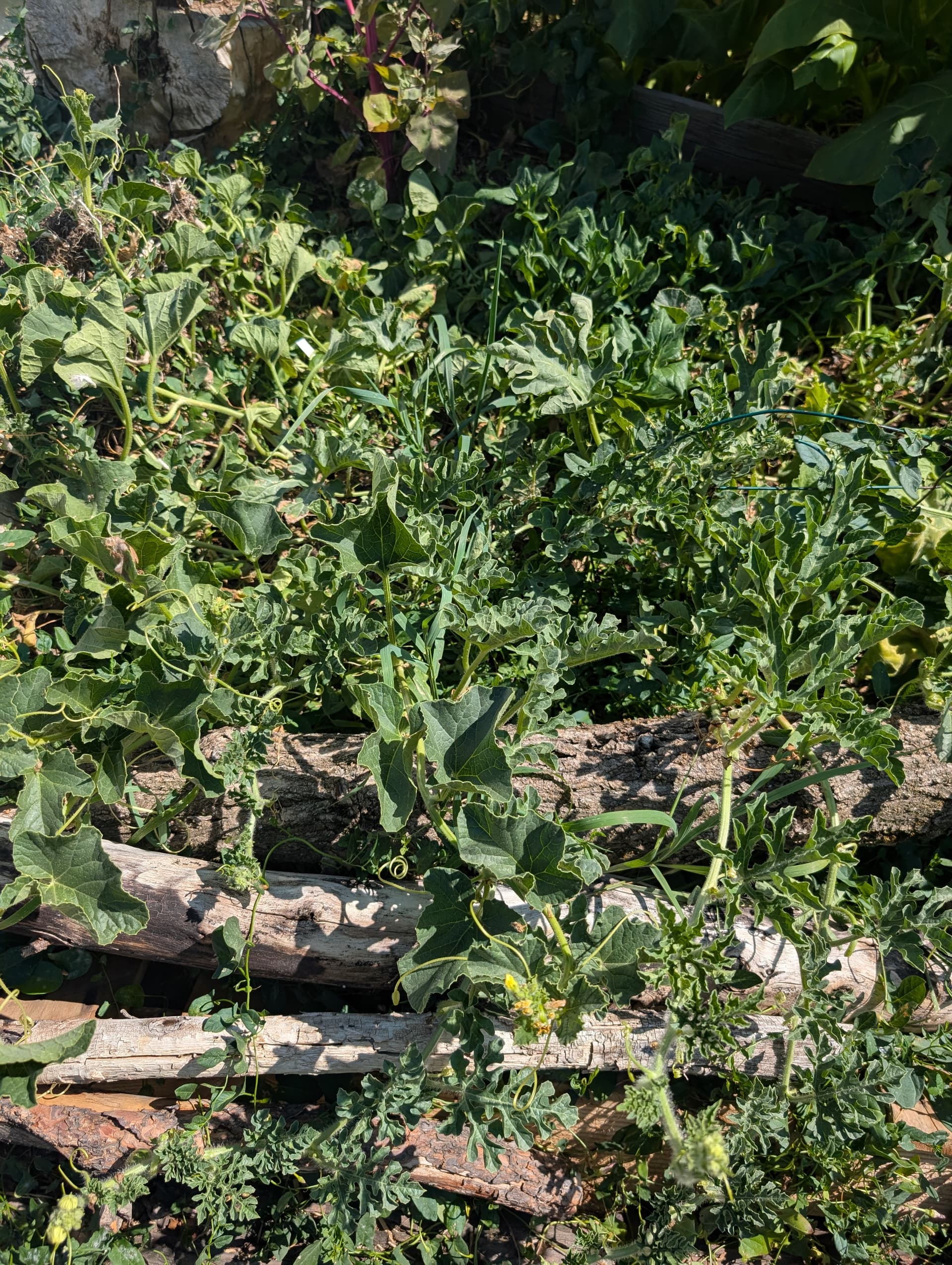 The vines in the back middle raised bed and almost all the vines on the ground are from that one little cantaloupe plant.