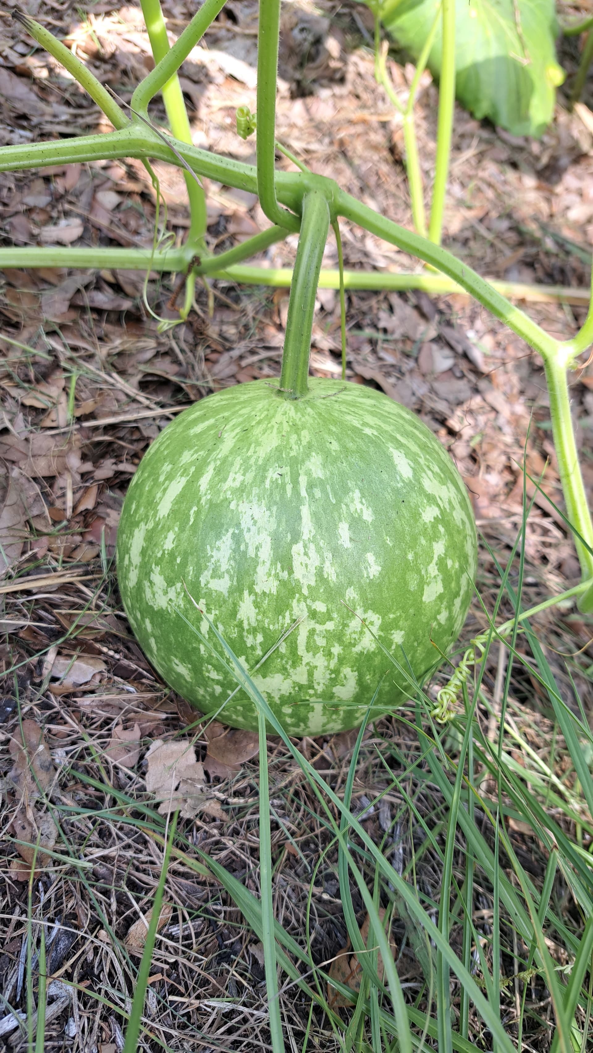 Egusi Melon. I only have 1 vine, but I probably have close to 5 fruits growing that are about this size and a bunch more starting out. I don’t like watermelons very much, so the point of these is to get the seeds for baking and soups.