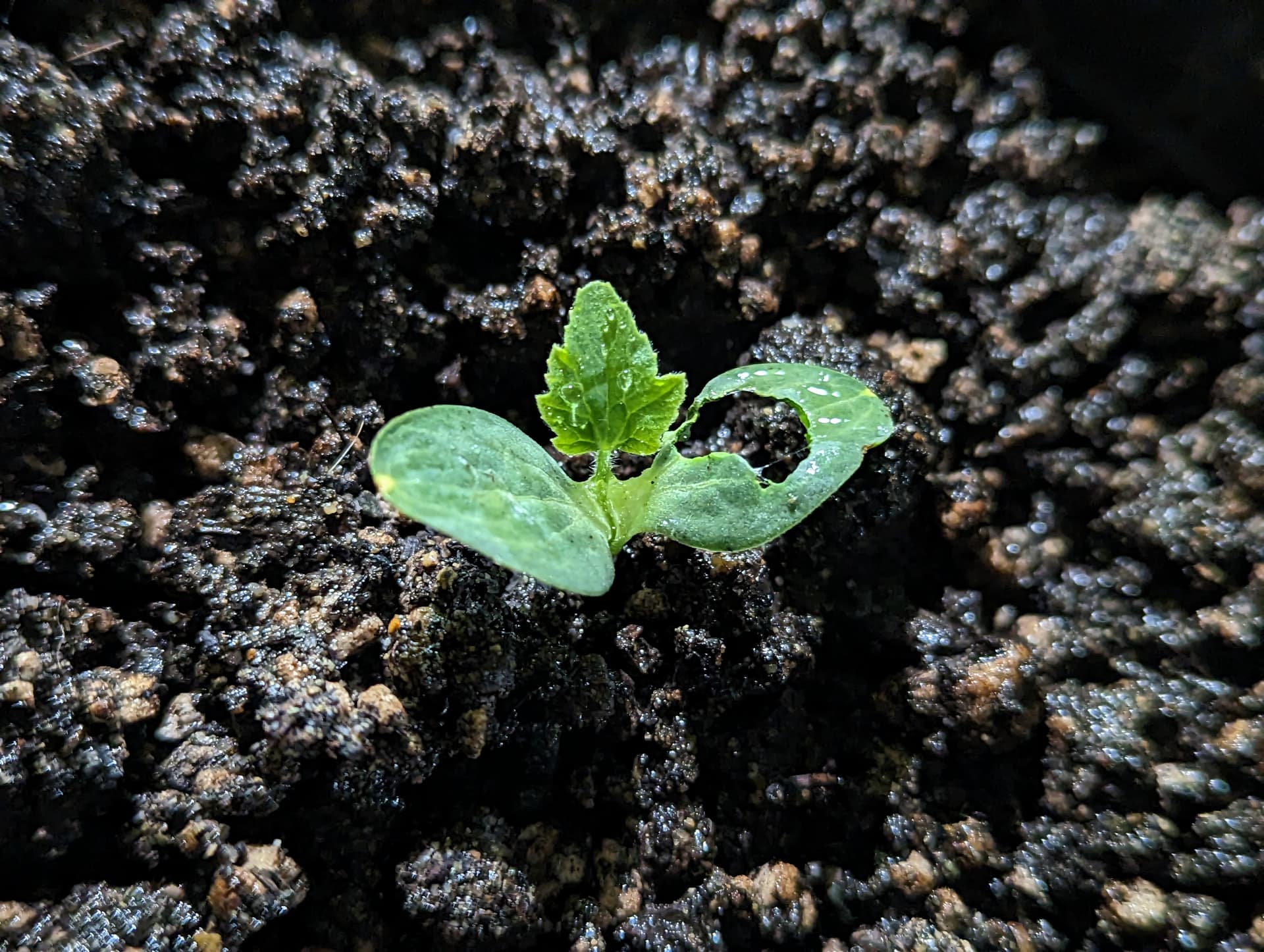 In Seattle, we have what seems like dozens of species of slugs and snails, and at least one of those absolutely loves cucurbits, beans, pawpaws, and potatoes (though only the leaves, the potatoes themselves turn out fine). It’s slug egg hatching time now, and the one going after that watermelon seedling is likely a tiny baby. It was hiding too well in the soil, I’ll have to catch it in the act before it gets big enough to kill the plant.