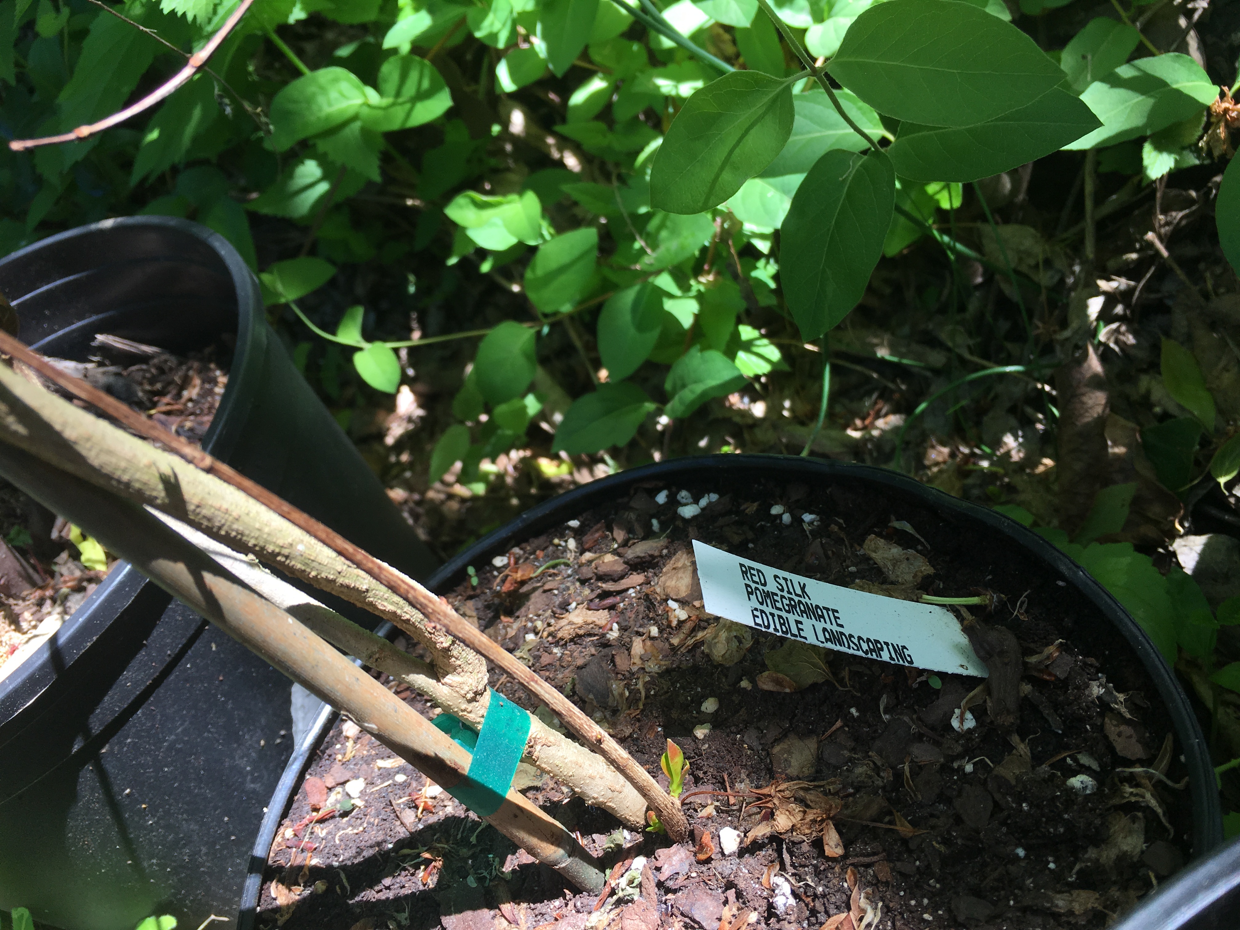 My potted Red Silk pomegranate is sprouting from the roots, and some of the plant buds are greening up ever so slightly.