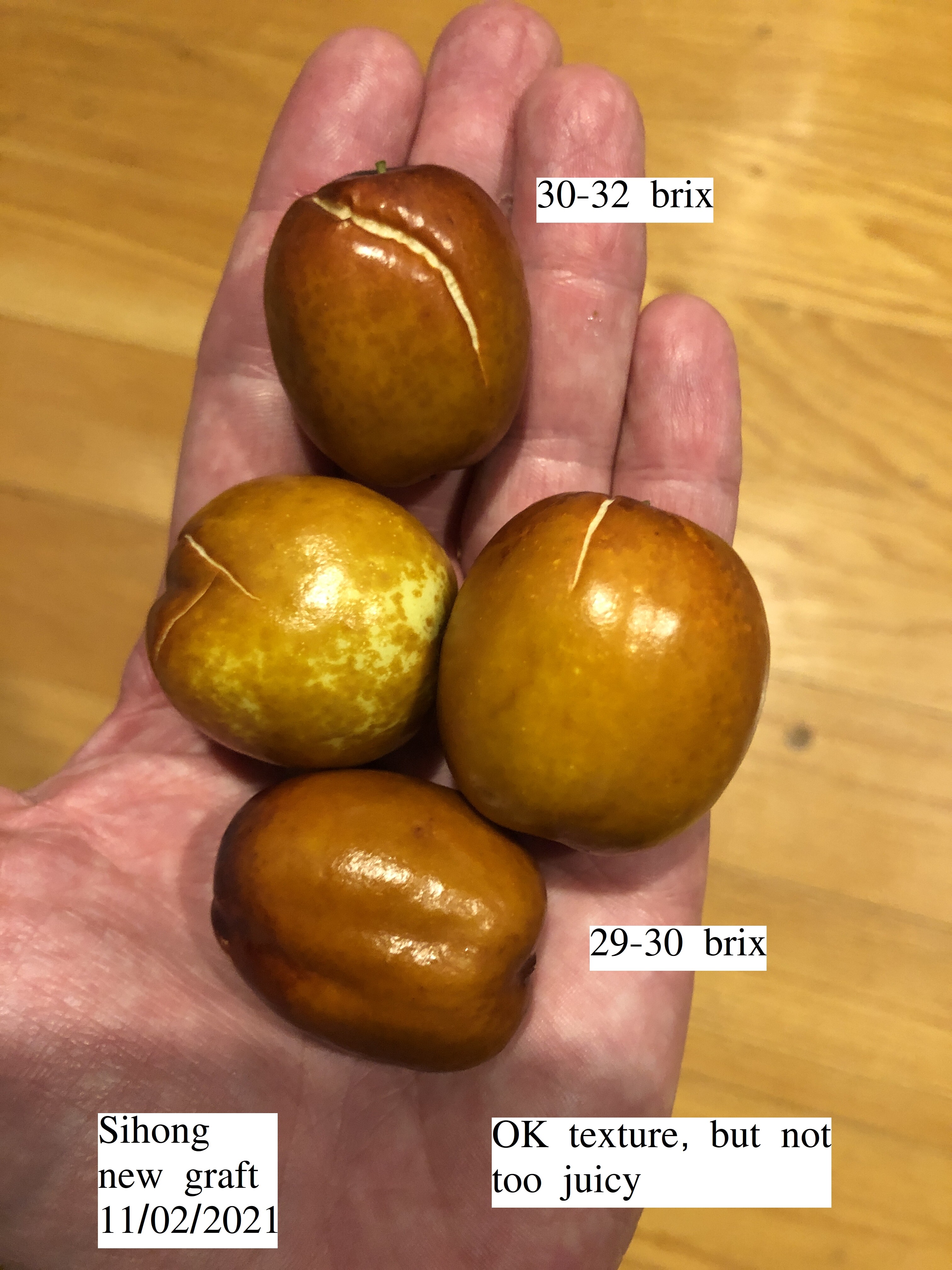 The fruit was middle-of-the-road. Maybe it will be better this year. It could be earlier, as I already see small fruitlets forming on the graft at the rental. Also, it could be that Sihong is particularly suited to drying. I did get some partially dried jujubes from Raf a few years ago where Sihong was the best.