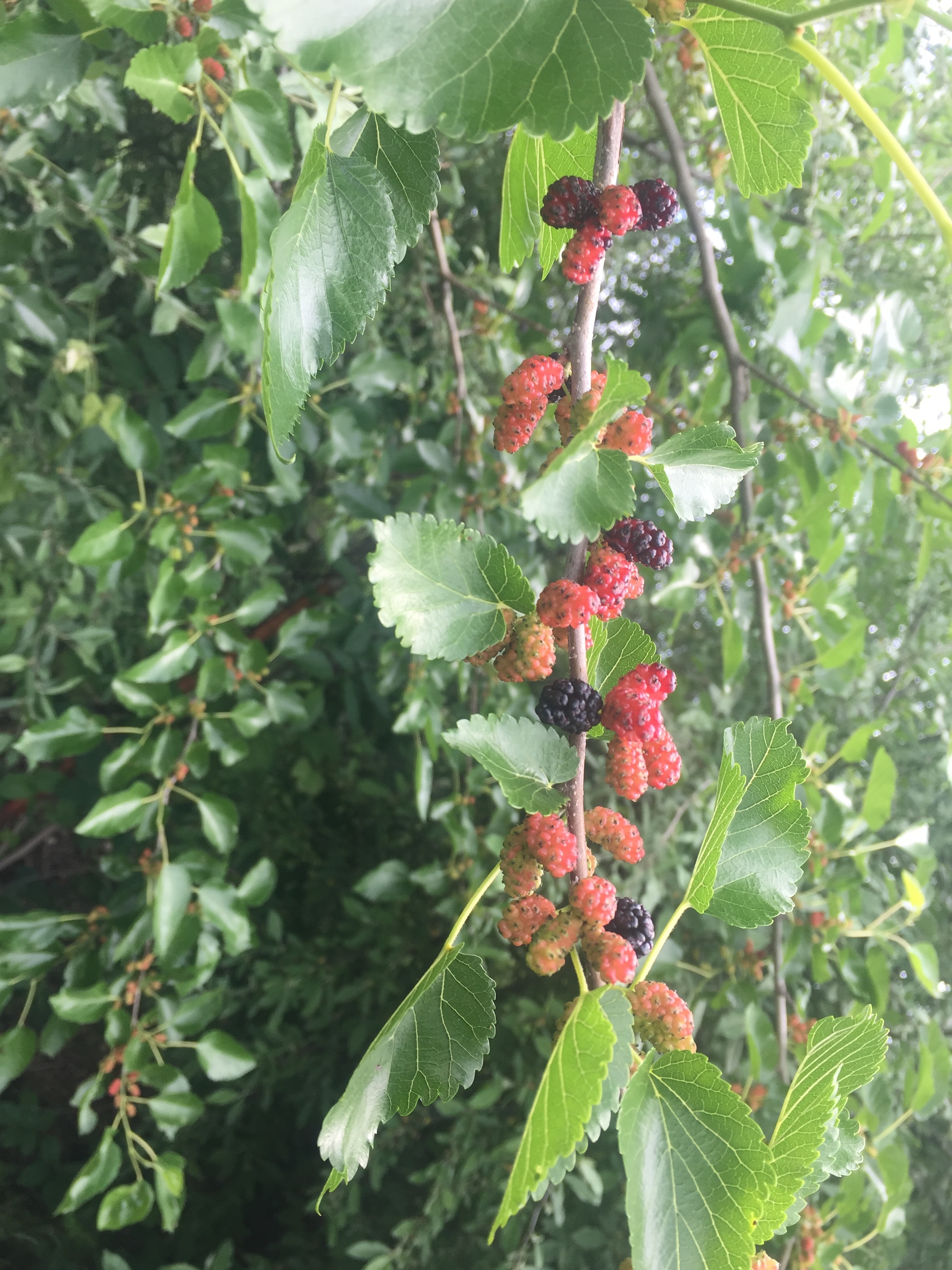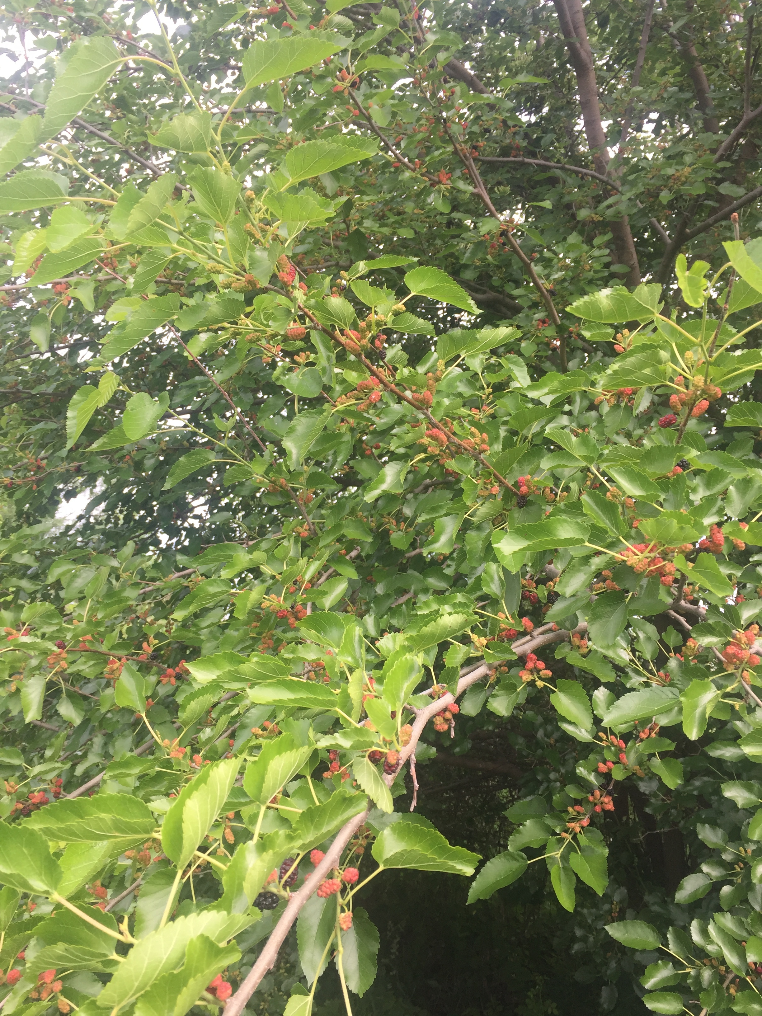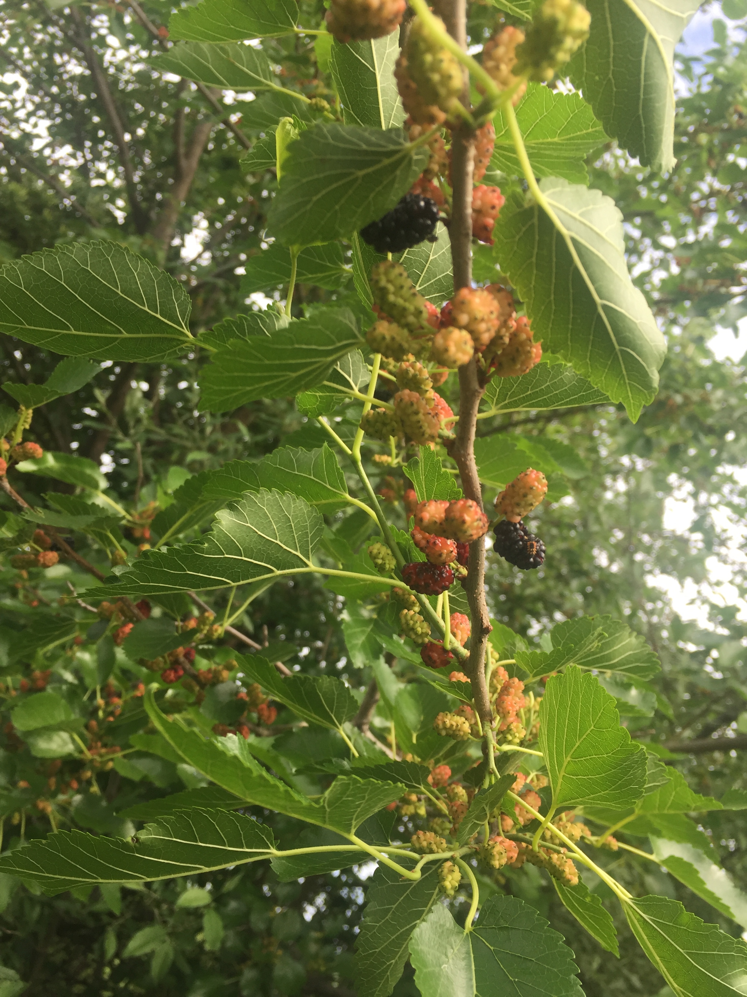 These are white mulberries. If you look at the top you can tell the tree top was killed by the last severe drought. The mulberries are later than some of my others.