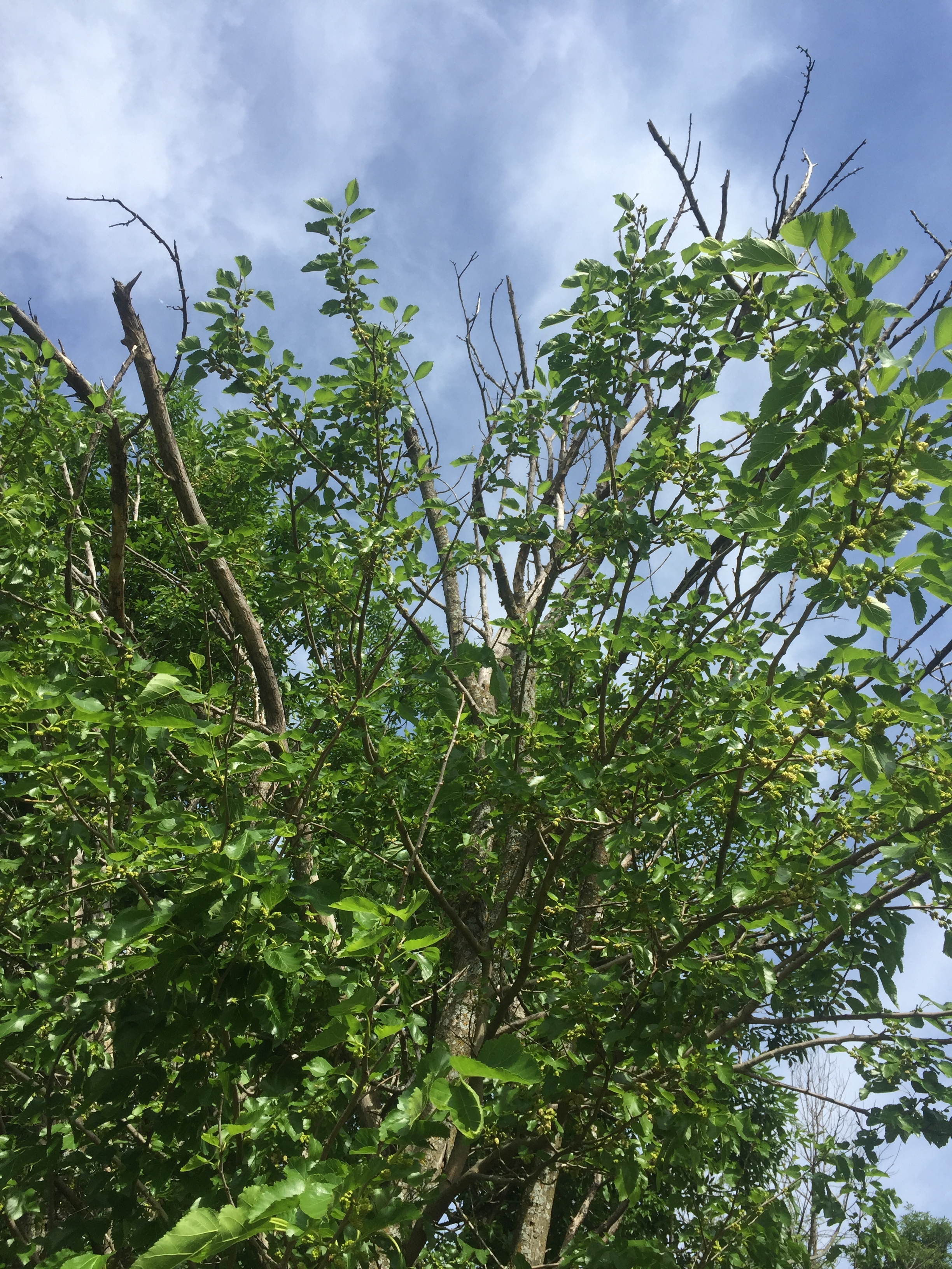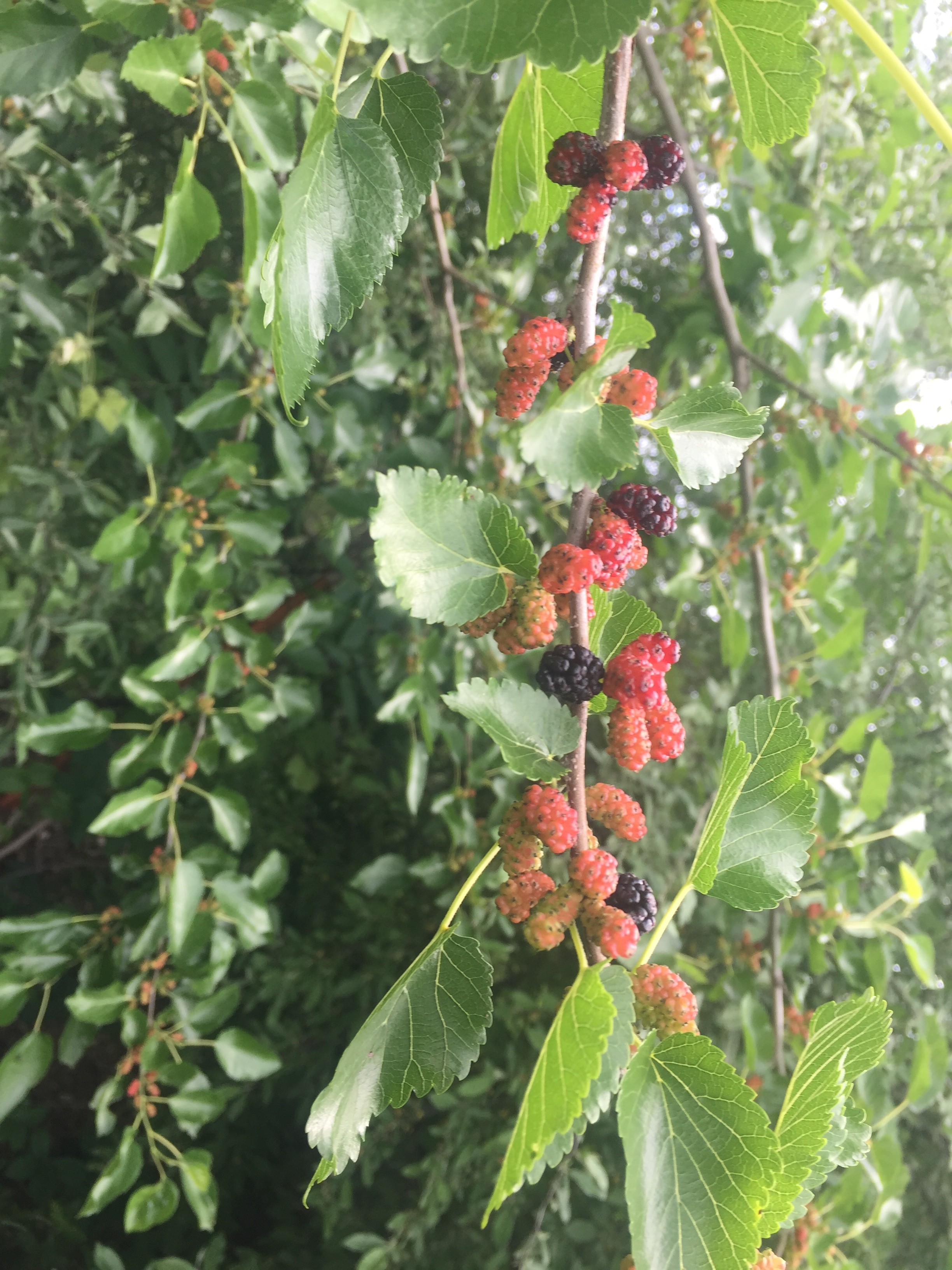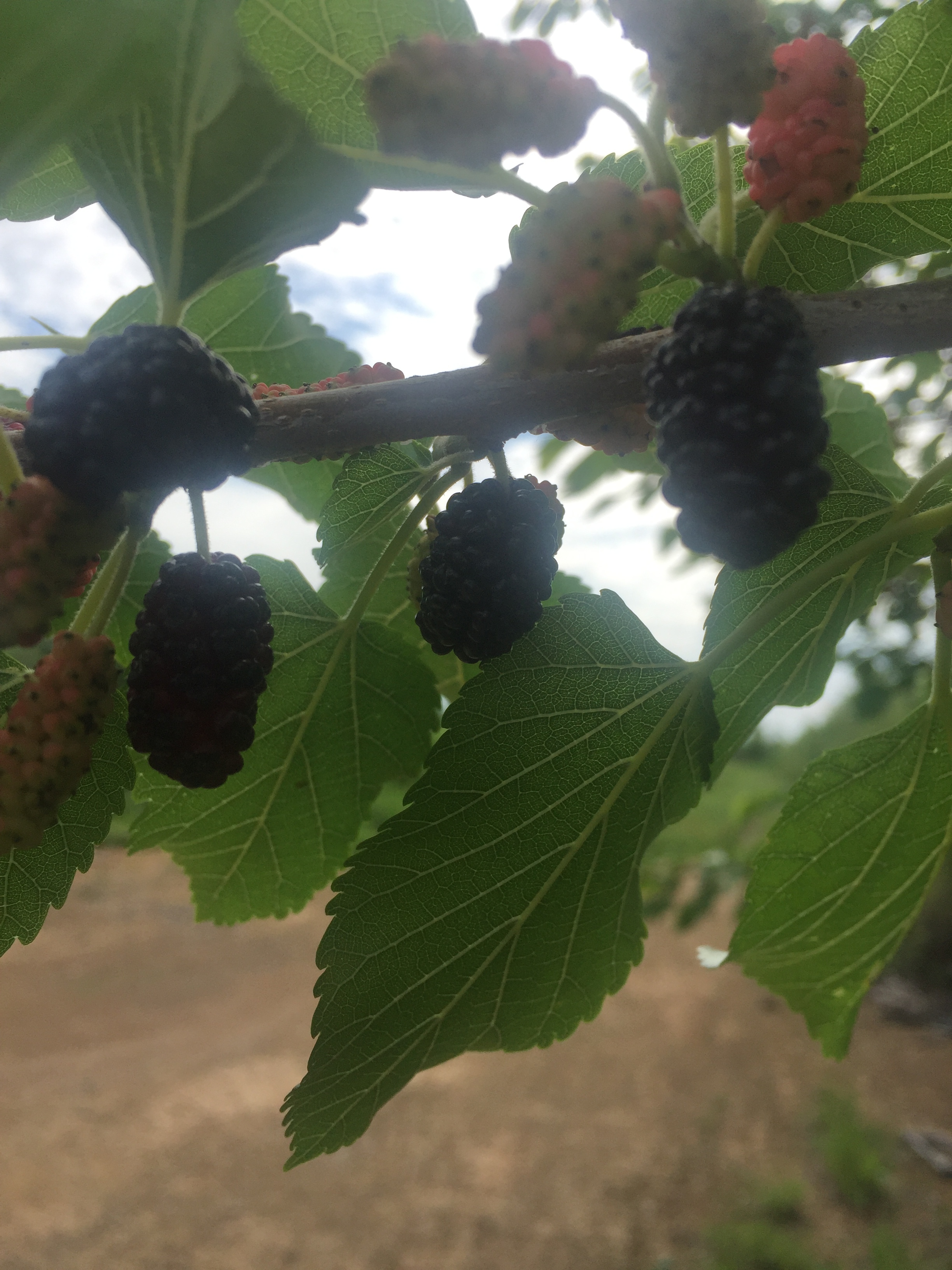 These are white mulberries. If you look at the top you can tell the tree top was killed by the last severe drought. The mulberries are later than some of my others.