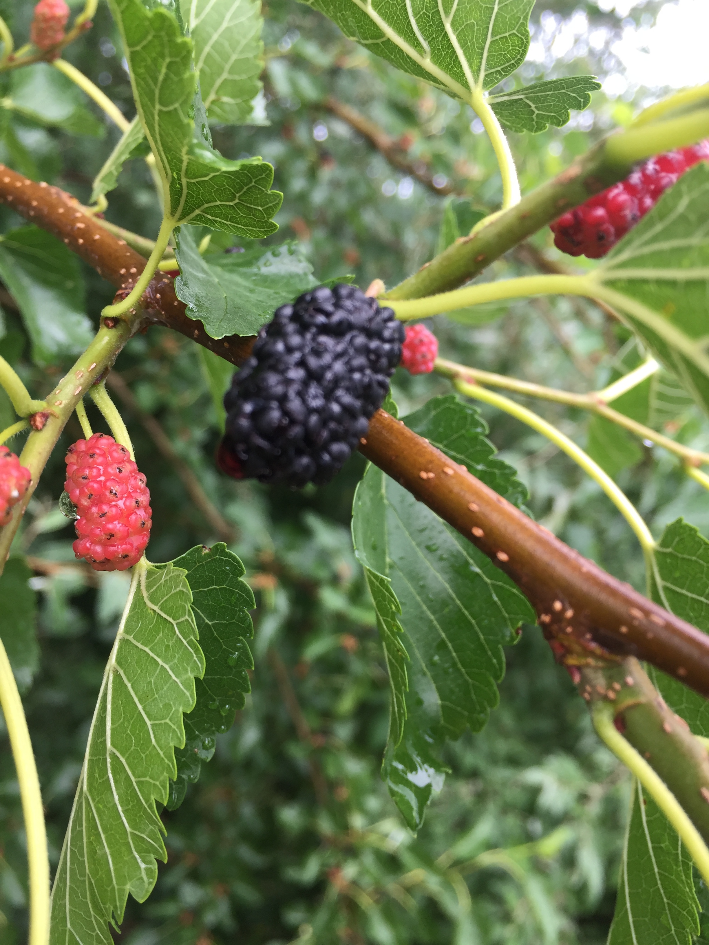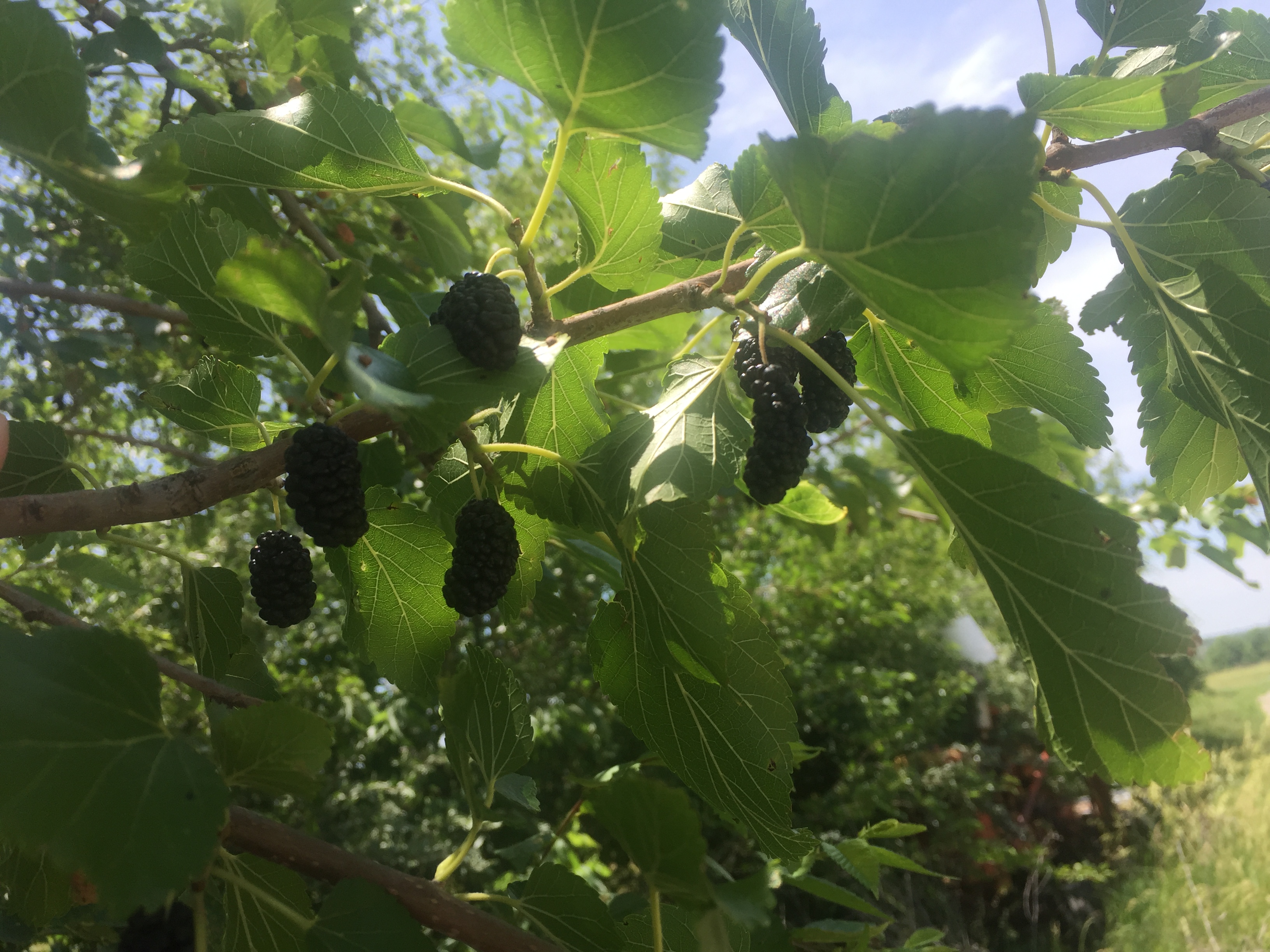 We say they’re no work, but some of my mulberries do get diseased. Nothing terrible, but if the leaves show up with spots, they tend to produce less fruit, and the fruit itself may also have a few carpels that don’t ripen. If I grew them professionally, I’d probably want to spray them with something.
