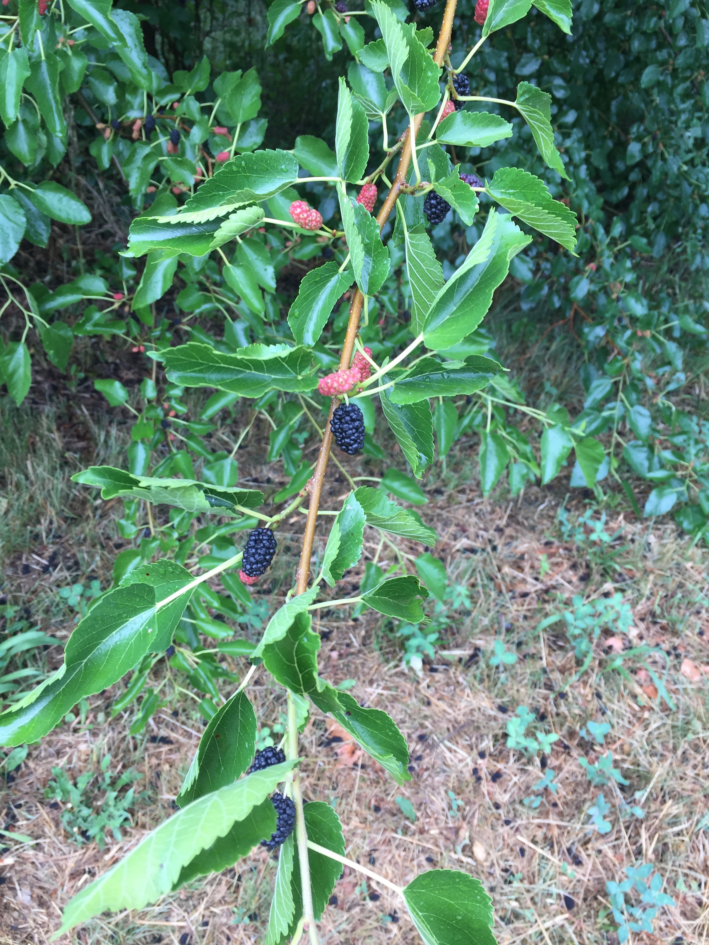 I just got back from a walk around Northeast Philly. Mulberries are ripe here and all over the sidewalks and walkways. I’m sure these are not named cultivars. I gathered several berries from three trees. There were about dime sized and not very tasty. Stained my fingers up good. I’m going to keep sampling to see if they get any sweeter.