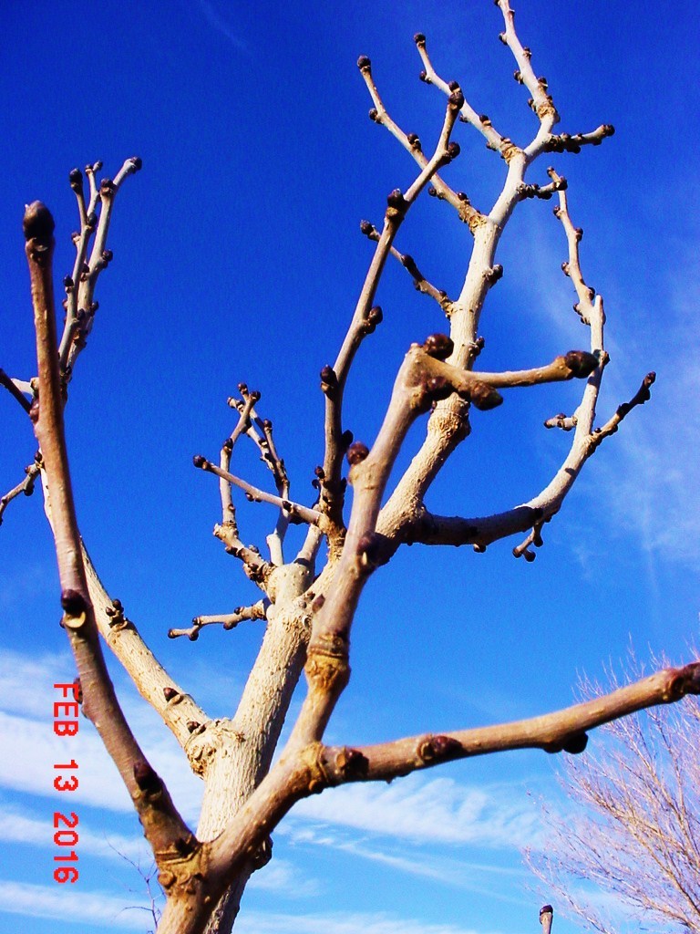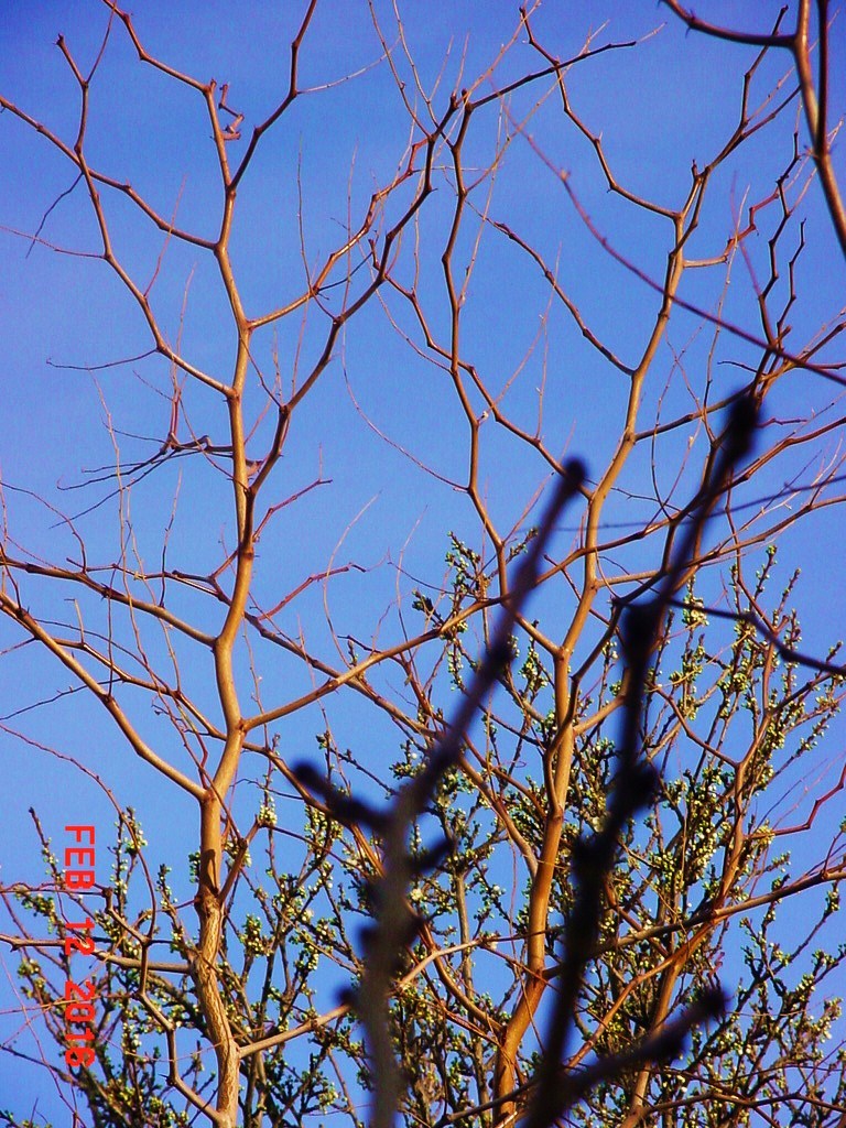 superimposed branches of black mulberry, jujube, and peach at this time of year. The still-dormant black mulberry (blurry at foreground), then dormant jujube(upright branches further back), and peach (already flowering branches farthest back)