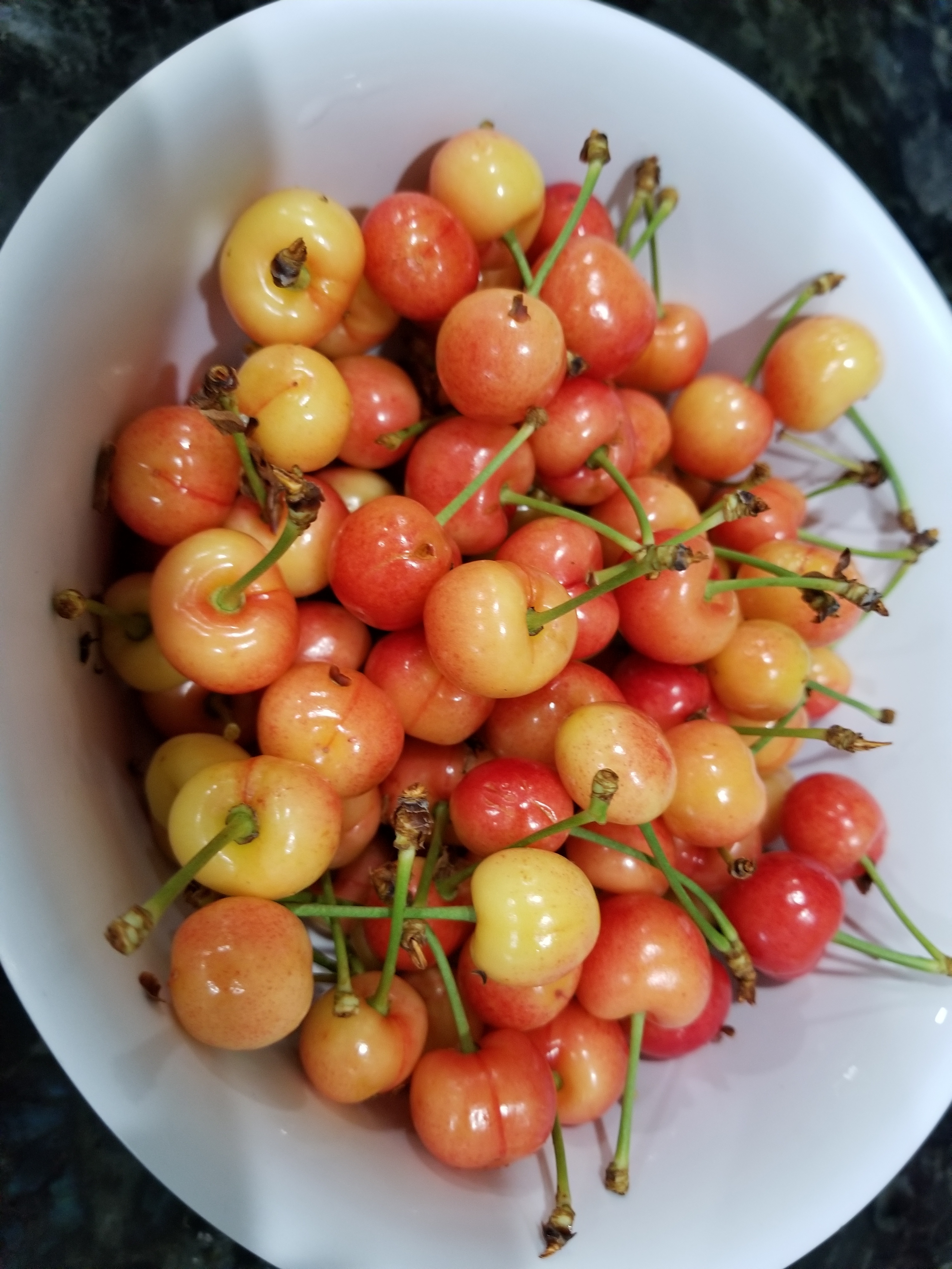 I just harvested these Rainier cherries today because the birds are going crazy over it. We had 90 plus in temperature the last 3 weeks so cherries are quite good.