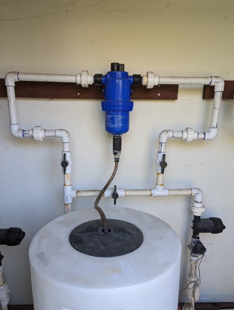 I included fertigation tanks and injectors when I built our irrigation system. I determined there are 3 basic acidity+fertilizer needs and so I have 3 separate sets of pipes in the yard each serving a different formula. I use Dosatron model D45RE15 water-pressure driven pumps to inject the formula concentrates into the pipes - which are matched to my water pressure. The water input is filtered with Rainbird irrigation basket filter QKCHK-100 to protect the system from coarse materials. Immediately upstream of each filter is a 1" master control valve so the system is not under pressure when downstream valves are not in use.