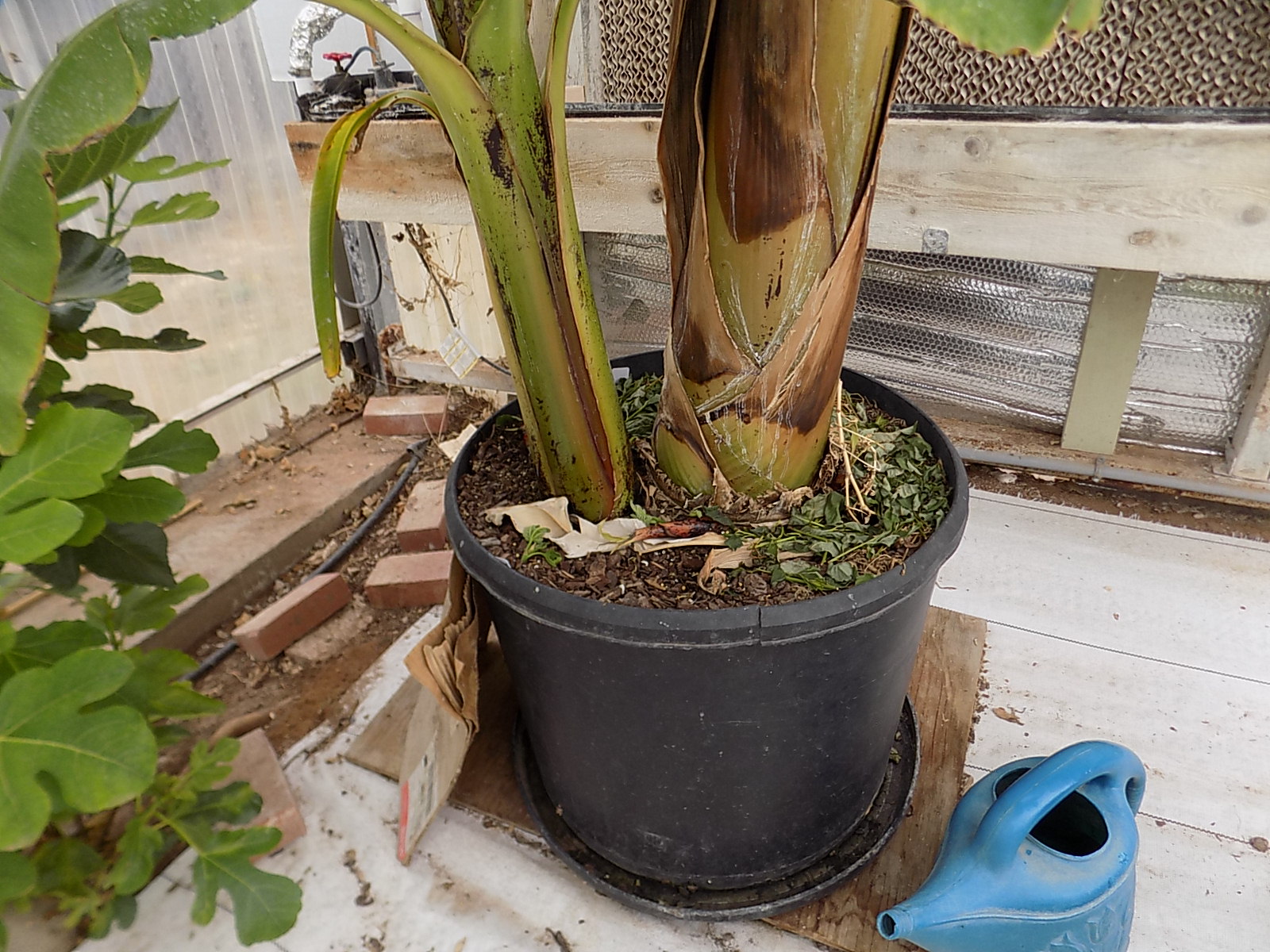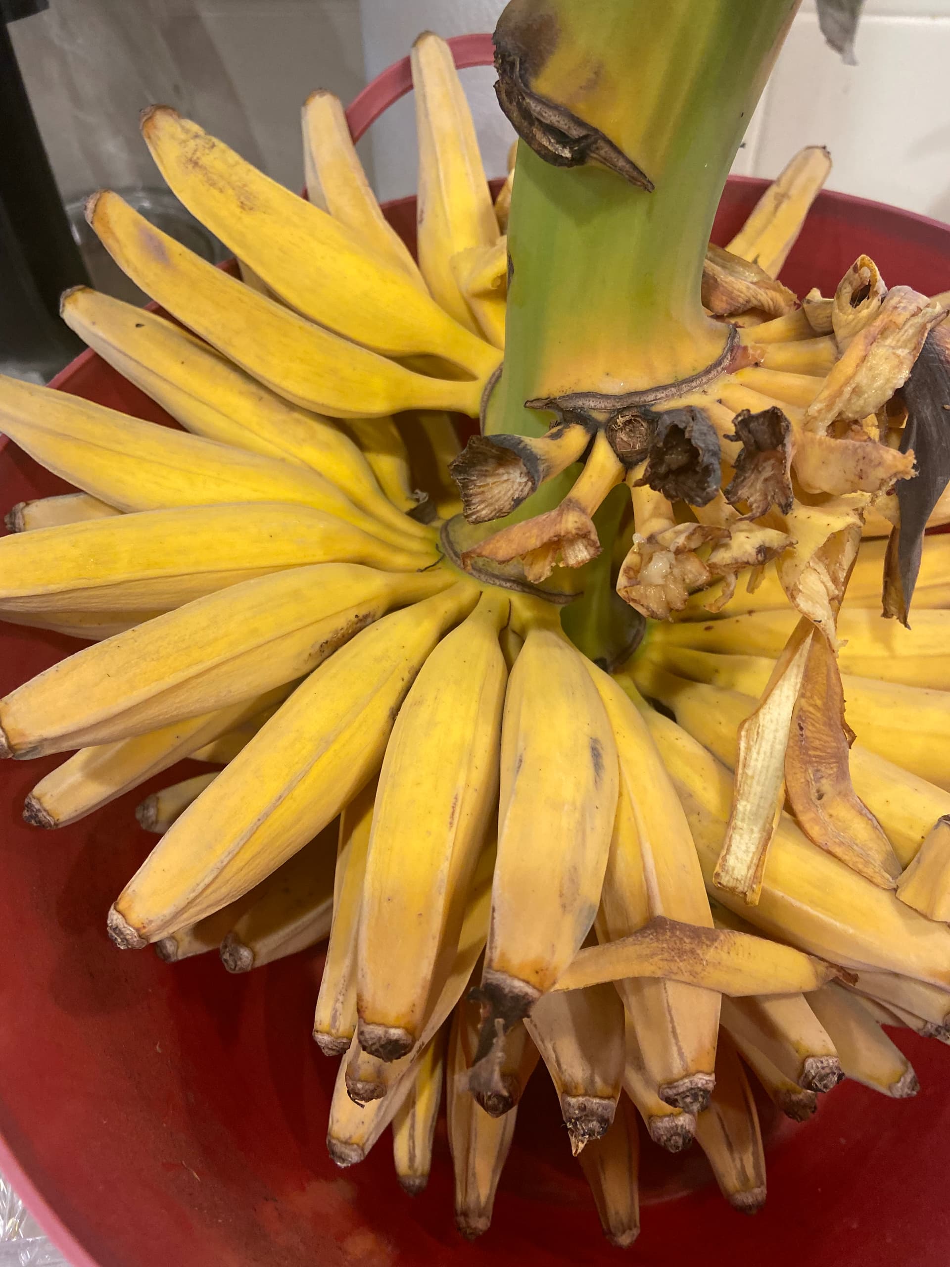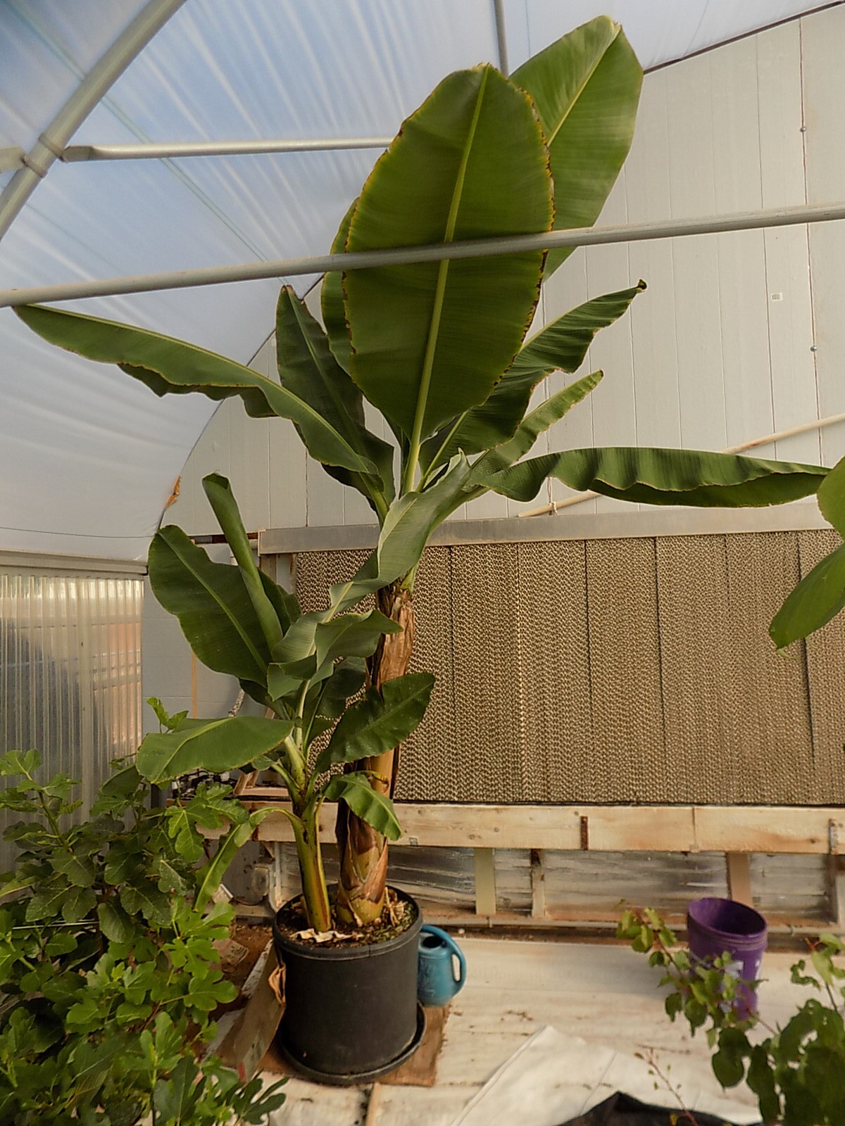 Houston garden center used to have an unfenced lot with bananas that did not sell previous seasons. I have seen banana plants in 5gal pots with growing and ripening bananas. Most were laid down but the bananas seemed fine. Been growing bananas 40 yrs and have grown namwah and dwarf namwah 10ft from each other. Dwarf fruits a lot sooner but in my yard the dwarf version was comparable to store bananas. Regular namwah was much better. Never grew the dwarf version again. Reference the pup. I would have separated it, providing more energy to the mother to produce those bananas. For me the dwarf version was not worth growing as they didnāt taste any better than grocery store stuff. I have grown other varieties but have settled on misi luki, pisang ceylon and pisang raja. All three very tasty and the smaller ones are similar to mysore but tastier in my opinion. Good luck with those bananas but if you spend the time and effort to grow bananas pick some exceptional varieties and donāt waste your time on midlevel ones. There are much better out there.