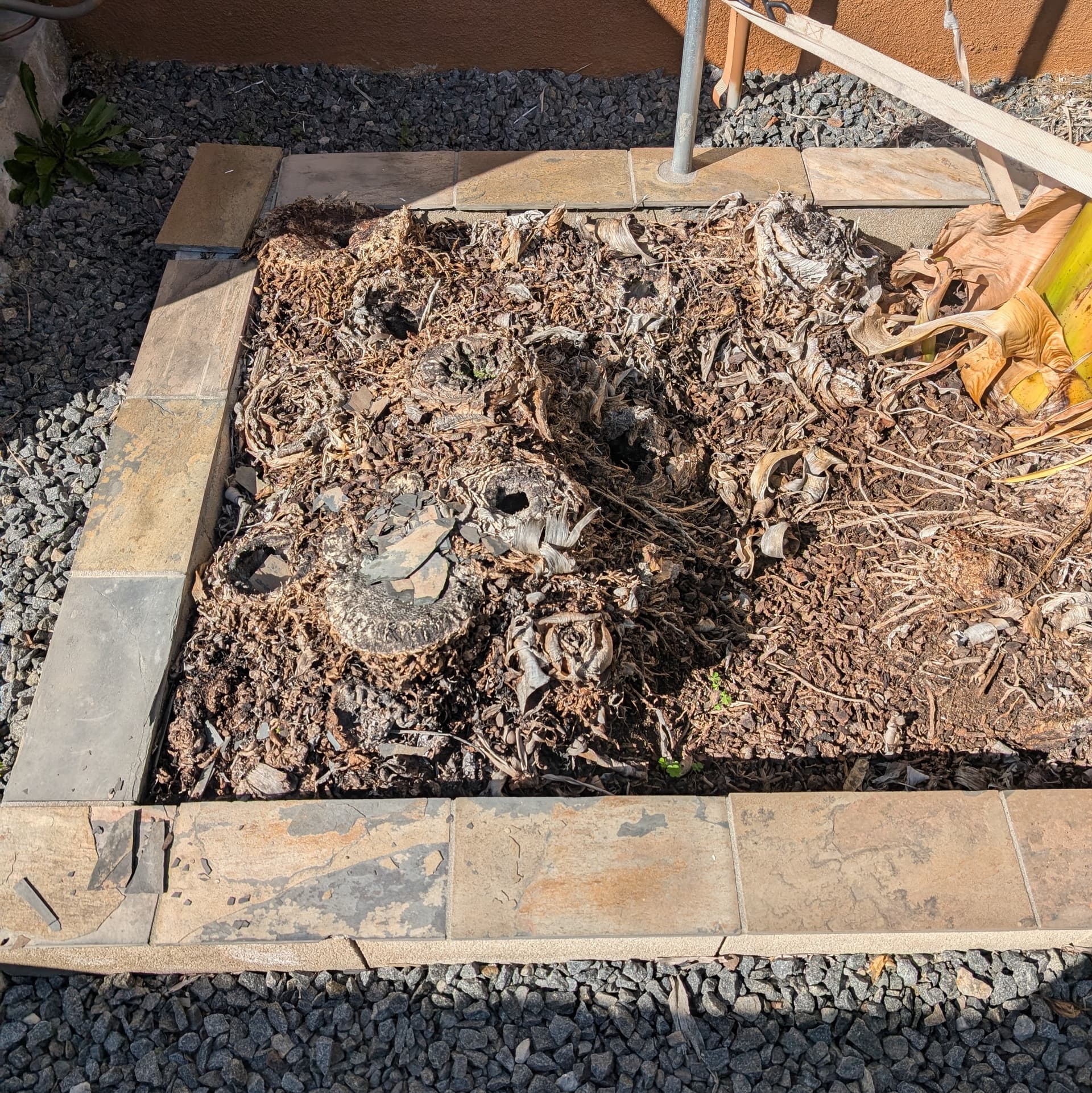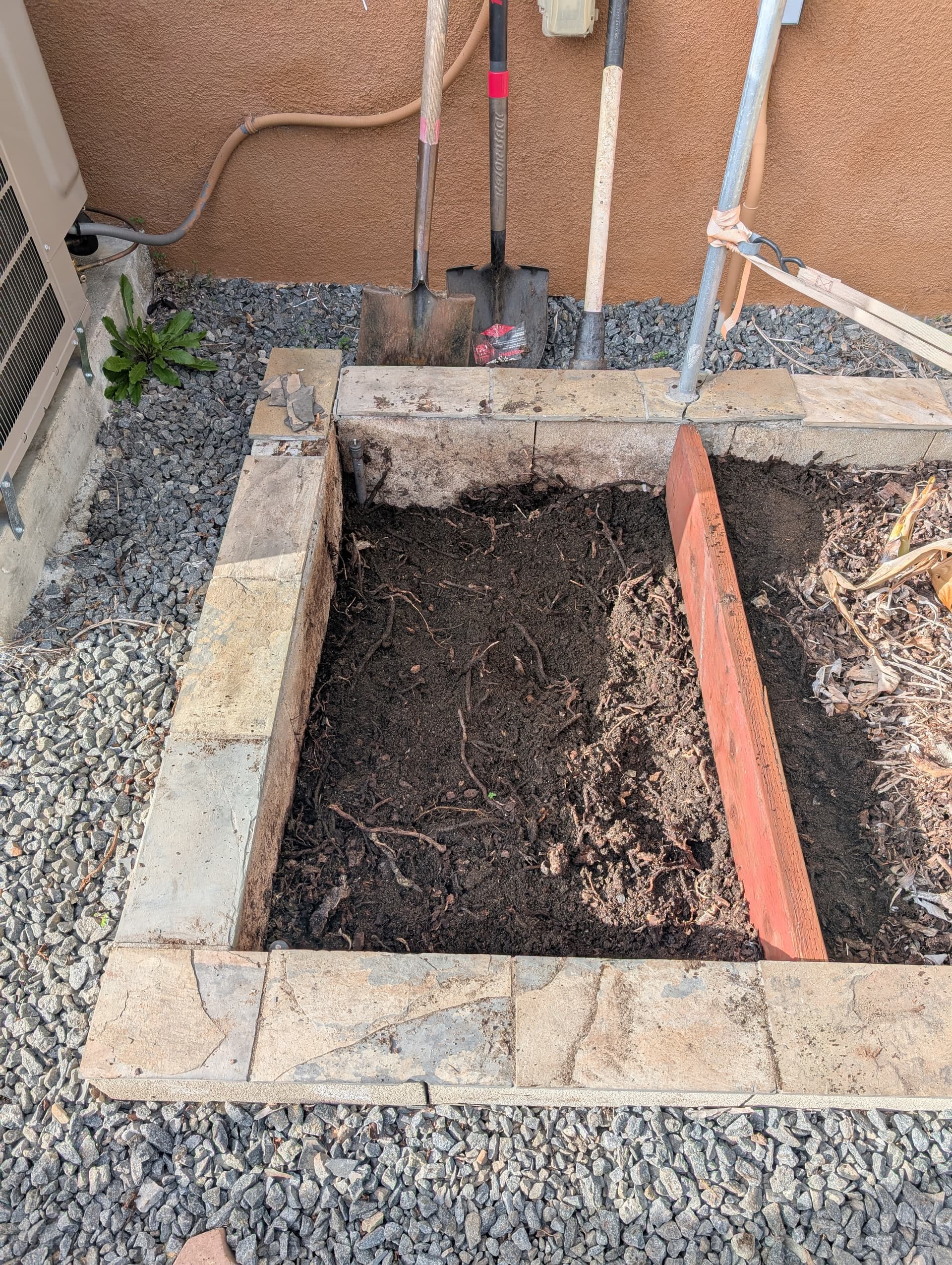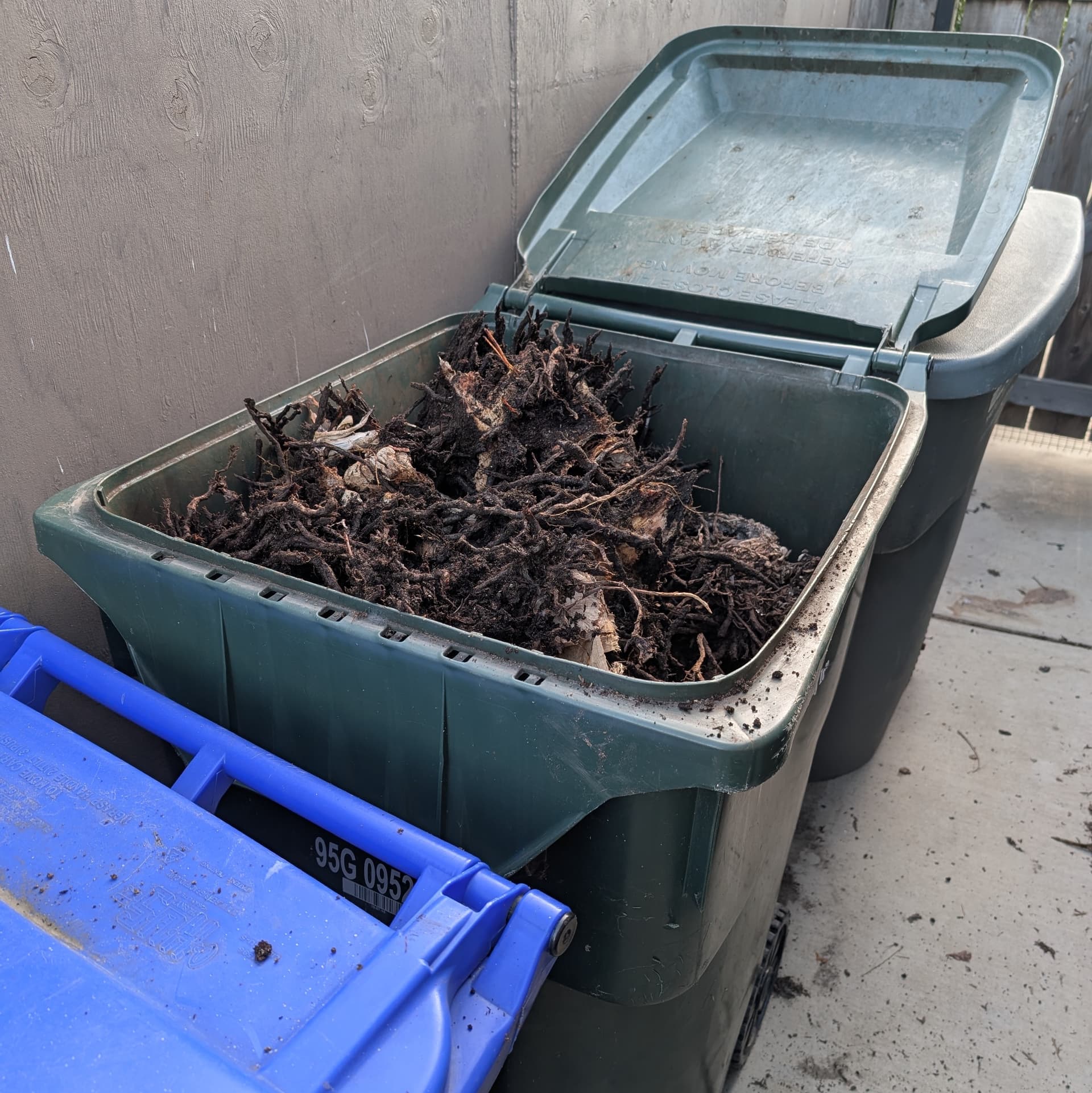 The biggest task though was removal of 3-4 years of dead corms clogging up the west end of the planter. It took a couple days and filled up an 80 gal greenery barrel.