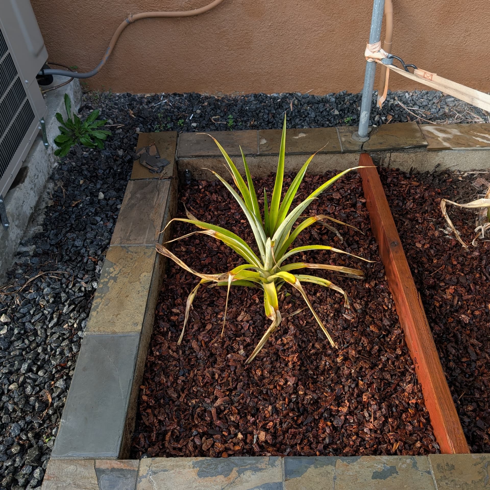 Afterwards I installed a partition in the bed, added 15 gallons of soil, and installed a white pineapple that’s been biding its time in a pot for the last two years!