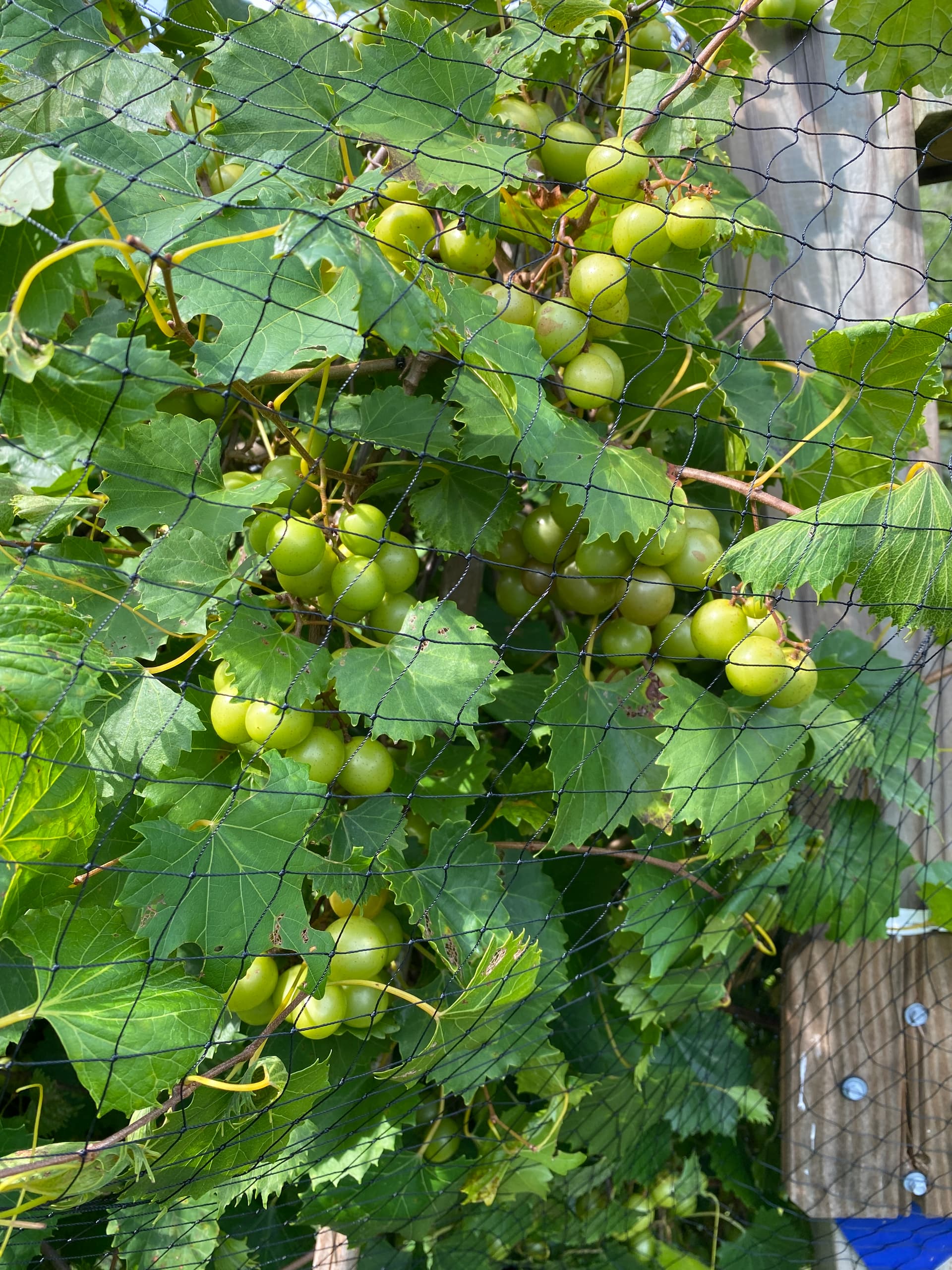 I picked 10 LBs from one plant, about half of the grapes. My Isons are also getting ripe, bearing well too. Fry a little wimpy grower for me, but also has a good crop. My Darlene is vigorous, but has just maybe 2 to 3 pounds on it.