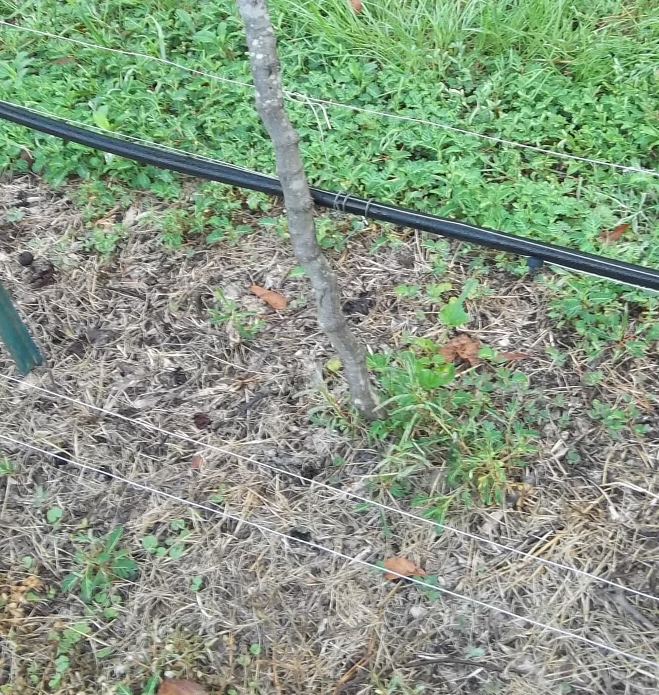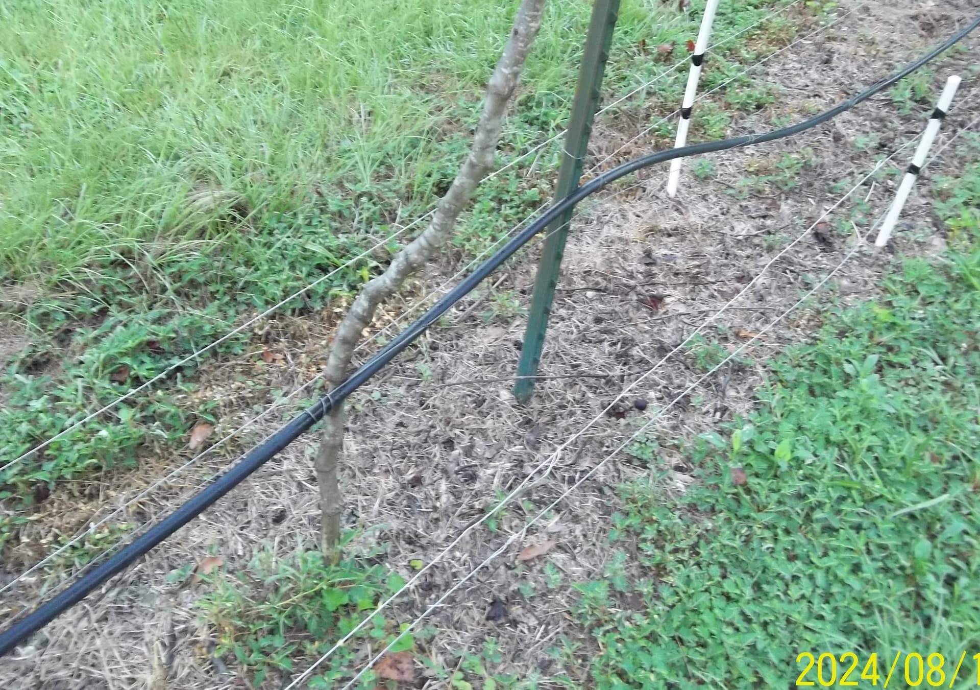 My setup is simple and low cost. I have never seen an opossum or raccoon jump upward. They will climb up low hanging vines. During ripening I trim the branches up a little. Below is a couple of pictures. I only run it at night and I start it about 2 weeks before any of the fruit are ripe and continue until the harvest is finished. Bonus is it keeps the armadillos away.