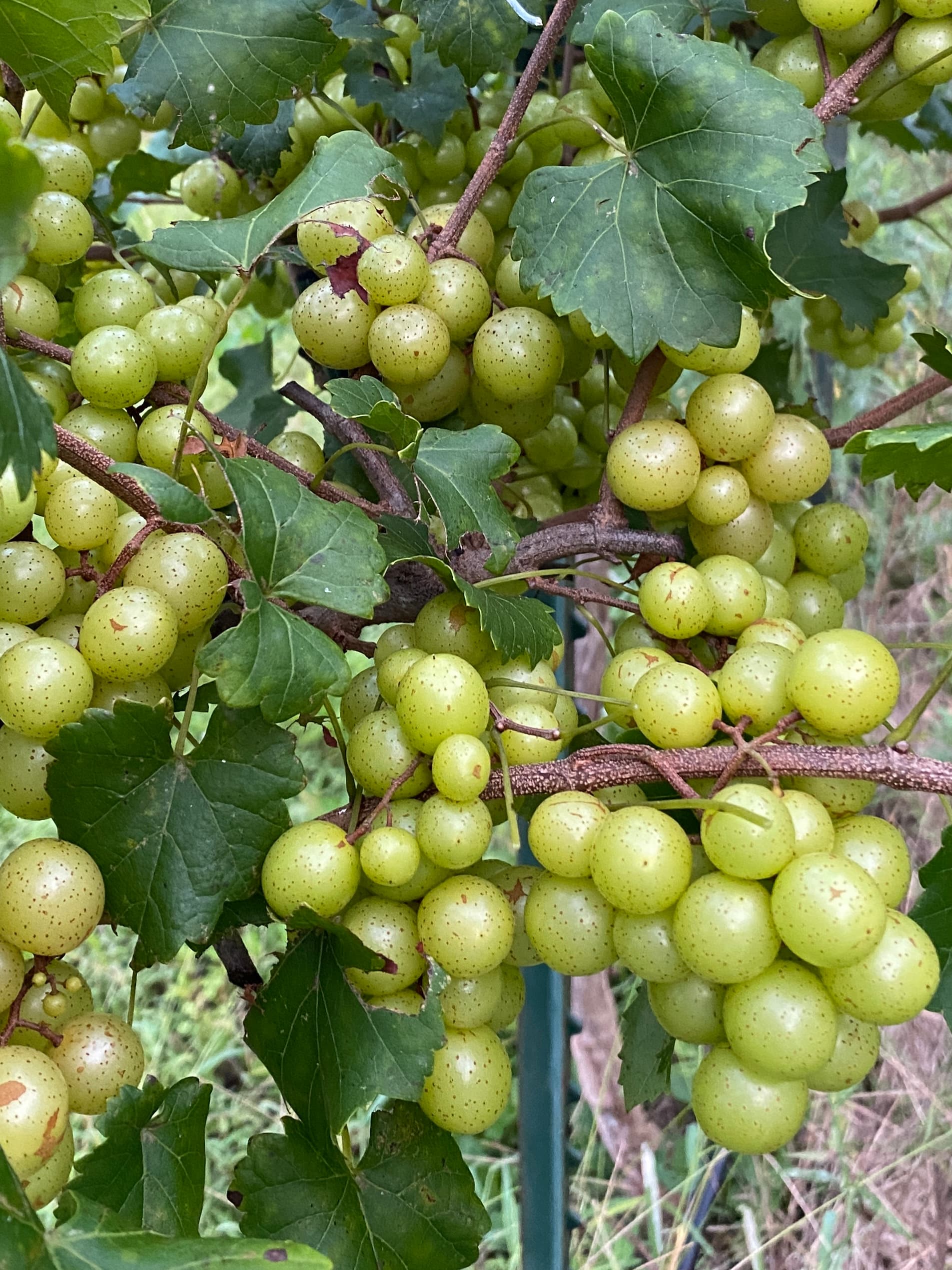 This has been an unusual summer in that It has rained enough that I haven’t had to add additional water to my muscadine vines. There have been a few short periods that I could have added water but I didn’t. I also haven’t added any fertilizer since last year (2024) when I distributed a post harvest application of 13-13-13. Normally I follow most of the growing suggestions but I wanted to see how the vines would do without any help. I think that the extra rainfall is one of the most important factors as to how vines perform. All the vines are touching the ground and loaded with fruit. The fruit of Paulk seems to be slightly smaller this year but the few that have ripened are very sweet. My Lane is loaded and as usual the leaves are showing signs of over fruiting. What I did this year is not intended to be suggestions but more of an observation. I don’t know but I think the post harvest fertilizing helps the vines get off to a good start next year. I also think that without extra rainfall the vines performance would not be so good.