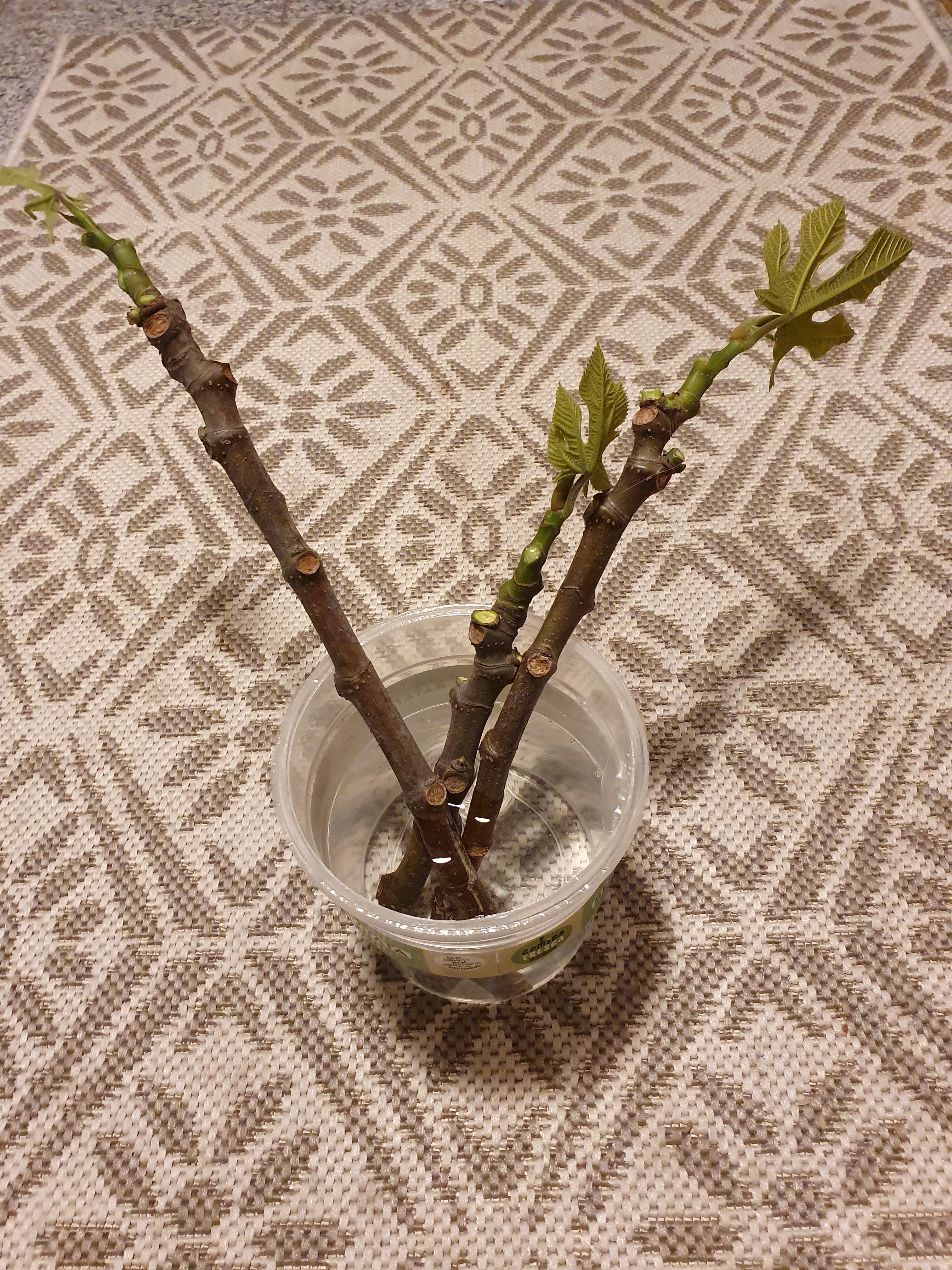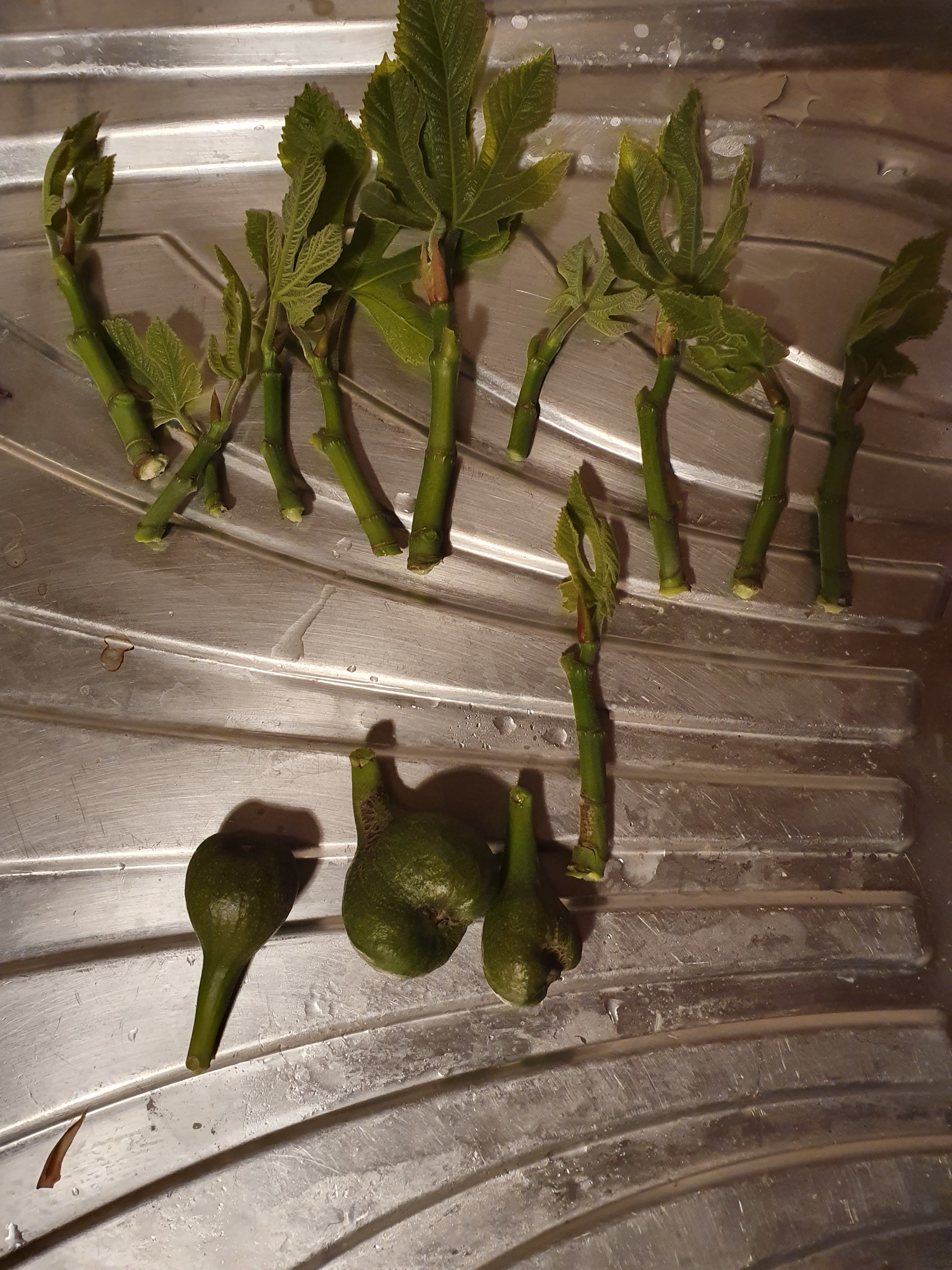 While walking the dogs (the only time i go outside… all country is in quarantine due to the coronavirus), there is a patch by a river/creek full of fig trees, they all are random seedlings that some birds must have planted there… while most of them present no fruit, just a very beautiful lush green foliage, there is one small tree thats loaaaded with fig fruitlets. I decided to take some cuttings of that tree to try and root. No idea how the mature fruits will look like or taste but as the tree looks so prolífic and so early in the year i decided to root some clones and wait for the end result.