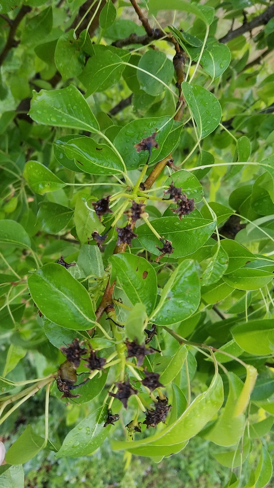 Now we are on year 3 after spray, and these trees clearly are not recovered and probably should just be cut down. This year’s leaves look completely normal, and the growth on the limbs is much more normal- it is straight and there is more of it. But it’s still a little spindly. But the problem is fruit production- or lack of. In spite of what I just said, I think I did get maybe 1-2 bloom clusters last year on each tree (8 ft tall, 4 years old last year) but they didn’t set fruit. This year isn’t much better. I did get maybe 4-5 bloom clusters on each tree. But think about how few that is for a 8 ft, 4 year old tree. This year, I got maybe 7-10 clusters of blooms on each tree. That is still a VERY low number of blooms for 5 year old trees that are 9-10 feet tall now. But the frustrating part is that they just turn black and fall off right after they bloom. I guess it is possible that could be fire blight, but other pear trees I have don’t do this. I’ve attached a photo of what happened to every single bloom on every one of the 4 pear trees that got sprayed. I’d love to hear if anyone thinks that what is shown in the photos is caused by fire blight or something other than the 2, 4-D exposure, but since its only happening to the exposed trees, I strongly think that is the problem. I’m going to leave these trees in the orchard another year or two as a research project, but I’m pretty sure they are ruined forever.