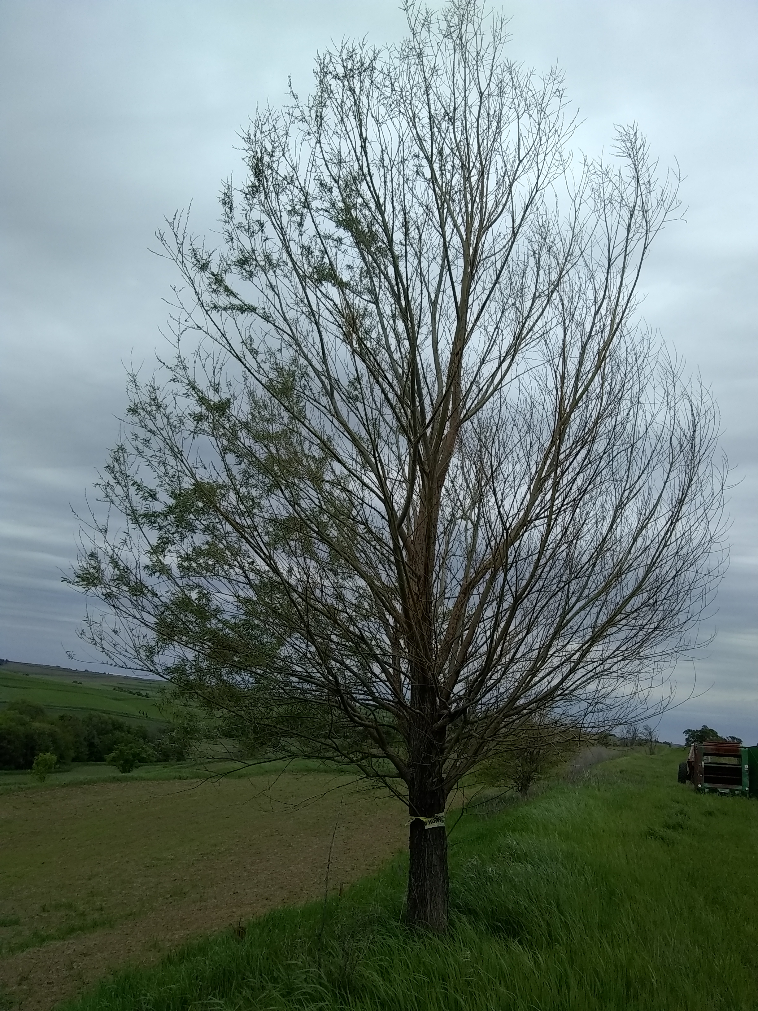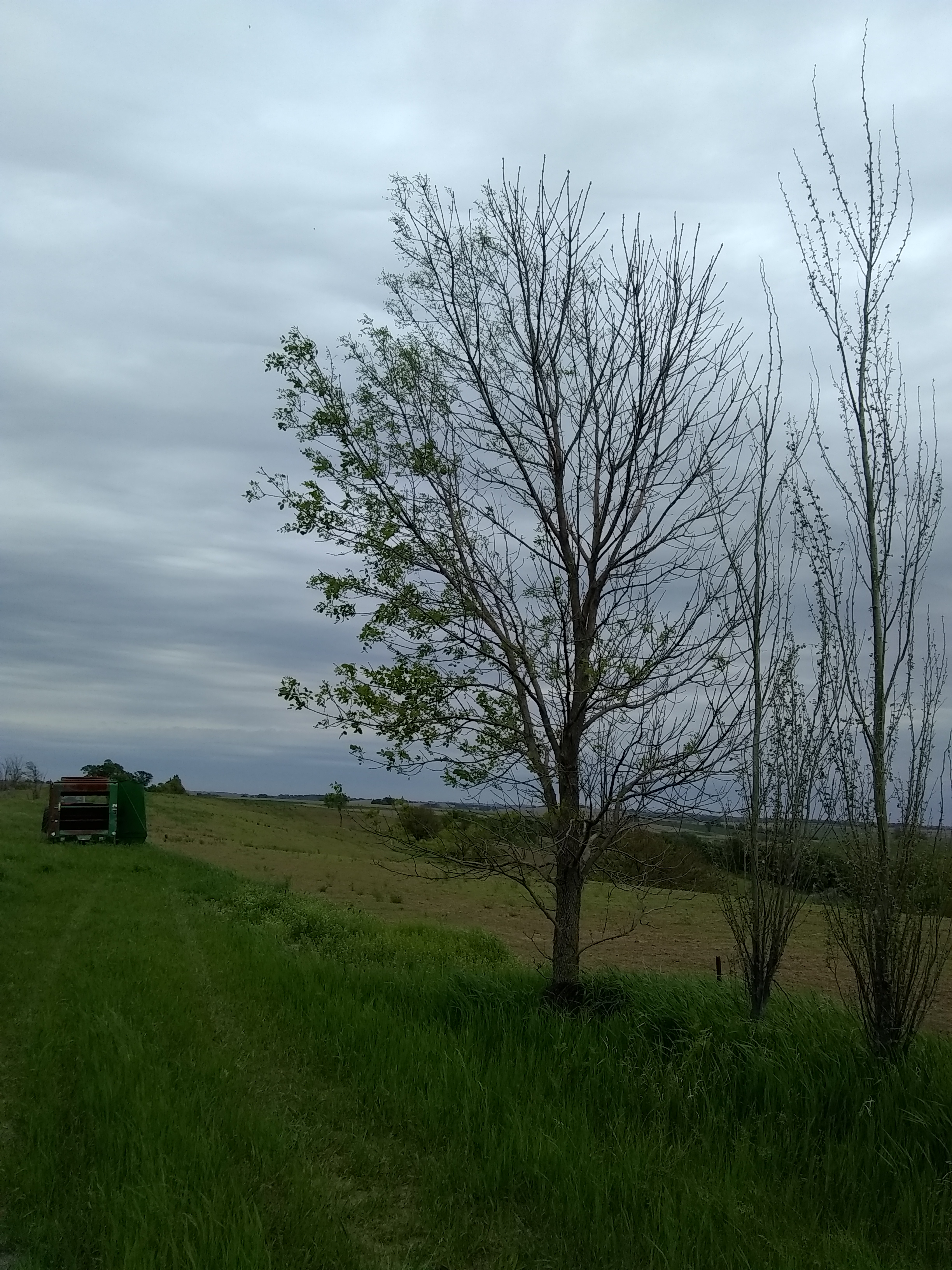 Here are some pics, I did have the co-op come out today and they confirmed that it was 2,4d drift by an airplane. They said they have seen this happen before and the trees leaf out fine again, so were not worried about it.
