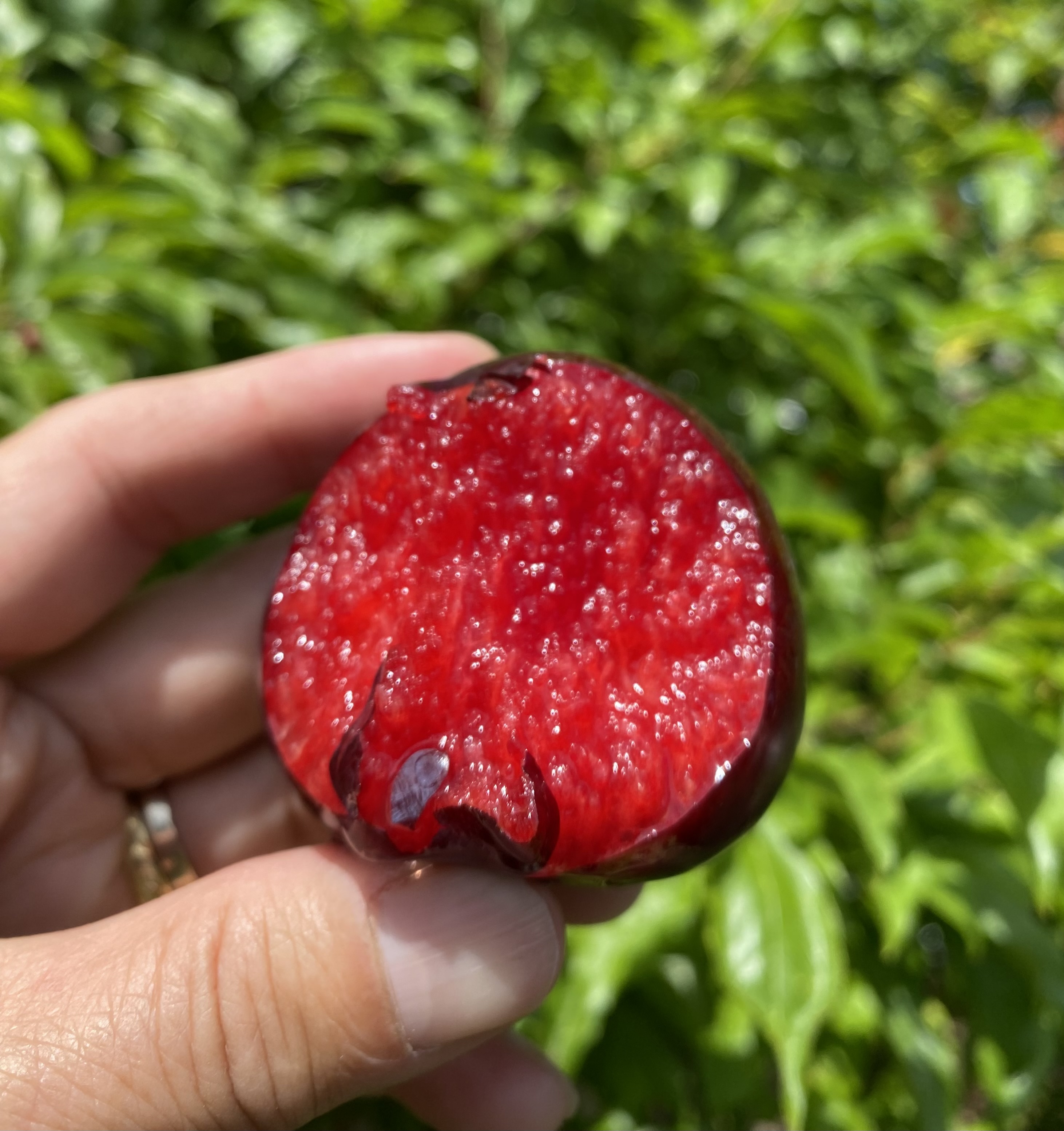 I don’t have many pictures of cut fruit, because unlike my other fruits, I trust it not to have surprises inside if the skin is unblemished. So I eat them out of hand uncut. I eat 60% of the flesh in a few bites, then bite out the pit and spit it on the ground, then pop the remaining 40% in my mouth.