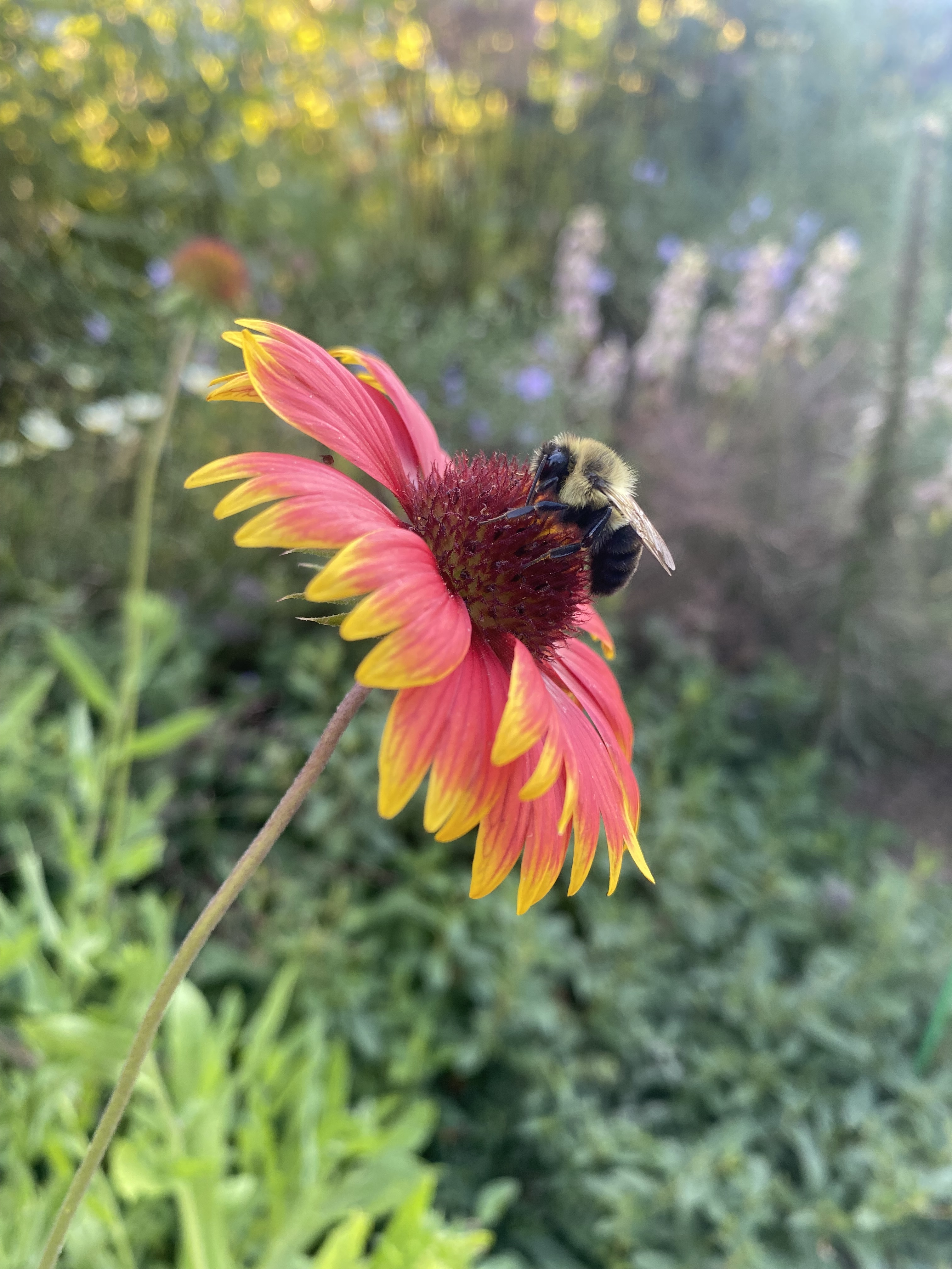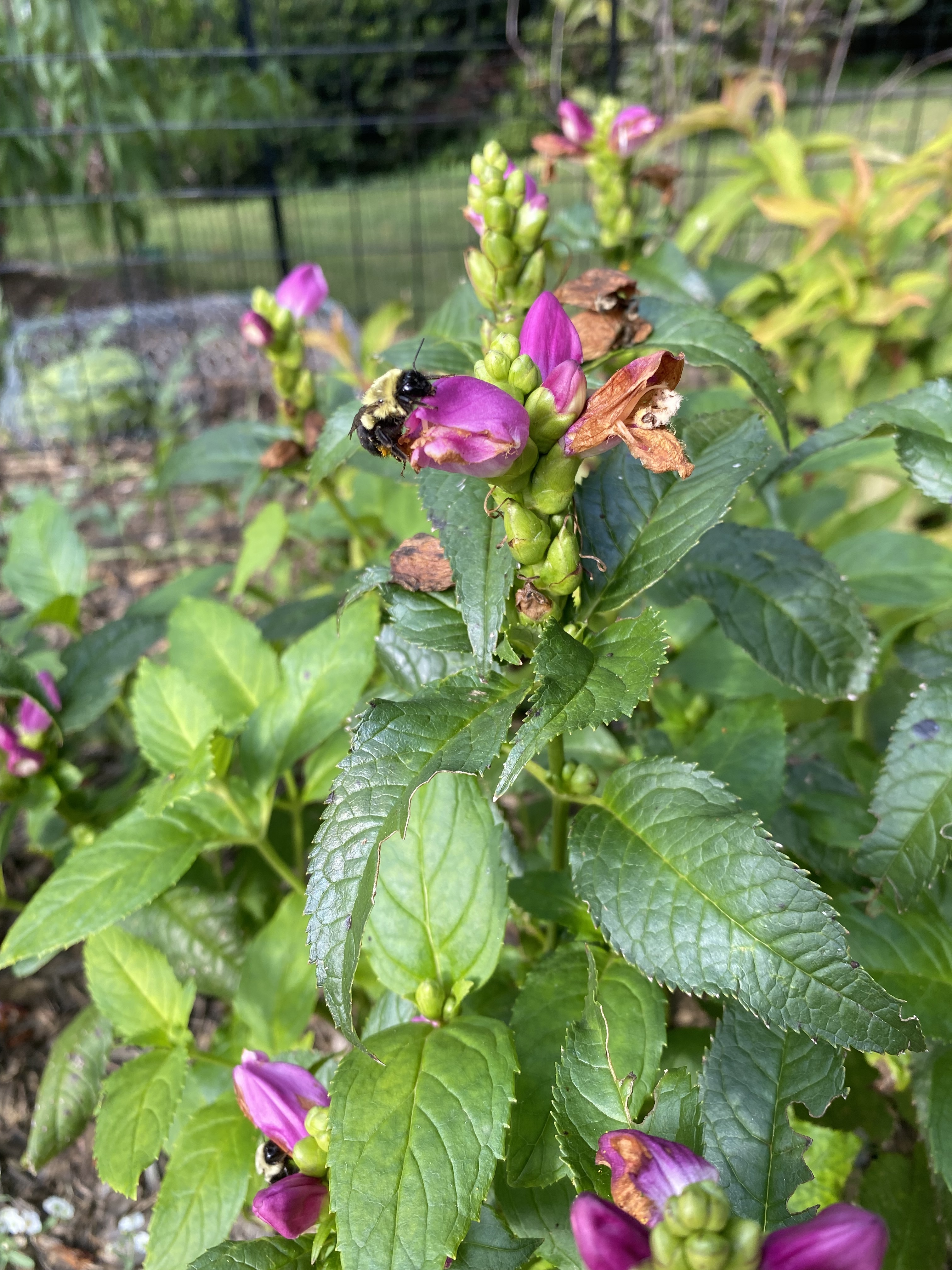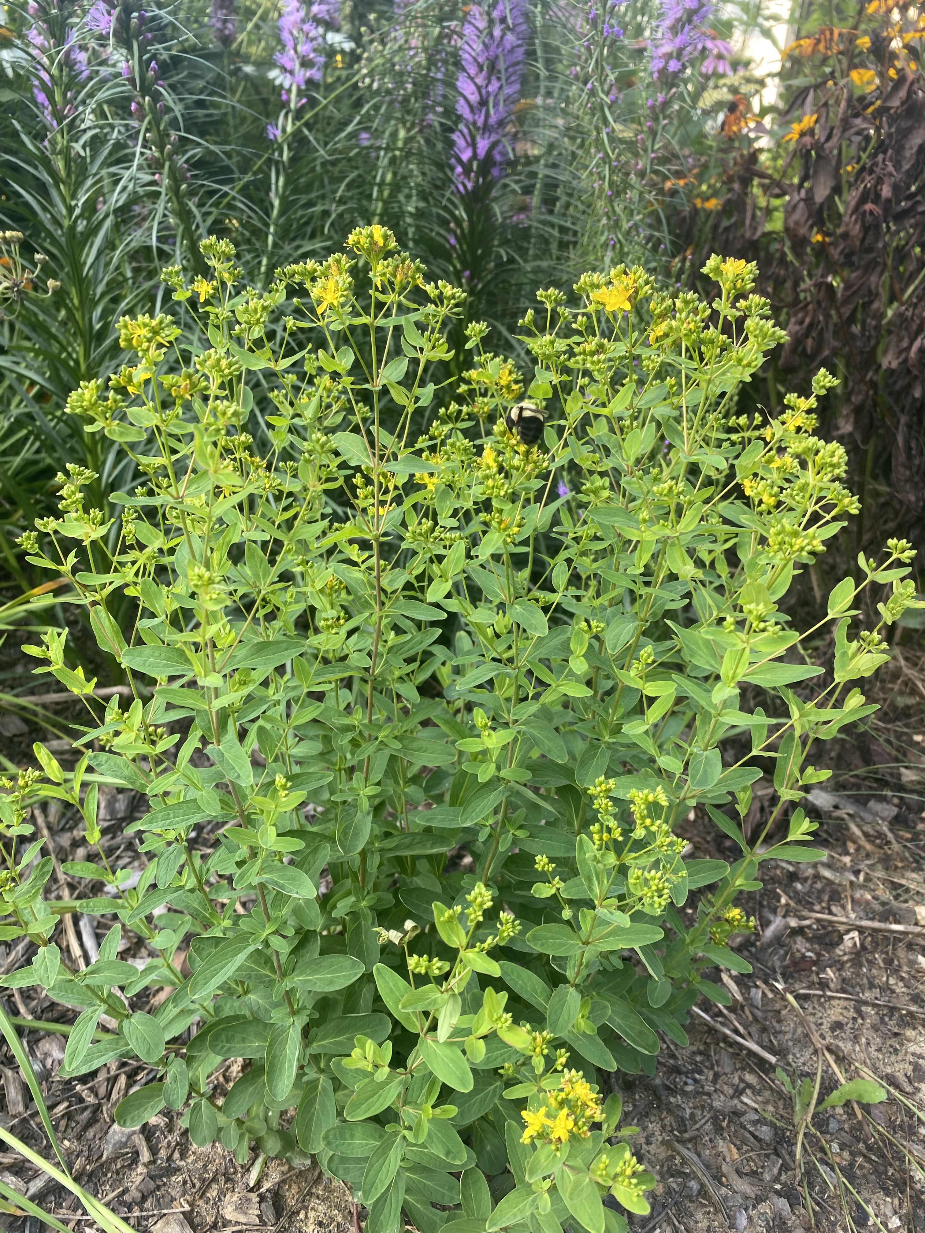 My baby hypericum with a bee this morning. It’s “shrubby”, I think that’s H prolificum. Planted tiny this spring and starting to bloom. I planted one two years ago that had transplant shock or something and died 2 weeks after planting. Nice to see this one happy and blooming. (Nevermind the super black/diseased rudbeckia in the back right of the picture…that patch hated the daily rain. But, that stuff is so weedy, I expect it to fully recover next year. If not, I’ll just transplant some of the million volunteer seedlings…)