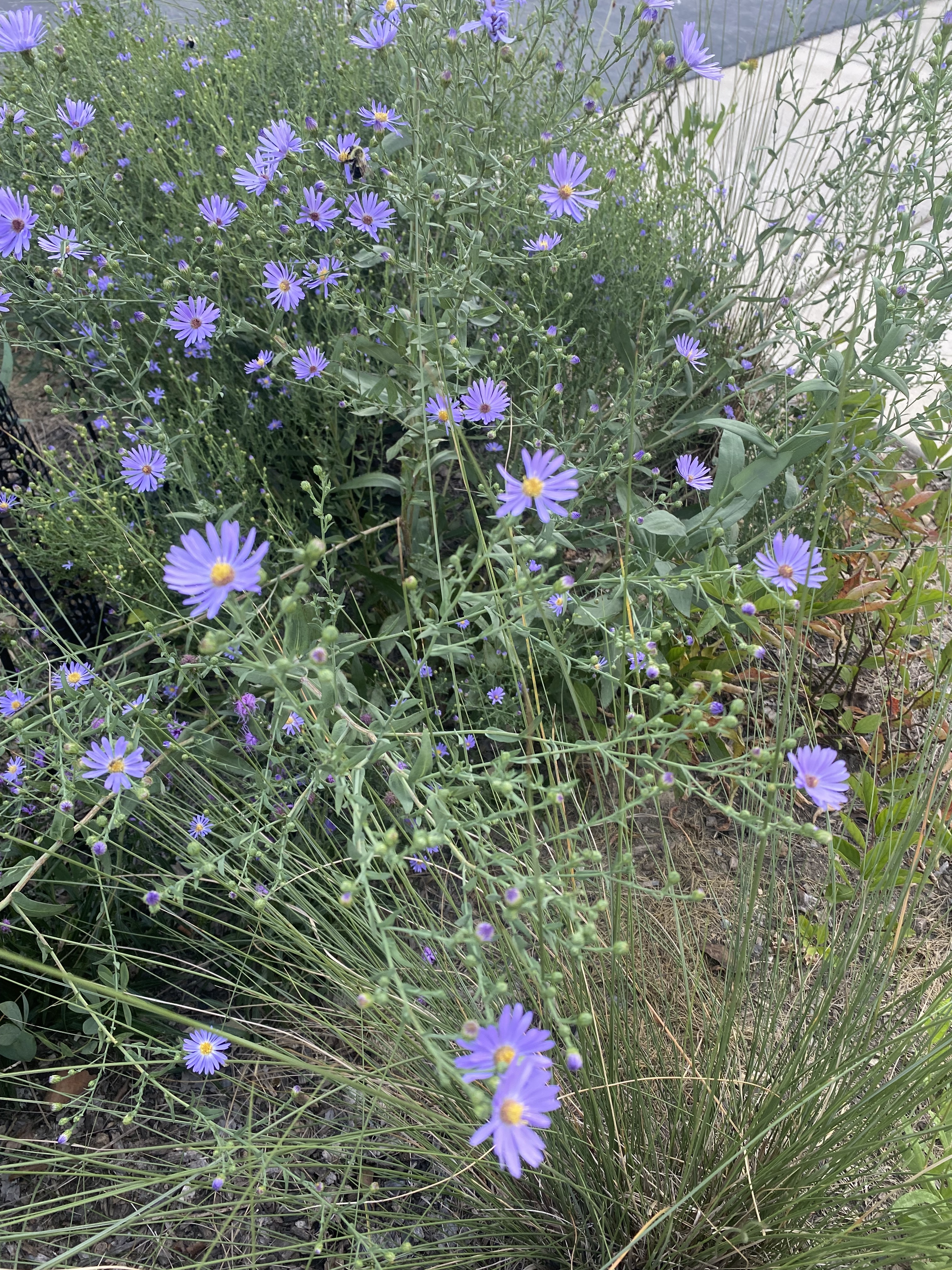 Smooth aster blooming. Two plants here that were deer pruned early summer. One better than the other (the one that is shorter, substantially denser and not yet opening). I have a few smooth aster elsewhere that I only pruned a foot off of in mid June: they’re towering and floppy. I’ll hard prune them all next year like a deer in June.